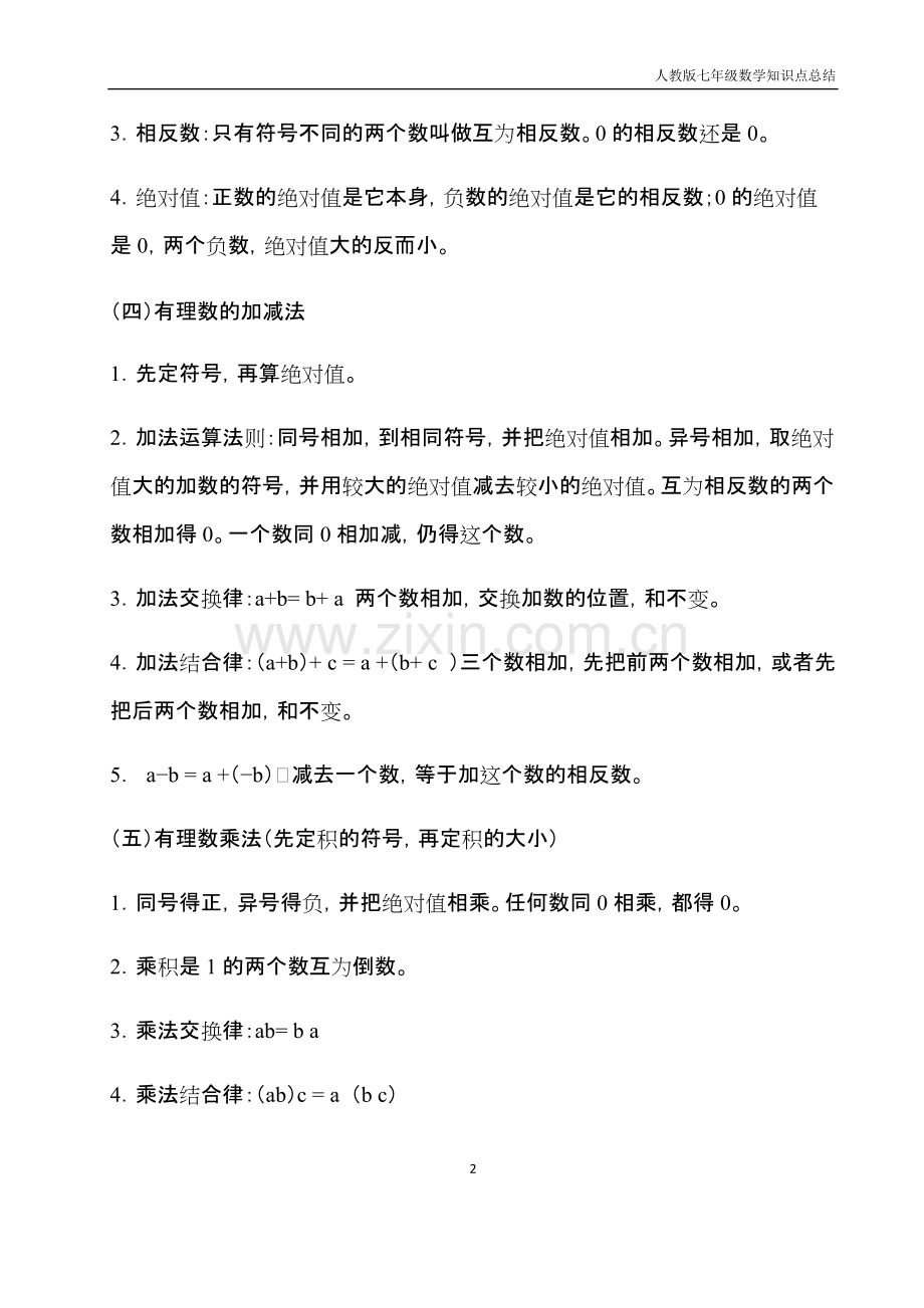 人教版七年级数学知识点总结1第一章第一章有理数有理数 正负数1正数:大于 0 的数。2负数:小于 0 的数。30 即不是正数也不是负数。4正数大于 0,负数小于 0,正数大于负数。(二)有理数1有理数:由整数和分数组成的数。包括:正整数、0、负整数,正分数、负分数。可以写成两个整之比的形式。(无理数是不能写成两个整数之比的形式,它写成小数形式,小数点后的数字是无限不循环的。如:)2整数:正整数、0、负整数,统称整数。3分数:正分数、负分数。(三)数轴1数轴:用直线上的点表示数,这条直线叫做数轴。(画一条直线,在直线上任取一点表示数 0,这个零点叫做原点,规定直线上从原点向右或向上为正方向;选取适当的长度为单位长度,以便在数轴上取点。)2数轴的三要素:原点、正方向、单位长度。人教版七年级数学知识点总结23相反数:只有符号不同的两个数叫做互为相反数。0 的相反数还是 0。4绝对值:正数的绝对值是它本身,负数的绝对值是它的相反数;0 的绝对值是 0,两个负数,绝对值大的反而小。(四)有理数的加减法1先定符号,再算绝对值。2加法运算法则:同号相加,到相同符号,并把绝对值相加。异号相加,取绝对值大的加数的符号,并用较大的绝对值减去较小的绝对值。互为相反数的两个数相加得 0。一个数同 0 相加减,仍得这个数。3加法交换律:a+b=b+a 两个数相加,交换加数的位置,和不变。4加法结合律:(a+b)+c=a+(b+c)三个数相加,先把前两个数相加,或者先把后两个数相加,和不变。5 ab=a+(b)减去一个数,等于加这个数的相反数。(五)有理数乘法(先定积的符号,再定积的大小)1同号得正,异号得负,并把绝对值相乘。任何数同 0 相乘,都得 0。2乘积是 1 的两个数互为倒数。3乘法交换律:ab=b a4乘法结合律:(ab)c=a(b c)人教版七年级数学知识点总结35乘法分配律:a(b+c)=a b+ac(六)有理数除法1先将除法化成乘法,然后定符号,最后求结果。2除以一个不等于 0 的数,等于乘这个数的倒数。3两数相除,同号得正,异号得负,并把绝对值相除,0 除以任何一个不等于0 的数,都得 0。(七)乘方1求 n 个相同因数的积的运算,叫做乘方。写作 an。(乘方的结果叫幂,a 叫底数,n 叫指数)2负数的奇数次幂是负数,负数的偶次幂是正数;0 的任何正整数次幂都是0。3同底数幂相乘,底不变,指数相加。4同底数幂相除,底不变,指数相减。(八)有理数的加减乘除混合运算法则1先乘方,再乘除,最后加减。2同级运算,从左到右进行。3如有括号,先做括号内的运算,按小括号、中括号、大括号依次进行。人教版七年级数学知识点总结4(九)科学记数法、近似数、有效数字。第二章第二章整式整式(一)整式 1整式:单项式和多项式的统称叫整式。2单项式:数与字母的乘积组成的式子叫单项式。单独的一个数或一个字母也是单项式。3系数;一个单项式中,数字因数叫做这个单项式的系数。4.次数:一个单项式中,所有字母的指数和叫做这个单项式的次数。5多项式:几个单项式的和叫做多项式。6项:组成多项式的每个单项式叫做多项式的项。7常数项:不含字母的项叫做常数项。8多项式的次数:多项式中,次数最高的项的次数叫做这个多项式的次数。9同类项:多项式中,所含字母相同,并且相同字母的指数也相同的项叫做同类项。10合并同类项:把多项式中的同类项合并成一项,叫做合并同类项。人教版七年级数学知识点总结5 整式加减整式加减运算时,如果遇到括号先去括号,再合并同类项。1去括号:一般地,几个整式相加减,如果有括号就先去括号,然后再合并同类项。如果括号外的因数是正数,去括号后原括号内各项的符号与原来的符号相同。如果括号外的因数是负数,去括号后原括号内各项的符号与原来的符号相反。2合并同类项:把多项式中的同类项合并成一项,叫做合并同类项。合并同类项后,所得项的系数是合并前各同类项的系数的和,且字母部分不变第三章第三章一元一次方程一元一次方程 分析实际问题中的数量关系,利用其中的相等关系列出方程,是用数学解决实际问题的一种方法。(一)方程:先设字母表示未知数,然后根据相等关系,写出含有未知数的等式叫方程。(二)一元一次方程。1一元一次方程:方程里只含有一个未知数(元),未知数的次数都是 1,这样的方程叫做一元一次方程。2解:求出的方程中未知数的值叫做方程的解。(二)等式的性质人教版七年级数学知识点总结61等式两边加(或减)同一个数(或式子),结果仍相等。如果 a=b,那么 a c=b c2等式两边乘同一个数,或除以同一个不为 0 的数,结果仍相等。如果 a=b,那么 a c=b c;如果 a=b,(c0),那么 a c=b c。(三)解方程的步骤解一元一次方程的步骤:去分母、去括号、移项、合并同类项,未知数系数化为1。1去分母:把系数化成整数。2去括号3移项:把等式一边的某项变号后移到另一边。4合并同类项5系数化为 1第四章第四章图图形形认识认识初步初步一、图形认识初步1几何图形:把从实物中抽象出来的各种图形的统称。2平面图形:有些几何图形的各部分都在同一平面内,这样的图形是平面图形。人教版七年级数学知识点总结73立体图形:有些几何图形的各部分不都在同一平面内,这样的图形是立体图形。4展开图:有些立体图形是由一些平面图形围成的,将它们的表面适当剪开,可以展开成平面图形,这样的平面图形称为相应立体图形的展开图。5点,线,面,体图形是由点,线,面构成的。线与