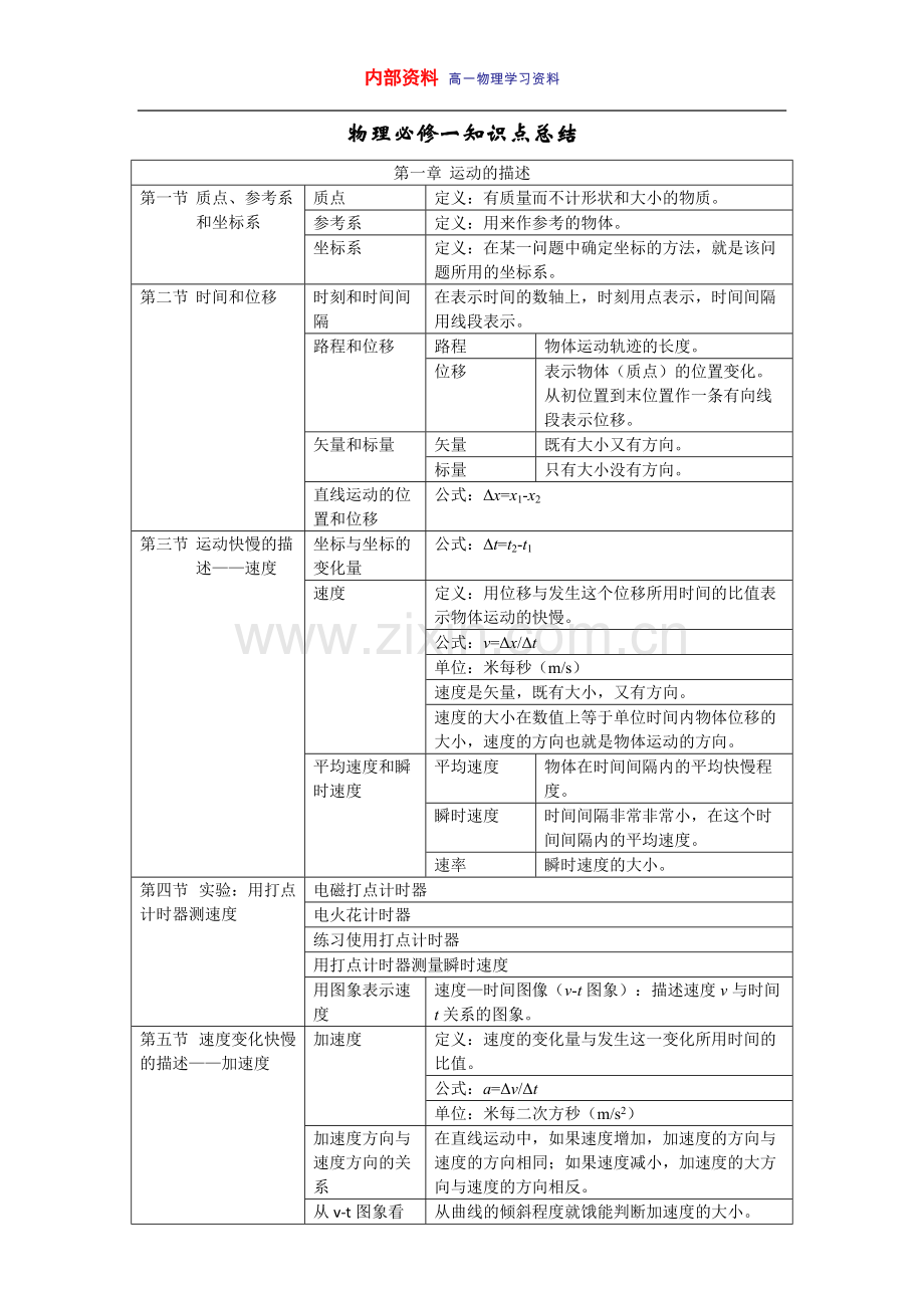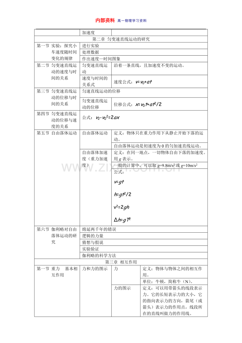 内部资料内部资料 高一物理学习资料物理必修一知识点总结物理必修一知识点总结第一章 运动的描述质点定义:有质量而不计形状和大小的物质。参考系定义:用来作参考的物体。第一节 质点、参考系和坐标系坐标系定义:在某一问题中确定坐标的方法,就是该问题所用的坐标系。时刻和时间间隔在表示时间的数轴上,时刻用点表示,时间间隔用线段表示。路程物体运动轨迹的长度。路程和位移位移表示物体(质点)的位置变化。从初位置到末位置作一条有向线段表示位移。矢量既有大小又有方向。矢量和标量标量只有大小没有方向。第二节 时间和位移直线运动的位置和位移公式:x=x1-x2坐标与坐标的变化量公式:t=t2-t1定义:用位移与发生这个位移所用时间的比值表示物体运动的快慢。公式:v=x/t单位:米每秒(m/s)速度是矢量,既有大小,又有方向。速度速度的大小在数值上等于单位时间内物体位移的大小,速度的方向也就是物体运动的方向。平均速度物体在时间间隔内的平均快慢程度。瞬时速度时间间隔非常非常小,在这个时间间隔内的平均速度。第三节 运动快慢的描述速度平均速度和瞬时速度速率瞬时速度的大小。电磁打点计时器电火花计时器练习使用打点计时器用打点计时器测量瞬时速度第四节 实验:用打点计时器测速度用图象表示速度速度时间图像(v-t 图象):描述速度 v 与时间t 关系的图象。定义:速度的变化量与发生这一变化所用时间的比值。公式:a=v/t加速度单位:米每二次方秒(m/s2)加速度方向与速度方向的关系在直线运动中,如果速度增加,加速度的方向与速度的方向相同;如果速度减小,加速度的大方向与速度的方向相反。第五节 速度变化快慢的描述加速度从 v-t 图象看从曲线的倾斜程度就饿能判断加速度的大小。内部资料内部资料 高一物理学习资料加速度第二章 匀变速直线运动的研究进行实验处理数据第一节 实验:探究小车速度随时间变化的规律作出速度时间图象匀变速直线运动沿着一条直线,且加速度不变的运动。第二节 匀变速直线运动的速度与时间的关系速度与时间的关系式速度公式:v=v0+at匀速直线运动的位移第三节 匀变速直线运动的位移与时间的关系匀变速直线运动的位移位移公式:x=v0t+at2/2第四节 匀变速直线运动的位移与速度的关系公式:v2-v02=2ax定义:物体只在重力作用下从静止开始下落的运动。自由落体运动自由落体运动是初速度为 0 的匀加速直线运动。定义:在同一地点,一切物体自由下落的加速度。用 g 表示。一般的计算中,可以取 g=9.8m/s2或 g=10m/s2第五节 自由落体运动自由落体加速度(重力加速度)公式:v=gth=gt2/2v2=2ghh=gT2绵延两千年的错误逻辑的力量猜想与假说实验验证第六节 伽利略对自由落体运动的研究伽利略的科学方法第三章 相互作用定义:物体与物体之间的相互作用。力单位:牛顿,简称牛(N)。第一节 重力 基本相互作用力和力的图示力的图示定义:可以用带箭头的线段表示力。它的长短表示力的大小,它的指向表示力的方向,箭尾(或箭头)表示力的作用点,线段所在的直线叫做力的作用线。内部资料内部资料 高一物理学习资料定义:由于地球的吸引而使物体受到的力。公式:G=mg重力重力是矢量,既有大小,又有方向。定义:一个物体各部分受到的重力作用集中的一点。重力重心质量均匀分布的物体,常称均匀物体,中心的位置只跟物体的形状有关。质量分布不均匀的物体,中心的位置除了跟物体的形状有关,还跟物体内质量的分布有关。万有引力强相互作用弱相互作用四种基本相互作用电磁相互作用定义:物体在力的作用下形状或体积发生改变。形变弹性形变:物体在形变后能恢复原状的形变。定义:发生弹性形变的物体由于要恢复原状,对与它接触的物体产生的力的作用。弹性限度:物体受到外力作用,在内部所产生的抵抗外力的相互作用力不超过某一极限值时,若外力作用停止,其形变可全部消失而恢复原状,这个极限值称为“弹性限度”。产生弹力的物体是发生弹性形变的物体。弹性形变和弹力弹力方向:垂直于接触面,指向形变物体恢复原状的方向。压力和支持力几种弹力拉力弹力的大小跟形变的大小有关系,形变越大,弹力也越大,形变消失,弹力随之消失。第二节 弹力胡克定律公式:F=kxk弹簧的劲度系数,单位是牛顿每米(N/m)。摩擦力:连个相互接触的物体,当它们发生相对运动或具有相对运动的趋势时,在接触面上所产生的阻碍相对运动或相对运动趋势的力。第三节 摩擦力滚动摩擦力:一个物体在另一个物体表面上滚动时产生的摩擦。内部资料内部资料 高一物理学习资料定义:两个物体之间只有相对运动趋势,而没有相对运动时产生的摩擦力。方向:沿着接触面,跟物体相对运动趋势的方向相反。静摩擦力的增大有个限度,最大值在数值上等于物体刚刚开始运动时的拉力。静摩擦力只要一个物体与另一物体间没有产生相对于运动,静摩擦力的大小就随着前者所受的力的增大而增大,并与这个力保持大小。定义:当一个物体在另一个物体表面滑动的时候,所受到的另一个物体阻碍它滑动的力。方向:沿着接触面,跟物体的相对运动方向的方向相反。滑动摩擦力滑动摩擦力的大小跟压力成正比。公式:F=FN动摩擦因数,它的数值跟相互接触的两个物体的材料有关。合力:一个力,如果它产生的效果与几个力共同作用时产