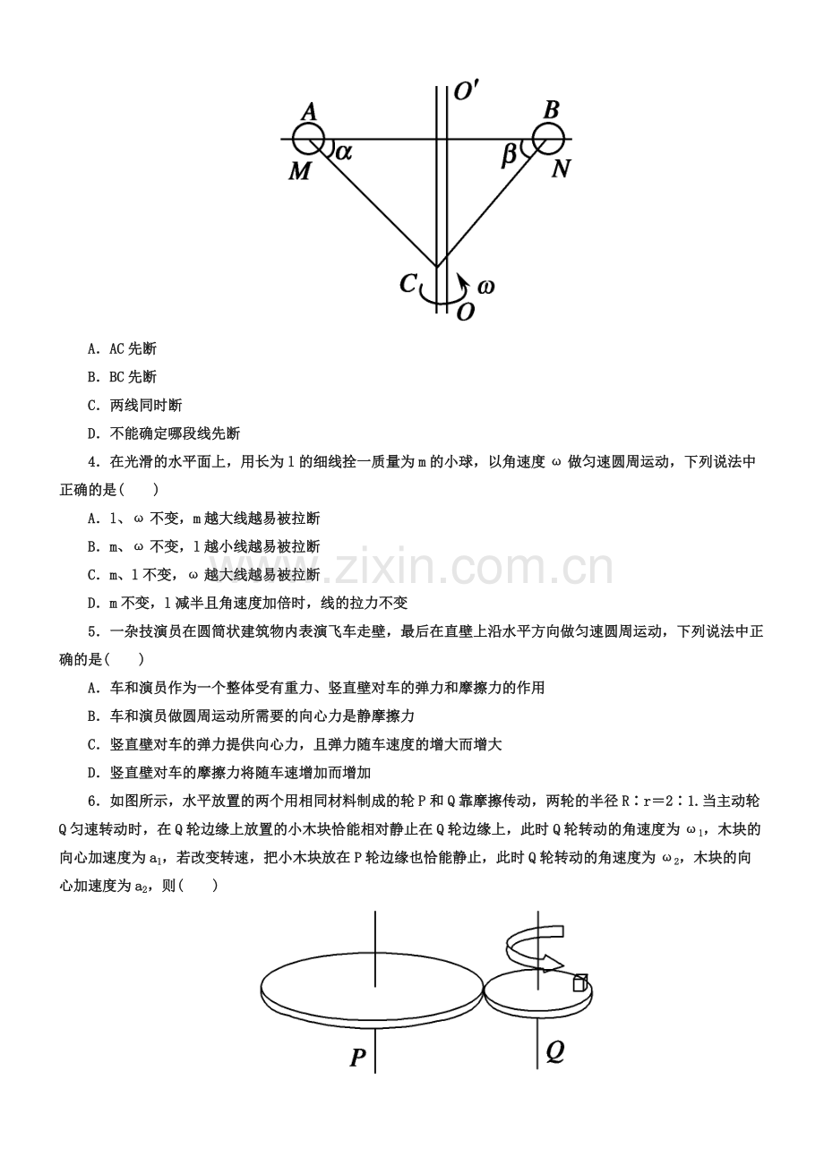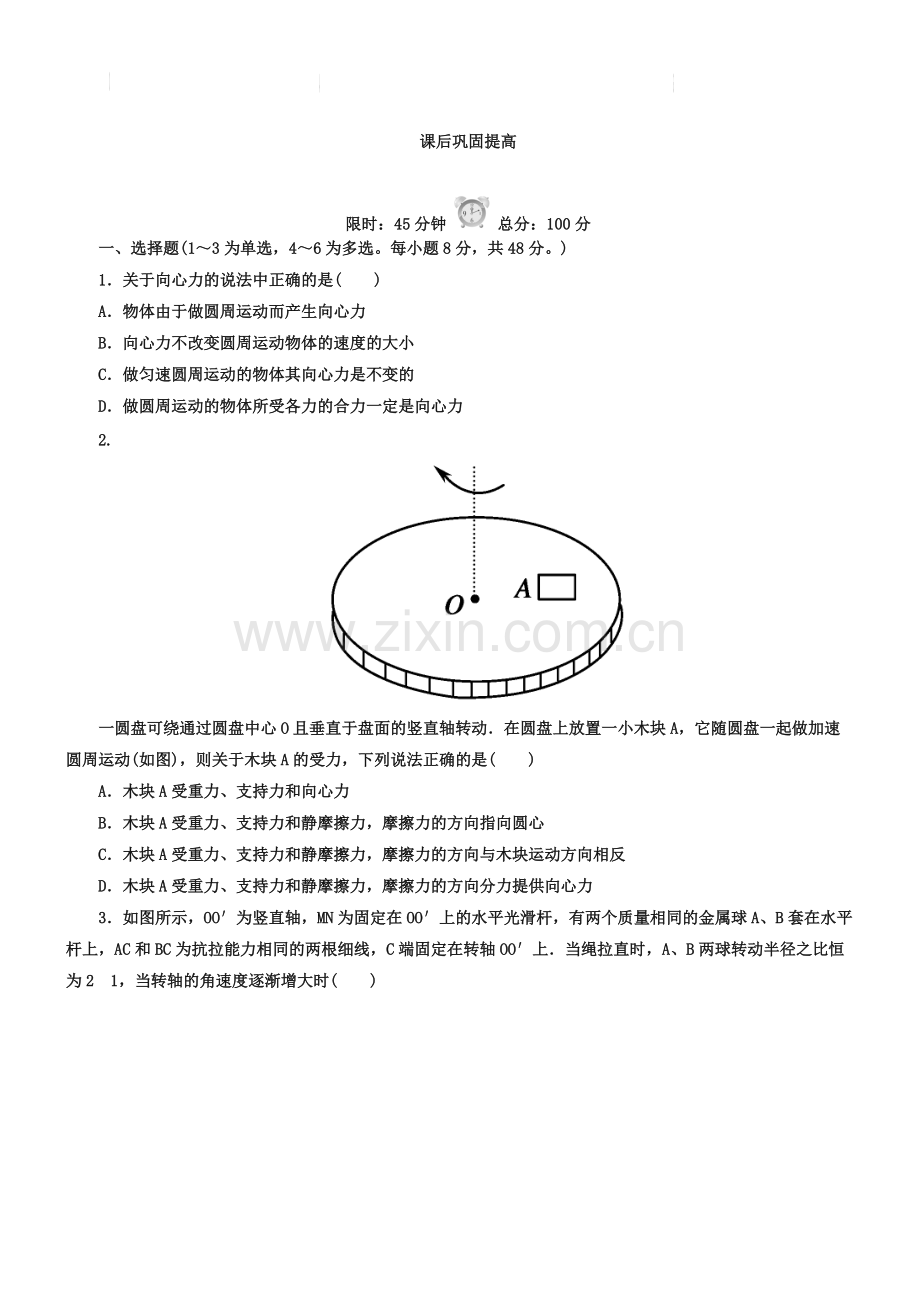 OAG课后巩固提高课后巩固提高限时:限时:4545 分钟分钟 总分:总分:100100 分分一、选择题一、选择题(1(13 3 为单选,为单选,4 46 6 为多选。每小题为多选。每小题 8 8 分,共分,共 4848 分。分。)1 1关于向心力的说法中正确的是关于向心力的说法中正确的是()A A物体由于做圆周运动而产生向心力物体由于做圆周运动而产生向心力B B向心力不改变圆周运动物体的速度的大小向心力不改变圆周运动物体的速度的大小C C做匀速圆周运动的物体其向心力是不变的做匀速圆周运动的物体其向心力是不变的D D做圆周运动的物体所受各力的合力一定是向心力做圆周运动的物体所受各力的合力一定是向心力2.2.一圆盘可绕通过圆盘中心一圆盘可绕通过圆盘中心 O O 且垂直于盘面的竖直轴转动在圆盘上放置一小木块且垂直于盘面的竖直轴转动在圆盘上放置一小木块 A A,它随圆盘一起做加速,它随圆盘一起做加速圆周运动圆周运动(如图如图),则关于木块,则关于木块 A A 的受力,下列说法正确的是的受力,下列说法正确的是()A A木块木块 A A 受重力、支持力和向心力受重力、支持力和向心力B B木块木块 A A 受重力、支持力和静摩擦力,摩擦力的方向指向圆心受重力、支持力和静摩擦力,摩擦力的方向指向圆心C C木块木块 A A 受重力、支持力和静摩擦力,摩擦力的方向与木块运动方向相反受重力、支持力和静摩擦力,摩擦力的方向与木块运动方向相反D D木块木块 A A 受重力、支持力和静摩擦力,摩擦力的方向分力提供向心力受重力、支持力和静摩擦力,摩擦力的方向分力提供向心力3 3如图所示,如图所示,OOOO为竖直轴,为竖直轴,MNMN 为固定在为固定在 OOOO上的水平光滑杆,有两个质量相同的金属球上的水平光滑杆,有两个质量相同的金属球 A A、B B 套在水平套在水平杆上,杆上,ACAC 和和 BCBC 为抗拉能力相同的两根细线,为抗拉能力相同的两根细线,C C 端固定在转轴端固定在转轴 OOOO上当绳拉直时,上当绳拉直时,A A、B B 两球转动半径之比恒两球转动半径之比恒为为 2121,当转轴的角速度逐渐增大时,当转轴的角速度逐渐增大时()A AACAC 先断先断B BBCBC 先断先断C C两线同时断两线同时断D D不能确定哪段线先断不能确定哪段线先断4 4在光滑的水平面上,用长为在光滑的水平面上,用长为 l l 的细线拴一质量为的细线拴一质量为 m m 的小球,以角速度的小球,以角速度 做匀速圆周运动,下列说法中做匀速圆周运动,下列说法中正确的是正确的是()A Al l、不变,不变,m m 越大线越易被拉断越大线越易被拉断B Bm m、不变,不变,l l 越小线越易被拉断越小线越易被拉断C Cm m、l l 不变,不变,越大线越易被拉断越大线越易被拉断D Dm m 不变,不变,l l 减半且角速度加倍时,线的拉力不变减半且角速度加倍时,线的拉力不变5 5一杂技演员在圆筒状建筑物内表演飞车走壁,最后在直壁上沿水平方向做匀速圆周运动,下列说法中正一杂技演员在圆筒状建筑物内表演飞车走壁,最后在直壁上沿水平方向做匀速圆周运动,下列说法中正确的是确的是()A A车和演员作为一个整体受有重力、竖直壁对车的弹力和摩擦力的作用车和演员作为一个整体受有重力、竖直壁对车的弹力和摩擦力的作用B B车和演员做圆周运动所需要的向心力是静摩擦力车和演员做圆周运动所需要的向心力是静摩擦力C C竖直壁对车的弹力提供向心力,且弹力随车速度的增大而增大竖直壁对车的弹力提供向心力,且弹力随车速度的增大而增大D D竖直壁对车的摩擦力将随车速增加而增加竖直壁对车的摩擦力将随车速增加而增加6 6如图所示,水平放置的两个用相同材料制成的轮如图所示,水平放置的两个用相同材料制成的轮 P P 和和 Q Q 靠摩擦传动,两轮的半径靠摩擦传动,两轮的半径 RrRr21.21.当主动轮当主动轮Q Q 匀速转动时,在匀速转动时,在 Q Q 轮边缘上放置的小木块恰能相对静止在轮边缘上放置的小木块恰能相对静止在 Q Q 轮边缘上,此时轮边缘上,此时 Q Q 轮转动的角速度为轮转动的角速度为 1 1,木块的,木块的向心加速度为向心加速度为 a a1 1,若改变转速,把小木块放在,若改变转速,把小木块放在 P P 轮边缘也恰能静止,此时轮边缘也恰能静止,此时 Q Q 轮转动的角速度为轮转动的角速度为 2 2,木块的向,木块的向心加速度为心加速度为 a a2 2,则,则()A.A.B.B.1 12 22 22 21 12 22 21 1C.C.D.D.a a1 1a a2 21 11 1a a1 1a a2 21 12 2二、非选择题二、非选择题(共共 5252 分分)7 7(8(8 分分)一个做匀速圆周运动的物体,若保持其半径不变,角速度增加为原来的一个做匀速圆周运动的物体,若保持其半径不变,角速度增加为原来的 2 2 倍时,所需要的向心力倍时,所需要的向心力比原来增加了比原来增加了 6060 N N,物体原来所需要的向心力是,物体原来所需要的向心力是_N._N.8 8(8(8 分分)质量为质量为 m m 的汽车,在半径为的汽车,在半径为 2020 m m 的圆形水平路面上行驶,最大静摩擦力是车重的的圆形水平路面上行驶,最大静摩擦力是车重的 0.50.5 倍,为了倍,为了不使轮胎在公路上打滑,汽车速度不应超过不使轮胎在公路上打滑,汽车速度不应超过_m/s.(g_m/s.(g 取取 1010 m/sm/s2 2)答案答案1 1B B力是改变物体运动状态的原因,因为有向心力物体才做圆周运动,而不是因为做圆周运动才产生向力是改变物体运动状态的原因,因为有向心力物体才做圆周运动,而不是因为做圆周运动才产生向心力,故心力,故 A A 错;向心力只改