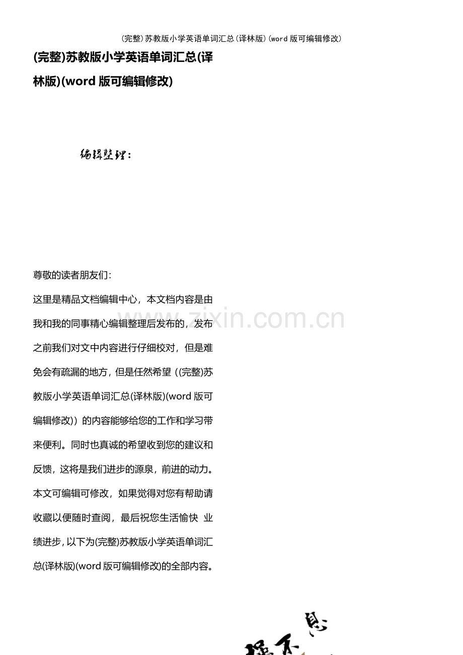 (完整)苏教版小学英语单词汇总(译林版)(word 版可编辑修改)1(完整)苏教版小学英语单词汇总(译林版)(word 版可编辑修改)编辑整理:尊敬的读者朋友们:这里是精品文档编辑中心,本文档内容是由我和我的同事精心编辑整理后发布的,发布之前我们对文中内容进行仔细校对,但是难免会有疏漏的地方,但是任然希望((完整)苏教版小学英语单词汇总(译林版)(word 版可编辑修改))的内容能够给您的工作和学习带来便利。同时也真诚的希望收到您的建议和反馈,这将是我们进步的源泉,前进的动力。本文可编辑可修改,如果觉得对您有帮助请收藏以便随时查阅,最后祝您生活愉快 业绩进步,以下为(完整)苏教版小学英语单词汇总(译林版)(word版可编辑修改)的全部内容。(完整)苏教版小学英语单词汇总(译林版)(word 版可编辑修改)2三年级(上)三年级(上)Unit 1Unit 1Good morning 早上好Hi 你好Good afternoon 下午好Class 同学们I 我Im=I am 我是Unit 2Unit 2are 是you 你yes 是;对am 是no 不;不是;没有not 不;没有Goodbye 再见。Unit 3Unit 3My 我的friend 朋友she 她shes=she ishe 他hes=he istoo 也this 这;这个is 是sister 姐姐;妹妹Unit 4Unit 4family 家;家庭father 父亲;爸爸mother 母亲;妈妈brother 哥哥;弟弟me 我grandpa 祖父;外祖父grandma 祖母;外祖母Good evening。晚上好。Unit 5Unit 5look at 看;瞧Tshirt T 恤衫it 它its=it isnice 好看的;好的skirt 裙子How nice!真好看!cap 便帽;帽子great 好极了;很好jacket 夹克衫new 新的What colour?是什么颜色的?red 红色的Unit 6Unit 6colour 颜色orange 橙色的now 现在;目前green 绿色的and 和;与;又yellow 黄色的black 黑色的blue 蓝色的brown 棕色的white 白色的Would you like?你 想(完整)苏教版小学英语单词汇总(译林版)(word 版可编辑修改)3要吗?an 一个egg 蛋;鸡蛋Yes,please.好的,太感谢了。or 或;还是Unit 7Unit 7a 一个pie 馅饼;派。Nice to meet you.很高兴认识你。No,thank you.不,谢谢你。What about?怎么样?cake 蛋糕;糕饼ice cream 冰淇淋sweet 糖果hot dog 热狗look 看;瞧what 什么whats=what is Unit 8Unit 8Happy New Year!新 年 快乐!uncle 叔父;伯父;舅父;姑父;姨父This is for you.这是给你的。doll 玩具娃娃that 那;那个ball 球robot 机器人CD 光盘car 小汽车;轿车Happy Birthday!生 日 快乐!toy 玩具ah 啊ha 哈三年级(下)三年级(下)Unit 1Unit 1in class 在上课Stand up.起立。Mr 先生Sit down。坐下。please 请open 开;打开the 这个;这些;那个;那些door 门sorry 对不起come in 进来close 关上;合上window 窗,窗户blackboard 黑板book 书rubber 橡皮dont=do not 不要listen to 听parrot 鹦鹉(完整)苏教版小学英语单词汇总(译林版)(word 版可编辑修改)4Unit 2Unit 2in 在里library 图书馆shh 嘘shout 喊;叫run 跑;跑步eat 吃here 这里;在这里talk 说话;谈话sleep 睡觉drink 喝milk 牛奶English 英语your 你的;你们的Unit 3Unit 3pencil 铅笔isnt=is not 不是thats=that is 那是schoolbag 书包pen 钢笔crayon 蜡笔ruler 尺pencil case 铅笔盒;铅笔袋lunch box 午餐盒where 在哪里wheres=where is 在哪里over there 在那里Unit 4Unit 4bird 鸟beautiful 漂亮的;美丽的under 在下面desk 课桌;书桌behind 在后面on 在上面chair 椅子tree 树guess 猜,猜测one 一two 二three 三oh 哦,啊wow 哇,呀Unit 5Unit 5How old are you?你多大?lovely 可爱的nine 九eight 八four 四five 五six 六seven 七ten 十right 对的;正确的out 出局What a nice cake!多么漂亮的蛋糕啊!Make a wish.许个愿吧。want 想要;想Its time for。.是的时候了。(完整)苏教版小学英语单词汇总(译林版)(word 版可编辑修改)5Unit 6Unit 6What time is it?几点了?wake up 醒;醒来mum 妈妈oclock 点钟breakfast 早餐;早饭Hurry up。快点.class 课;上课dinner 晚餐;晚饭bed 床OK 好;行lunch 午餐;午饭eleven 十一twelve 十二bag 包;书包these 这些heres=here is 这里是Unit 7Unit 7farm 农场Welcome to。欢 迎 来到they 他们;她们;它们theyre=they are 他们是;她们是;它们是pig 猪those 那些cow 奶牛apple 苹果pear 梨chicken 鸡duck 鸭子orange 橙子picture 图画;照片who 谁whos=who is 谁是Unit 8Unit 8we 我们were=we are 我们是twin 双胞胎之一aunt 姑母;姨母;伯母;婶母;舅母girl 女孩man 男人;人woman 妇女;女人boy 男孩baby 婴儿;宝宝cousin 堂兄(弟);堂姐(妹);表兄(弟);表姐(妹)name 名字四年级(上)四年级(上)Unit 1Unit 1like 喜欢dog 狗animal 动物cat 猫cute 可爱的panda 熊猫(完整)苏教版小学英语单词汇总(译林版)(word 版可编辑修改)6fat 胖的elephant 大象horse 马lion 狮子monkey 猴子tiger 老虎have 有Unit 2Unit 2Lets 咱们lets=let us make 做;制作fruit 水果salad 色拉pineapple 菠萝mango 芒果any 一些;任何的banana 香蕉some 一些grape 葡萄Thanks。谢谢。our 我们的cool 酷,真棒wonderful 精彩的,绝妙的how many 多少Unit 3Unit 3thirteen 十三sticker 贴纸can 可以;能;会have a look 看一看very 很,非常fifteen 十五sure 当然fourteen 十四sixteen 十六seventeen 十七eighteen 十八nineteen 十九play 玩;打(球)many 许多box 盒子table tennis 乒乓球but 但是do 做;干Unit 4Unit 4basketball 篮球well 好cant=cannothave a try 试一试yeah 是的,对的football 足球jump 跳skate 溜冰;滑冰swim 游泳quack (鸭子的)呱呱声tweet (小鸟的)叽喳声fly 飞ouch 哎哟sad 难过的,伤心的either 也Unit 5Unit 5home 家bedroom 卧室living room 客厅sofa 沙发(完整)苏教版小学英语单词汇总(译林版)(word 版可编辑修改)7come 来kitchen 厨房 clock 钟fridge 冰箱table 桌子bathroom 卫生间How are you?你好吗?hungry 饿的,饥饿的 What would you like?你想要什么?Id like 我想要Unit 6Unit 6at 在(某处)snack bar 快餐店,小吃店hamburger 汉堡包a glass of 杯noodles 面
