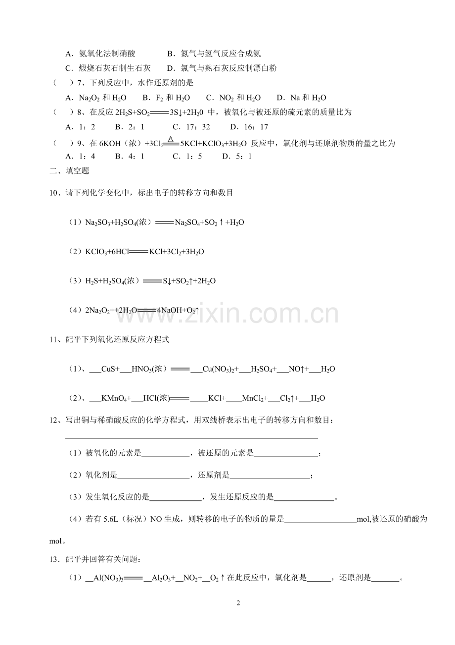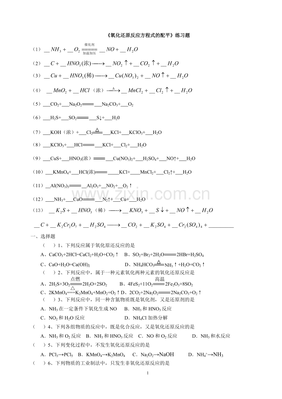 1氧化还原反应方程式的配平氧化还原反应方程式的配平练习题练习题(1)23_ONH 催化剂加温加压OHNO2_(2)OHCONOHNOC2223_)(_浓(3)OHNONOCuHNOCu2233_)(_)(_稀(4)(浓)HClMnO_2OHClMnCl222_(5)CO2+Na2O2 Na2CO3+O2(6)H2S+SO2 S+H20(7)KOH(浓)+Cl2 KCl+KClO3+H2O(8)KClO3+HCl KCl+Cl2+H2O(9)CuS+HNO3(浓)Cu(NO3)2+H2SO4+NO+H2O(10)KMnO4+HCl(浓)KCl+MnCl2+Cl2+H2O(11)Al(NO3)3 Al2O3+NO2+O2(12)NH3+CuO N2+Cu+H2O(13)(稀)32_HNOSKOHNOSKNO23_ _)(_44242242722SOCrSOKCOSOHOCrKC一、选择题()1、下列反应属于氧化原还反应的是A、CaCO3+2HCl=CaCl2+H2O+CO2 B、SO2+Br2+2H2O2HBr+H2SO4 C、CaO+H2O=Ca(OH)2 D、NH4HCO3NH3+H2O+CO2()2、下列反应中,属于一种元素氧化两种元素的氧化还原反应是点燃 高温A、2H2S+3O22H2O+2SO2 B、4FeS2+11O22Fe2O3+8SO2C、2KMnO4=K2MnO4+MnO2+O2D、2CO2+2Na2O22Na2CO3+O2()3、下列反应中,同一种含氮物质既是氧化剂,又是还原剂的是ANH3在一定条件下氧化生成 NO BNH3和 HNO3反应 CNO2和 H2O 反应 DNH4Cl 加热分解()4、下列各组物质的反应中,既是化合反应,又是氧化还原反应的是ANH3和 O2反应 BNH3和 HNO3反应 CNO 和 O2反应 DNH3和水反应()5、下列变化过程中,不发生氧化还原反应的是APCl3PCl5 BKMnO4K2MnO4 CNa2O2NaOH DNH4+NH3()6、下列物质的工业制法中,只发生非氧化还原反应的是2A氨氧化法制硝酸 B氮气与氢气反应合成氨C煅烧石灰石制生石灰 D氯气与熟石灰反应制漂白粉()7、下列反应中,水作还原剂的是ANa2O2 和 H2O BF2 和 H2O CNO2 和 H2O DNa 和 H2O()8、在反应 2H2S+SO23S+2H20 中,被氧化与被还原的硫元素的质量比为A1:2 B2:1 C17:32 D16:17()9、在 6KOH(浓)+3Cl25KCl+KClO3+3H2O 反应中,氧化剂与还原剂物质的量之比为A1:4 B4:1 C1:5 D5:1 二、填空题10、请下列化学变化中,标出电子的转移方向和数目(1)Na2SO3+H2SO4(浓)Na2SO4+SO2+H2O(2)KClO3+6HClKCl+3Cl2+3H2O(3)H2S+H2SO4(浓)S+SO2+2H2O(4)2Na2O2+2H2O4NaOH+O2 11、配平下列氧化还原反应方程式(1)、CuS+HNO3(浓)Cu(NO3)2+H2SO4+NO+H2O(2)、KMnO4+HCl(浓)KCl+MnCl2+Cl2+H2O 12、写出铜与稀硝酸反应的化学方程式,用双线桥表示出电子的转移方向和数目:(1)被氧化的元素是 ,被还原的元素是 ;(2)氧化剂是 ,还原剂是 ;(3)发生氧化反应的是 ,发生还原反应的是 。(4)若有 5.6L(标况)NO 生成,则转移的电子的物质的量是 mol,被还原的硝酸为 mol。13配平并回答有关问题:(1)Al(NO3)3 Al2O3+NO2+O2在此反应中,氧化剂是 ,还原剂是 。3(2)NH3+CuO N2+Cu+H2O 在此反应中,还原剂是 ,被还原的元素是 。1配平以下氧化还原反应方程式:(1)Cr3+Na2O2+OH-CrO42-+Na+H2O(2)CrI3+Cl2+KOHK2Cr2O7+KIO4+KCl+H2O(3)P4+HNO3+H2OH3PO4+NO(4)Mn2+S2O82-+H2OSO42-+MnO4-+H2O(5)Zn+H+NO3-Zn2+NO+H2O(6)HClO4+P+H2OHCl+H3PO42下列有关硫化亚铁跟浓硫酸反应的方程式正确的是()(A)2FeS+6H2SO4=Fe2(SO4)3+3SO2+2S+6H2O(B)4FeS+18H2SO4=2Fe2(SO4)3+9SO2+7S+18H2O(C)6FeS+16H2SO4=3Fe2(SO4)3+6SO2+7S+16H2O(D)8FeS+18H2SO4=4 Fe2(SO4)3+3SO2+11S+18H2O1在反应 5NH4NO3=2HNO3+4N2+9H2O 中,氧化产物与还原产物的物质的量之比是()。(A)1:1 (B)5:4 (C)5:3 (D)3:5 2反应 NO+O2+NO2+H2OHNO3(未配平)是多组化学计量数的化学方程式,当氧气有被 NO 还原时,31此反应各物质化学计量数之比为()。(A)4:9:24:14:28 (B)1:1:1:1:2 (C)8:9:12:10:20 (D)任意比均可3将 H2S 气体通入四种不同浓度的硝酸溶液中,发生下列反应:3H2S+2HNO3=3S+2NO+4H2O 4H2S+2HNO3=4S+NH4NO3+3H2OH2S+2HNO3=S+2NO2+2H2O 5H2S+2HNO3=5S+N2+6H2O根据上述反应判断四种硝酸溶液的氧化性由强到弱的顺序是()。(A)(B)(C)(D)4一定条件下硝酸铵受热分解的未配平化学方程式4为:NH4NO3HNO3+N2+H2O,在反应中被氧化与被还原的氮原子数之比为()。(A)5:3 (B)5:4 (C)1:1 (D)3:55被称为万能还原剂的 NaBH4溶于水并和水反应:NaBH4H2ONaBO2+H2(未配平),下列正确的是()。(A)NaBH4既是氧化剂又是还原剂(B)NaBH4是还原剂,H2O 是氧化剂(C)硼元素被氧化,氢元素被还原(D)被氧化的元素与被还原的元素的质量比是 1:16氧化亚铜(Cu2O)是不溶于水的碱性氧化物,能溶于酸发生自身氧化还原反应生成单质铜和 Cu2+。测定一种含氧化亚铜的矿石中氧化亚铜的含量的方法是:将矿石溶于足量的硫酸铁和硫酸的混合液中,然后用高锰酸钾溶液滴定,反应后锰元素以+2 价形式存在。(1)写出配平的化学反应方程式。Cu2O 与 Fe2(SO4)3、H2SO4反应为_。滴加高锰酸钾溶液时发生的反应为_。(2)Cu2O 与上述两反应中氧化剂的氧化性强弱顺序是_。(3)若某次测定中称取 5.0g 矿样,用高锰酸钾溶液滴定时,消耗 0.1molL-1KMnO4的体积为 100mL,则矿样中氧化亚铜的质量分数为_。1反应:NO 十 O2十 NO2十 H2OHNO3(未配平)是多组化学汁量数的化学方程式,当氧气有 1/3 被NO 还原时,此反应各物质化学计量数之比为 ()A4、9、24、14、28 B.1、1、1、1、2 C.8、9、12、10、20 D任意比均可2根据反应 CuSO4+FeS2+H2OCu2S+FeSO4十 H2S04判断 1 molCuS04能氧化硫的物质的量是()A.3/11mol B1/7 mol C.5/7 mol D4/7mol3工业上制备单质碘的方法之一是从碘酸盐开始的。第一步先用适量的亚硫酸氢盐将碘酸盐还原成碘化物,离子方程式为:I03-十 HS03-一 I-+SO42-+H+。第二步将第一步得到的酸性碘化物溶液再跟适量的碘酸盐溶液混合,发生反应析出了碘。试问;(1)第二步发生反应的离子方程式是。(2)若要使碘酸盐的利用率最高,碘酸盐的第一步和第二步反应中的用量之比为 配平下列离子方程式:Fe(OH)3+ClO-十 OH-FeO4n-+Cl-十 H2O 已知有 321 g Fe(OH)3参加了反应,共转移了 5421022个电子,则 n=,FeO4n-中铁的化合价为 .根据(1)、(2)推测 FeO4n-能和下列 (填序号)物质反应。AKMn04 BS02 CH2S D.O254单质铁与稀 HNO3可发生多种反应,当 8/3n(Fe)n(HNO3)4n(Fe)时,反应方程式可用下列通式表示:aFe+