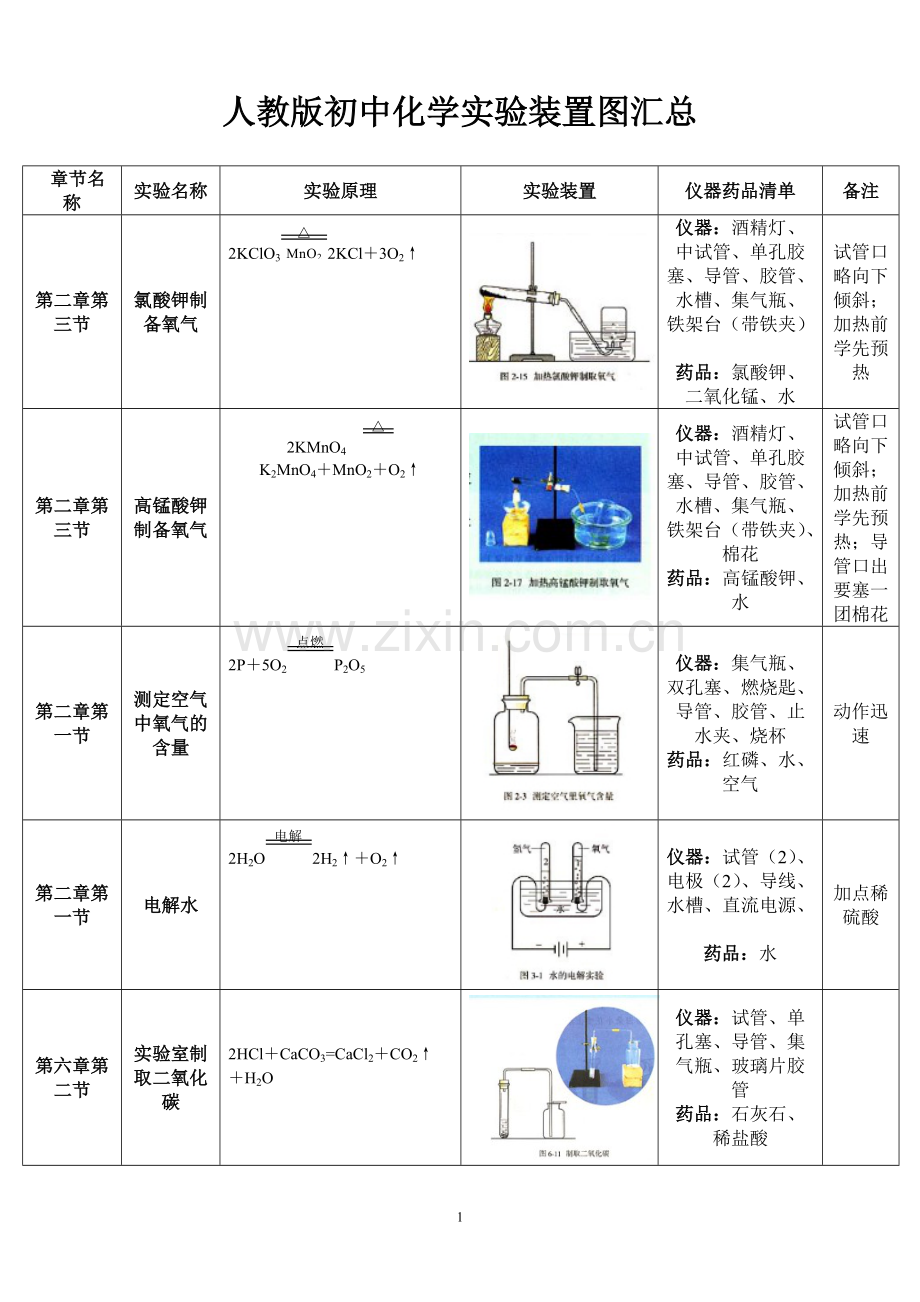 1人教版初中化学实验装置图汇总人教版初中化学实验装置图汇总 章节名章节名称称实验名称实验名称实验原理实验原理实验装置实验装置仪器药品清单仪器药品清单备注备注第二章第第二章第三节三节氯酸钾制氯酸钾制备氧气备氧气2KClO32KCl3O2MnO2仪器:仪器:酒精灯、中试管、单孔胶塞、导管、胶管、水槽、集气瓶、铁架台(带铁夹)药品:药品:氯酸钾、二氧化锰、水试管口略向下倾斜;加热前学先预热第二章第第二章第三节三节高锰酸钾高锰酸钾制备氧气制备氧气2KMnO4 K2MnO4MnO2O2仪器:仪器:酒精灯、中试管、单孔胶塞、导管、胶管、水槽、集气瓶、铁架台(带铁夹)、棉花药品:药品:高锰酸钾、水试管口略向下倾斜;加热前学先预热;导管口出要塞一团棉花第二章第第二章第一节一节测定空气测定空气中氧气的中氧气的含量含量2P5O2P2O5点燃仪器:仪器:集气瓶、双孔塞、燃烧匙、导管、胶管、止水夹、烧杯药品:药品:红磷、水、空气动作迅速第二章第第二章第一节一节电解水电解水2H2O2H2O2电解仪器:仪器:试管(2)、电极(2)、导线、水槽、直流电源、药品:药品:水加点稀硫酸第六章第第六章第二节二节实验室制实验室制取二氧化取二氧化碳碳2HClCaCO3=CaCl2CO2H2O仪器:仪器:试管、单孔塞、导管、集气瓶、玻璃片胶管药品:药品:石灰石、稀盐酸2仪器:仪器:锥形瓶、双孔塞、导管、集气瓶、玻璃片、胶管、长颈漏斗药品:药品:石灰石、稀盐酸、澄清石灰水仪器:仪器:锥形瓶、双孔塞、导管、集气瓶、胶管、长颈漏斗药品:药品:石灰石、稀盐酸、澄清石灰水第六章第第六章第一节一节木炭还原木炭还原氧化铜氧化铜C2CuOCuCO2高温仪器:仪器:中试管(2)、单孔塞、酒精灯、灯罩、导管药品:药品:木炭、氧化铜、澄清石灰水试管向下倾斜;撤离酒精灯之前,先将导管移除水面第七章第第七章第三节三节实验室制实验室制取氢气的取氢气的简易装置简易装置H2SO4Zn=ZnSO4H2仪器:仪器:中试管(2)、单孔塞、导管、铁架台(带铁夹)、水槽药品:药品:稀硫酸、锌粒第七章第第七章第一节一节燃烧条件燃烧条件2P5O2P2O5点燃仪器:仪器:烧杯、铜片药品:药品:白磷、红磷、热水、氧气第七章第第七章第一节一节灭火器原灭火器原理理2HCl(浓)Na2CO3=2NaClCO2H2O仪器:仪器:胶塞、小试管、具支锥形瓶、胶管、线药品:药品:浓盐酸、碳酸钠3第三章第第三章第三节三节过滤过滤仪器:仪器:大、小烧杯、漏斗、滤纸、玻璃棒、铁架台(带铁圈)药品:药品:浊液一贴二一贴二低三靠低三靠仪器:仪器:铁架台(带铁夹)、石棉网、蒸馏烧瓶、单孔塞、温度计、冷凝管、尾接管、胶管、锥形瓶、酒精灯药品:药品:混合液第三章第第三章第三节三节蒸馏蒸馏仪器:仪器:铁架台(带铁夹)、石棉网、蒸馏烧瓶、单孔塞、长导管、试管、烧杯、酒精灯药品:药品:混合液、水第五章第第五章第一节一节白磷燃烧白磷燃烧2P5O2P2O5点燃仪器:仪器:托盘天平、锥形瓶、玻璃管、气球药品:药品:白磷、沙子、酒精灯第五章第第五章第一节一节铁与硫酸铁与硫酸铜反应铜反应FeCuSO4=FeSO4Cu仪器:仪器:托盘天平、烧杯药品:药品:硫酸铜溶液、铁钉4第五章第第五章第一节一节盐酸与碳盐酸与碳酸钠反应酸钠反应2HClNa2CO3=2NaClCO2H2O仪器:仪器:托盘天平、烧杯、小试管药品:药品:盐酸溶液、碳酸钠溶液第五章第第五章第一节一节氢气还原氢气还原氧化铜氧化铜H2CuOCuH2O仪器:仪器:试管、高温酒精灯药品:药品:氧化铜、氢气第八章第第八章第三节三节一氧化碳一氧化碳还原氧化还原氧化铁铁3COFe2O32Fe3CO2高温仪器:仪器:硬直玻璃管、铁架台(带铁夹)、酒精喷灯、单孔塞、导管、胶管双孔塞、试管、酒精灯药品:药品:氧化铜、氢气加热前要先通氧气;撤火后再停止一氧化碳的通入第十一章第十一章第一节第一节蒸发结晶蒸发结晶仪器:仪器:铁架台(带铁圈)、蒸发皿、酒精灯、玻璃棒药品:药品:溶液剩余少量溶液时停止加热,用余热将溶液蒸干5人教版初高中化学实验装置图汇总人教版初高中化学实验装置图汇总 章节名章节名称称实验实验名称名称实验原理实验原理实验装置实验装置仪器药仪器药品清单品清单过滤过滤可溶性物质可以通过滤纸,可溶性物质可以通过滤纸,不溶性物质则留在了滤纸上,不溶性物质则留在了滤纸上,从而达到分离的目的。从而达到分离的目的。待分离溶液待分离溶液带铁圈的铁带铁圈的铁架台、烧杯架台、烧杯两个、漏斗、两个、漏斗、玻璃棒、滤玻璃棒、滤纸纸蒸发结蒸发结晶晶通过升温使水分蒸发,溶液通过升温使水分蒸发,溶液达到饱和,固体析出达到结达到饱和,固体析出达到结晶目的晶目的溶液溶液带铁圈的铁带铁圈的铁架台、蒸发架台、蒸发皿、酒精灯、皿、酒精灯、玻璃棒玻璃棒实验室实验室制蒸馏制蒸馏水水对于液态混合物,根据他们对于液态混合物,根据他们的沸点不同,用蒸馏方法除的沸点不同,用蒸馏方法除去难挥发或不挥发的杂质。去难挥发或不挥发的杂质。自来水、自来水、带铁夹的铁带铁夹的铁架台、酒精架台、酒精灯、石棉网、灯、石棉网、圆底烧瓶、圆底烧瓶、温度计,水温度计,水冷凝管、尾冷凝管、尾接管、锥形接管、锥形瓶、橡胶管瓶、橡胶管第第一一章章从从实实验验学学化化学学第第一一节节化化学学实实验验方方法法萃取萃取分液分液对于液态混合物,利用混