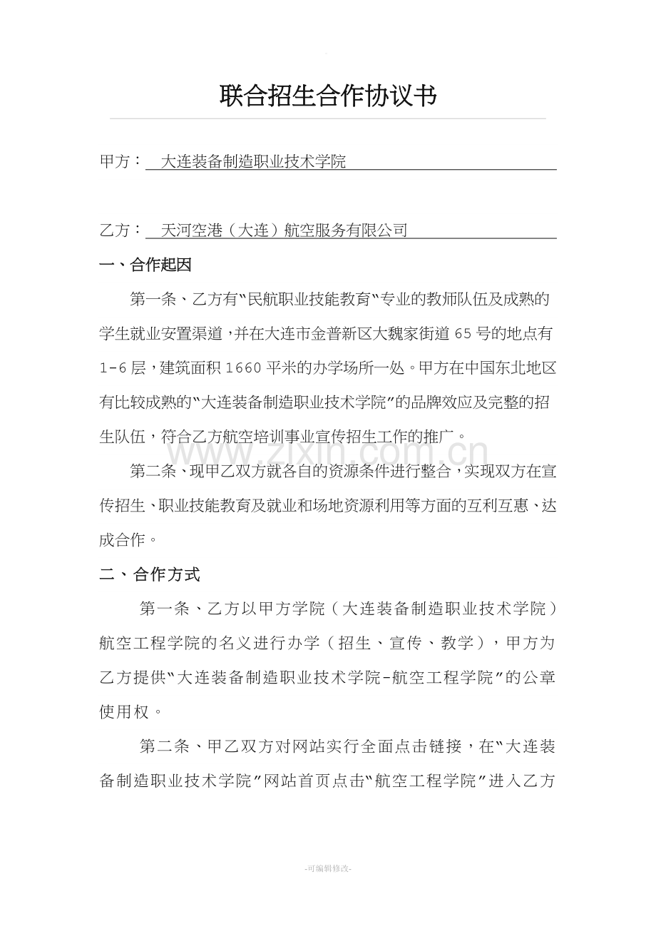 第一条、乙方有“民航职业技能教育“专业的教师队伍及成熟的学生就业安置渠道,并在大连市金普新区大魏家街道65号的地点有1-6层,建筑面积1660平米的办学场所一处。甲方在中国东北地区有比较成熟的“大连装备制造职业技术学院”的品牌效应及完整的招生队伍,符合乙方航空培训事业宣传招生工作的推广。