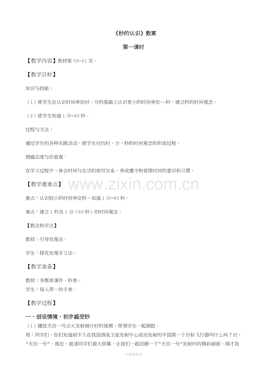 (1) 使学生在认识时间单位时、分的基础上认识更小的时间单位——秒。建立秒的时间观念。