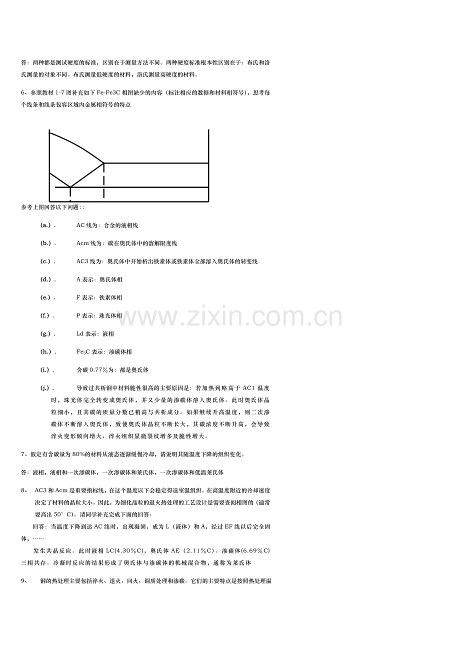 8、 AC3和Acm是重要指标线,在这个温度以下会稳定得逞室温组织。在高温度附近的冷却速度决定了材料的晶粒大小。因此,为细化晶粒的退火热处理的工艺设计是需要查阅相图的(通常要高出50°C)。请同学补充完成下面的回答: