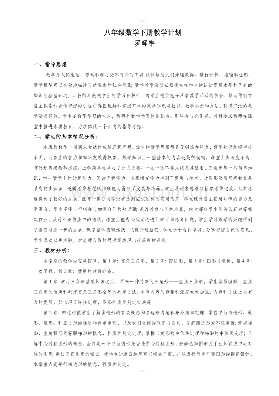 八年级数学下册教学计划