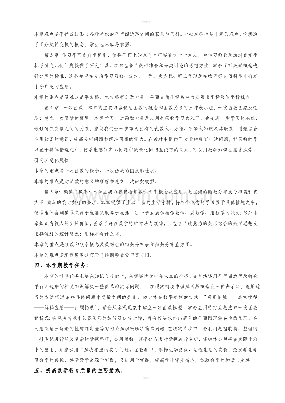 本学期的教学内容共四章,第1章:直角三角形,第2章:四边形,第3章:图形与坐标,第4章:一次函数,第5章:数据的频数分布。