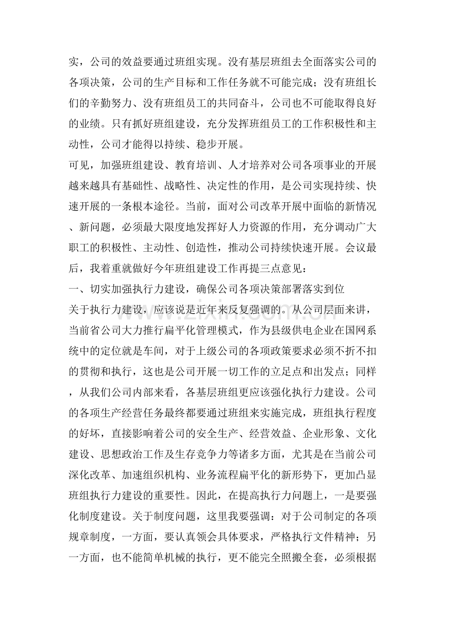 同志们,加强班组建设是提升凝聚力和竞争力、实现公司各项开展目标的客观要求和重要前提。希望大家认真学习领会本次会议精神,积极贯彻落实公司各项决策和工作部署,开拓创新,真抓实干,全力推动公司班组建设再上新台阶,全面推进公司全年工作目标和任务,为建设“一强三优”现代供电企业而努力奋斗!