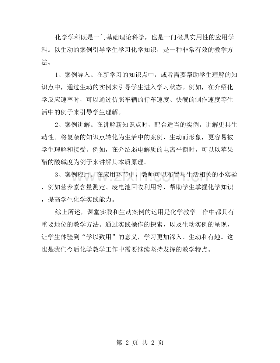 综上所述,课堂实践和生动案例的运用是化学教学工作中都具有重要地位的教学方法。通过实践操作的探索,以及生动实例的呈现,让学生体验到“学以致用”的意义,学习更加深入、生动和有趣。这也是我们今后化学教学工作中需要继续坚持发挥的教学特点。