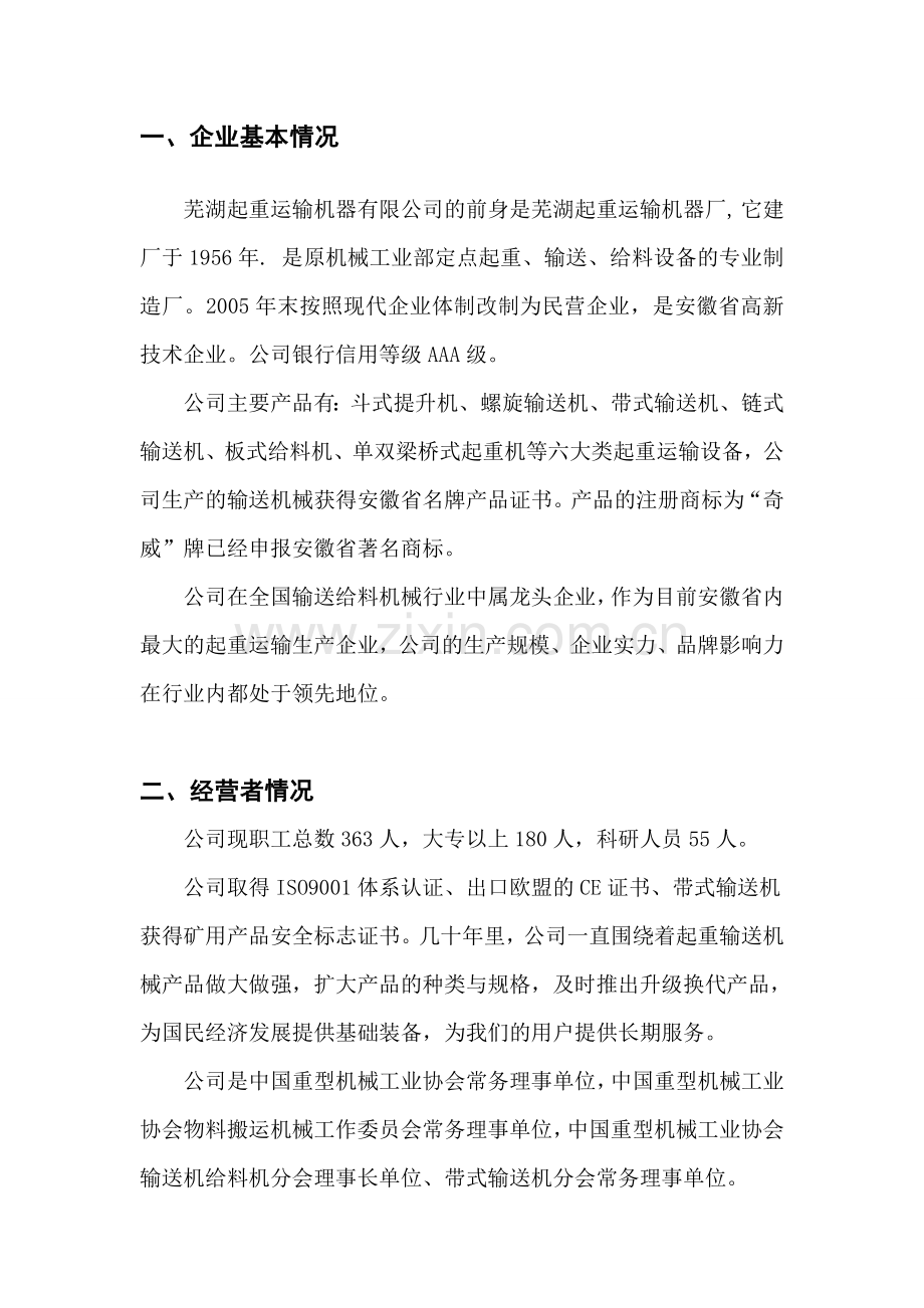 芜湖起重运输机器有限公司的前身是芜湖起重运输机器厂, 它建厂于1956年. 是原机械工业部定点起重、输送、给料设备的专业制造厂。2005年末按照现代企业体制改制为民营企业,是安徽省高新技术企业。公司银行信用等级AAA级。
