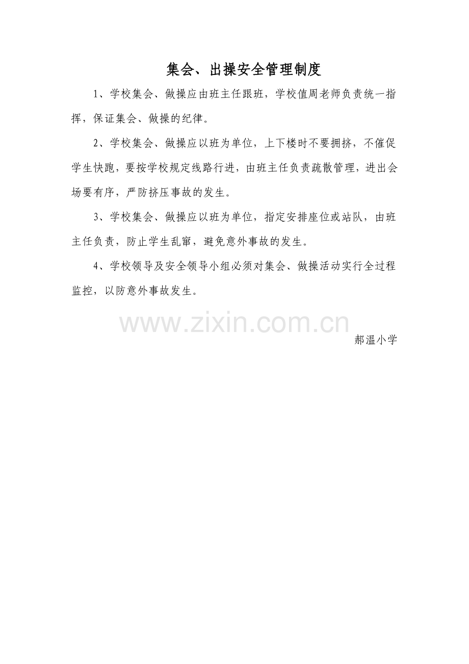 集会、出操安全管理制度 1、学校集会、做操应由班主任跟班,学校值周老师负责统一指挥,保证集会、做操的纪律。 2、学校集会、做操应以班为单位,上下楼时不要拥挤,不催促学生快跑,要按学校规定线路行进,由班主任负责疏散管理,进出会场要有序,严防挤压事故的发生。 3、学校集会、做操应以班为单位,指定安排座位或站队,由班主任负责,防止学生乱窜,避免意外事故的发生。 4、学校领导及安全领导小组必须对集会、做操活动实行全过程监控,以防意外事故发生。 郝温小学