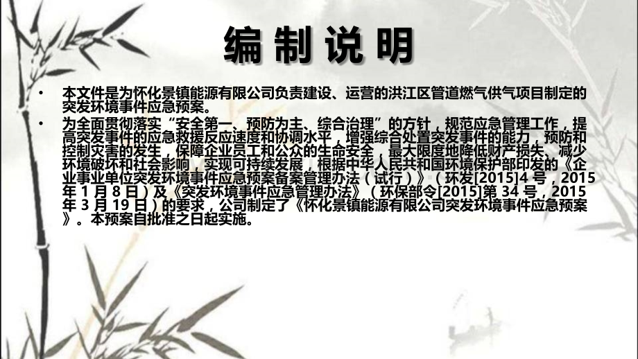 洪江区管道燃气项目突发环境事件应急预案简介怀化景镇能源有限公司 刘士平编 制 说 明本文件是为怀化景镇能源有限公司负责建设、运营的洪江区管道燃气供气项目制定的突发环境事件应急预案。为全面贯彻落实“安全第一、预防为主、综合治理”的方针,规范应急管理工作,提高突发事件的应急救援反应速度和协调水平,增强综合处置突发事件的能力,预防和控制灾害的发生,保障企业员工和公众的生命安全,最大限度地降低财产损失、减少环境破坏和社会影响,实现可持续发展,根据中华人民共和国环境保护部印发的企业事业单位突发环境事件应急预案备案管理办法(试行)(环发20154 号,2015 年 1 月 8 日)及突发环境事件应急管理办法(环保部令2015第 34 号,2015 年 3 月 19 日)的要求,公司制定了怀化景镇能源有限公司突发环境事件应急预案。本预案自批准之日起实施。编 制 过 程 概 述成立应急预案编制小组环境应急能力评估环境风险源识别与环境风险评价基本情况调查应急预案编制重 点 内 容 说 明应急队伍及所配备的应急物资应急措施环境风险源及风险等级评估根据企业突发环境事件风险评估指南(试行)的“附录 B 突发环境事件风险物质及临界量清单”,确定本项目的主要环境风险物质为天然气等;根据企业突发环境事件风险评估指南(试行)的要求,确定企业环境风险等级为一般环境风险,级别表征为“一般(Q1M1E3)”公司成立应急指挥机构,配置的一定的应急物资和装备,包括包括个人防护装备、应急通信装备、应急照明设备、消防器材等。包括火灾的应急措施、天然气泄漏的应急措施、事故废水的应急处置措施、废气处理设施故障的应急措施、生产装置应急处置措施、危废流失的应急处置措施,危险区的隔离、撤离、应急救援队伍的调度及物资保障供应程序等。征求意见及采纳情况说明在编制本突发环境事件应急预案的过程中,针对应急预案的内容,积极征求了怀化景镇能源有限公司及周边企业员工、周边乡镇群众、洪江区环保局、安监局、消防大队等相关部门及人员的意见。根据相关人员和部门的意见和建议,同时结合企业实际情况,在应急预案编制时,对征求来的意见和建议进行了汇总并采纳。内部评 审 说 明2018年1月5日,怀化景镇能源有限公司组织召开了怀化景镇能源有限公司突发环境事件应急预案内部技术评审会。会议邀请了本公司领导及各部门负责人对本预案进行内部评审。经过厂区现场查看,与会代表在听取建设单位关于项目建设情况介绍和应急预案编制内容的汇报后,经认真讨论,评审组形成技术评审意见,详见附件9。会后,应急预案编制小组进行认真分析和总结,针对评审组评审意见修改,情况见表4.1-1。应 急 预 案 编 制在风险分析和应急能力评估的基础上,针对可能发生的环境事件的类型和影响范围,编制应急预案。对应急机构职责、人员、技术、装备、设施(备)、物资、救援行动及其指挥与协调方面预先做出具体安排。应急预案应充分利用社会应急资源,与地方政府预案、上级主管单位以及相关部门的预案相衔接。怀化景镇能源有限公司突发环境事件应急怀化景镇能源有限公司突发环境事件应急预案目录预案目录总则企业概况环境风险评价组织机构及职责12预防与预警信息报告与通报3456应急响应与措施后期处置应急培训和演练应急保障78奖惩附则9101112总 则编制目的:为建立、健全突发环境事件的应急机制,积极防范和及时处置各类突发环境事件,增强企业应对突发环境事件的应急反应能力,最大限度降低突发环境事件的危害程度,保护人员生命和企业财产安全,维护企业及周边环境安全,结合公司实际情况,特制定本预案。总 则编制依据-政策法规中华人民共和国环境保护法2015 年 1 月 1 日中华人民共和国大气污染防治法2016 年 1 月 1 日中华人民共和国水污染防治法2008 年 2 月 28 日中华人民共和国固体废物污染环境防治法2004 年 12 月 29 日修订;中华人民共和国突发事件应对法2007 年主席令第 69 号突发环境事件应急预案管理暂行办法环发2010113 号,2010年 9 月 28 日危险化学品安全管理条例国务院令第 591 号,2011 年 12 月 1日编制依据-政策法规突发环境事件应急管理办法环保部令2015第 34 号,2015 年3 月 19 日突发环境事件信息报告办法2011 年部令第 17 号,2011 年 3月 24 日企业事业单位突发环境事件应急预案备案管理办法(试行)环发20154 号,2015 年 1 月 8 日;企业突发环境事件风险评估指南(试行)环办201434 号,2014 年 4 月 3 日国家突发环境事件应急预案国办函2014119 号,2014 年 12月 29 日国家突发公共事件总体应急预案2005 年 1 月 26 日总 则编制依据-标准、技术规范(1)建设项目环境风险评价技术导则(HJ/T169-2004)(2)地表水环境质量标准(GB3838-2002)(3)地下水质量标准(GB/T14848-93)(4)环境空气质量标准(GB3095-2012)(5)大气污染物综合排放标准(GB16297-1996)(6)污水综合排放标准(GB8978-1996)(8)工业企业厂界环境噪声排放标准(GB12348-2008)(9)工业企业设计卫生标准(TJ36-79)(10)声环境质量标准(GB3096-2008)(11)锅炉大气污染物排放标准(GB13271-2014)(12)一般工业固体废物贮存、处置场污染控制标准(GB18599-2001)(13)危险废物贮存污染控制标准(GB18597-2001)(14)化 学 品 分 类、警 示 标 签 和 警 示 性 说 明 安 全 规 程(GB2057620602-2006)(15)国家危险废物名录,国家环保部、国