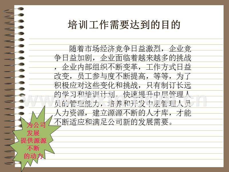 培训工作需要达到的目的,为公司发展提供源源不断的动力,随着市场经济竞争日益激烈,企业竞争日益加剧,企业面临着越来越多的挑战,企业内部组织不断变革,工作方式日益改变,员工参与度不断提高,等等,为了积极应对这些变化和挑战,只有制订长远的学习和培训计划,快速提升中层管理人员的管理能力,培养和开发中层管理人员人力资源,建立源源不断的人才库,才能不断适应和满足公司新的发展需要。,培训体系的理论基础,,建立中层管理人员以“胜任能力”为主导的人才发展策略,提高中层管理人员的管理能力,对中层管理工作岗位员工应当具备的知识、技能、个性特征以及潜在动力明确定义和方向,并为今后的发展打下良好基础;建立后备人才梯队,作为管理人员的后备基础,同时建立专业、业务、管理等不同性质的发展通路,为员工的发展确立方向;,核心能力模型分析,核心能力是我们公司未来发展的关键,通过不断的学习和培训,以提高中层管理人员的管理能力为主要目标,建立学习型组织,从而建立一个具有核心竞争能力、不断取得成效的组织。,核心能力模型分析,,经营业绩,,,,,,以客户和市场为重心,建立相互信赖的伙伴关系,创新,驾驭复杂事物,员工发展,我们应具备的核心能力,核心能力模型分析,通过建立分层次、分模块、系统化的培训体系,提高员工及管理人员的自我管理、管理他人、团队管理以及管理业务(专业)的能力:,,,,自我管理,管理他人,管理团队,管理业务,定义,结合公司特点,将员工性质按从事工作不同分为业务、专业、管理三个层次,专业层次,管理层次,业务层次,非业务人员,同时未承担主要管理工作,,承担管理工作的人员,,业务人员,同时未承担主要管理工作,,中化国际培训体系,结合公司特点,将员工性质按从事工作不同分为业务、专业、管理三个层次,专业层次,管理层次,业务层次,非业务人员,同时未承担主要管理工作,,承担管理工作的人员,,业务人员,同时未承担主要管理工作,,定义,专业层次,行政管理人员人力资源人员财务人员(含审计)投资(项目)人员执行人员信息技术人员法律事务人员,定义,业务层次,业务人员市场人员,定义,管理层次,各级管理人员,分层次,高级业务层次,初级专业层次,中级业务层次,初级业务层次,,,,高级专业层次,中级专业层次,,,,高级管理层次,中级管理层次,初级管理层次,,,模块化,专业模块,管理模块,业务模块,培训体系,根据前面的分析,建立分层次、模块化的系统培训体系。在体系中,随着员工职业能力和生涯的发展选择不同的课程来满足不同阶段的需求。,职业生涯和培训,,,中级管理课程,初级管理课程,高级管理课程,员工职业生涯,培训项目,职业生涯和培训工作时间和培训层次,0-3年,,3-5年,5年以上,,0-3年,3-5年,5年以上,工作年限,工作年限,工作年限,3-5年,5-8年,8年以上,各层次应具备的能力,初级层次业务和专业,自我管理能力自我学习能力基础工作能力执行能力合作能力对纪律和制度的严格遵守,各层次应具备的能力,中级层次业务和专业,自我管理能力自我学习能力独立工作能力教练能力合作能力管理业务和专业能力管理团队能力创新能力,各层次应具备的能力,高级层次业务和专业,强大的独立工作能力教练能力管理业务和专业能力管理团队能力创新能力咨询能力,各层次应具备的能力,初级管理层次,独立工作能力初级教练能力管理业务和专业能力管理团队能力创新能力协调能力具备基本的管理技巧,各层次应具备的能力,中级管理层次,教练能力管理业务和专业能力管理团队能力创新能力沟通能力(管理)具备娴熟的管理技巧战略能力学习能力激励能力,各层次应具备的能力,高级管理层次,教练能力创新能力战略能力学习能力激励能力,培训课程的设置,各层次模块的课程设置根据前述能力来设置,职业生涯和培训各层次转换通道,,,专业岗位向业务岗位转换时,如没有接受过业务岗位的系列课程,应从初级阶段开始学习,,,,,,箭头表示在进行本阶段课程时,可以同时选择另一层次的等级,职业生涯和培训各层次转换通道,,,业务岗位向专业岗位转换时,如没有接受过专业岗位的系列课程,应从初级阶段开始学习,,,,,,箭头表示在进行本阶段课程时,可以同时选择另一层次的等级,职业生涯和培训各层次转换通道,,专业和业务岗位向管理岗位转换时,如没有接受过专业岗位的系列课程,应从初级阶段管理课程开始学习,箭头表示在进行本阶段课程时,可以同时选择另一层次的等级,,,,课程管理,课程管理采用积分制。使用积分制的目的:通过使用积分制,可以对员工的学习情况进行综合评价和管理,并利用积分制,和岗位晋升以及职务晋升进行挂钩。每一个层次应得到相应的积分后才可以进入下一阶段学习。同时在后备人才管理以及管理人员管理方面提供可以量化的数据基础。得到规定的积分是在职业发展生涯中向上发展的必要条件。可以让员工对自己的未来发展有比较清晰的目标(尤其和绩效管理结合起来,比如在3年内完满拿到积分,同时绩效考评良好,可以承诺一定会调升岗位等级或升职,客观上提供了标准),课程管理,积分分类:参加公司组织的学习积分定义为标准积分;员工自行参加的学习积分为可转换积分;人力资源部在发布课程时,会公布每门课程的对应标准分值,参训者在按照规定程序完成课程后,由授权者在培训