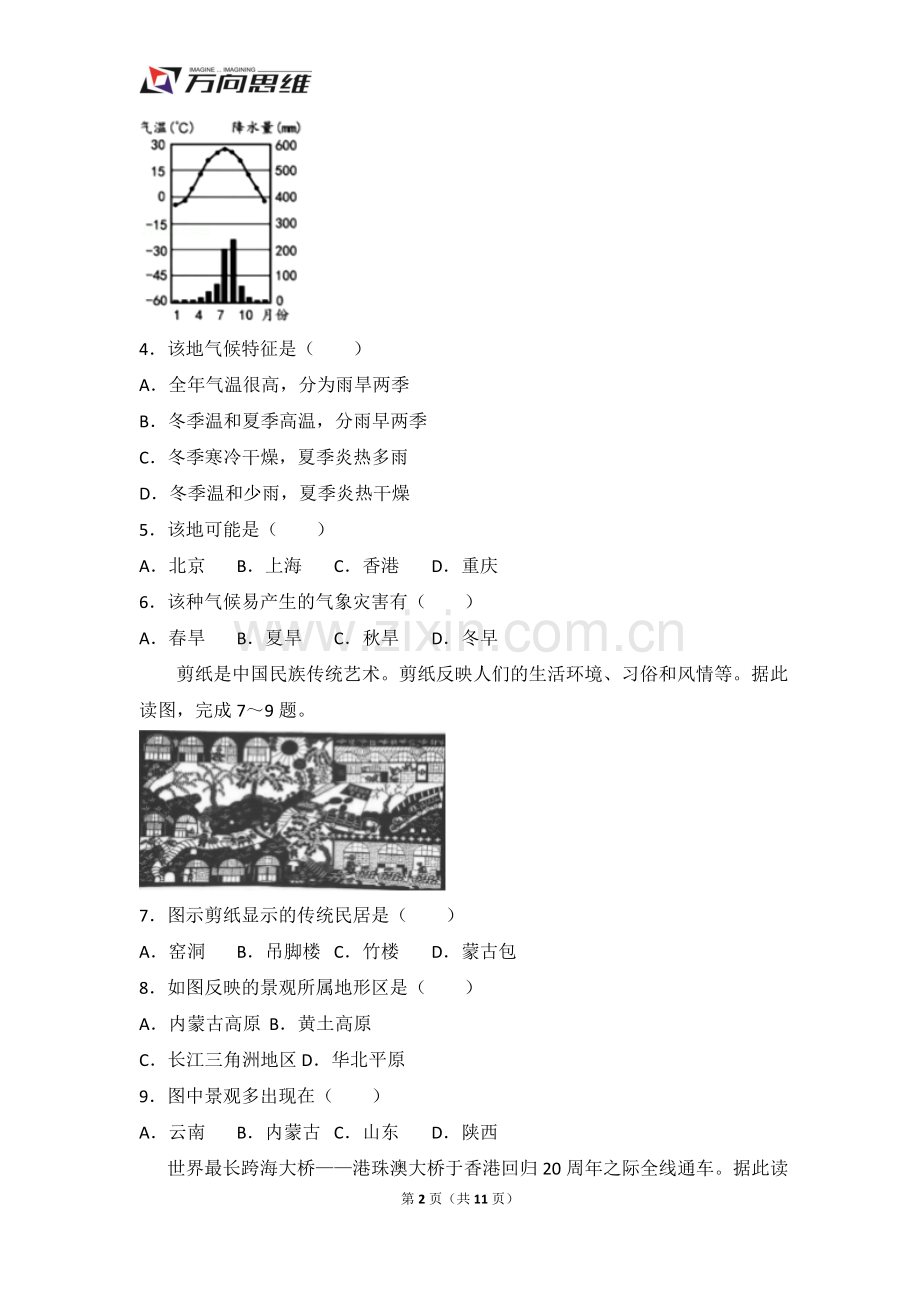 剪纸是中国民族传统艺术。剪纸反映人们的生活环境、习俗和风情等。据此读图,完成7~9题。