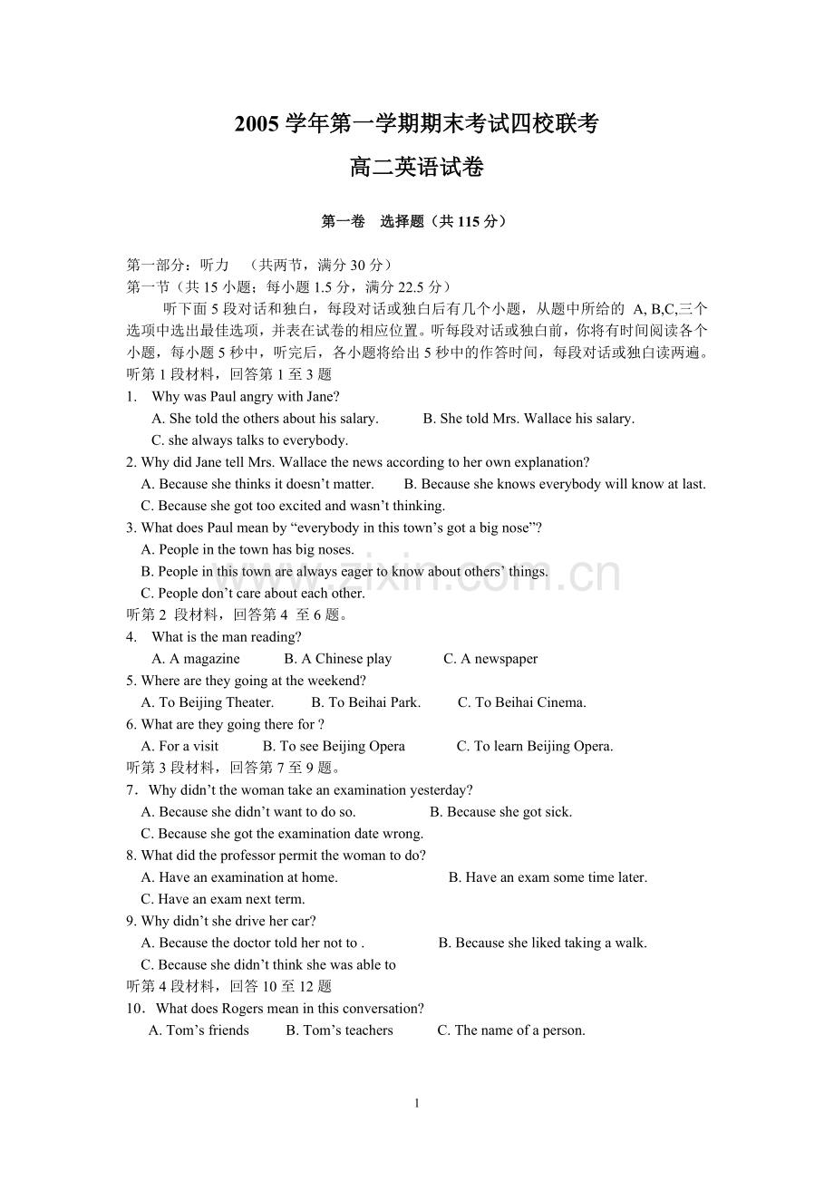 2005学年第一学期期末考试四校联考