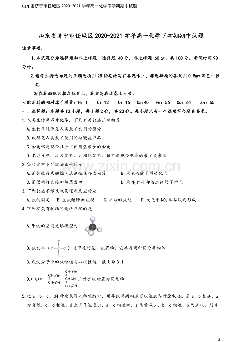 山东省济宁市任城区2020-2021学年高一化学下学期期中试题
