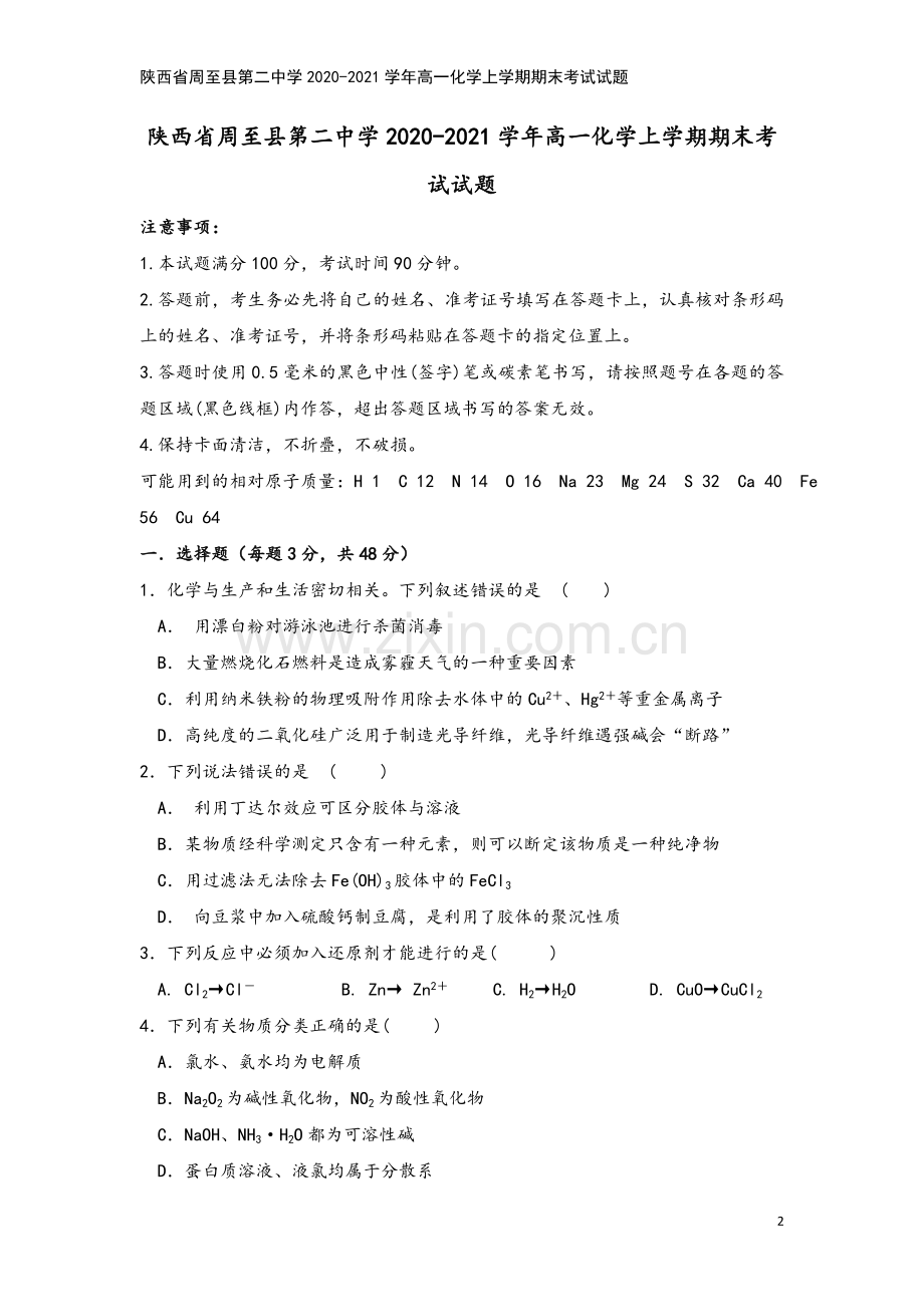 陕西省周至县第二中学2020-2021学年高一化学上学期期末考试试题