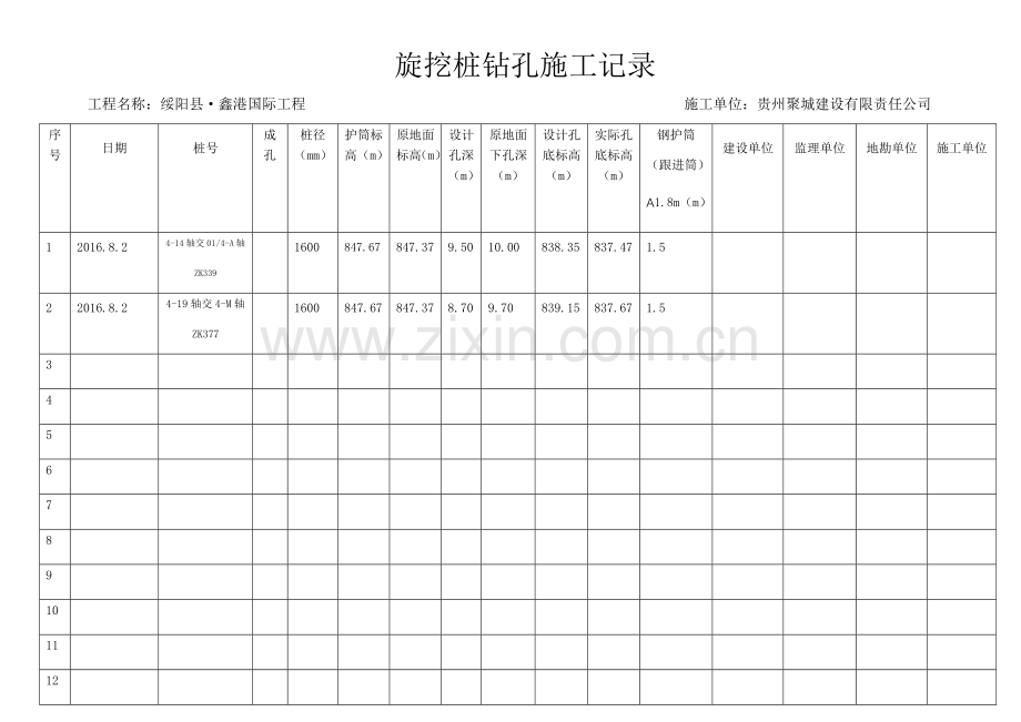 绥阳县·鑫港国际工程孔桩施工统计表