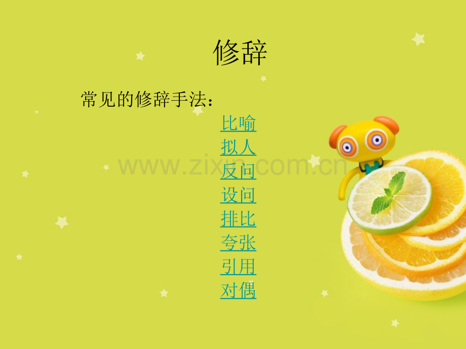 修辞常见的修辞手法:比喻拟人反问设问排比夸张引用对偶比喻比喻1.太阳像个火球慢慢地升起来。太阳像个火球慢慢地升起来。(明喻)(明喻)2.儿童是祖国的花朵。儿童是祖国的花朵。(暗喻)(暗喻)本体本体比喻词比喻词喻体喻体常见的比喻词:像常见的比喻词:像,好像好像,像像一样一样若,如,若,如,如同,仿佛,似,好似等如同,仿佛,似,好似等常见的比喻词:是,成为,变为等常见的比喻词:是,成为,变为等辨析“比喻”须注意:班长像老师一样,有条有理地讲解着。班长像老师一样,有条有理地讲解着。今天小红好像没来学校。今天小红好像没来学校。本体喻体不能是同类不能是同类有相似点有相似点刺猬的身体如同一个长满了钢针的小圆球。刺猬的身体如同一个长满了钢针的小圆球。练一练:下列句子中使用了比喻的是()句。A、像您这样的高个儿干不了这重活儿B、小丽好像看出了我的心思C、皮鞋匠静静地听着。他好像面对着大海D、猎人微笑着说:“在大森林里,你不能像个客人,得像个主人”E、小珍珠鸟好肥,整个身子好像一个蓬松的球儿。拟人:拟人:就是把人以外的事物当作人来写,使它像人一样会说话、有感情、会做人的动作等。例:淘气的小闹钟每天准时把我叫醒。判断下列句子使用了什么修辞手法。每条岭都像慈母那样的温柔。兴安岭多么像少女那样会打扮自己呀!每条岭都那么温柔。兴安岭多么会打扮自己呀!拟人拟人比喻比喻练一练:把下列句子改成拟人句。练一练:把下列句子改成拟人句。顽皮的雨滴像调皮的男孩在雨伞上尽情地跳舞。海棠果像个有礼貌的孩子冲着我点头微笑。天上的星星在闪烁。小鸟在林间鸣叫。反问:只问不答只问不答 明知故问明知故问 答案藏在句子中答案藏在句子中1.难道我会不知道?2.难道我有这么笨吗?3.难道数学真的这么难么?4.那怎么是一样的呢?5.难道我们能浪费时间吗?6.你们怎能破坏环境呢?7.你们怎么能不承认错误呢?我知道。我不笨。数学不难。那是不一样的。我们不能浪费时间。你们不能破坏环境。你们不能不承认错误。(你们要勇于承认错误)答案答案改成陈述句改成陈述句1 1、有不(否定词)去不,无不加不有不(否定词)去不,无不加不(否定词)。(否定词)。2 2、陈陈反:加上反:加上反反问词(怎么、难问词(怎么、难道)和语气词(呢?吗?)道)和语气词(呢?吗?)反问句与陈述句间的转换反问句与陈述句间的转换:陈述句:打仗不是为了多杀人。陈述句:打仗不是为了多杀人。反问句:反问句:难道打仗就是为了多杀难道打仗就是为了多杀人吗?人吗?设问:例:人的聪明才智是天生的吗?不是,是人的聪明才智是天生的吗?不是,是从实践中得来的。从实践中得来的。自问自答自问自答排比:用结构相同或相似、语气一致的一些句子或词组排列起来,表达意义密切相关的内容,借以增强语气。燕子去了,有再来的时候;杨柳枯了,有再青的时候;桃花燕子去了,有再来的时候;杨柳枯了,有再青的时候;桃花谢了,有再开的时候。谢了,有再开的时候。漓江的水真静啊,静得让你感觉不到它在流动;漓江的水真漓江的水真静啊,静得让你感觉不到它在流动;漓江的水真清啊,清得可以看到江底的沙石;漓江的水真绿啊,绿得仿佛那清啊,清得可以看到江底的沙石;漓江的水真绿啊,绿得仿佛那是一块无瑕的翡翠。是一块无瑕的翡翠。夸张:运用丰富的想象,把所要描写的事物故意夸大或缩小的写法叫夸张。例:在巴掌大的监狱里,同志们照常锻炼身体。茉莉花开,香飘万里。这橘子酸得我的牙都快掉了。教室里静得连根针掉在地上也听得到。他饿得都可以把一头大象给吃了。他家穷得快揭不开锅了。引用:在说话或写文章时,引用别人的话或引用大家熟悉的成语、名言警句、典故等。例:中国古时候有个文学家叫做司马迁的中国古时候有个文学家叫做司马迁的说过:人固有一死,或重于泰山,或轻于说过:人固有一死,或重于泰山,或轻于鸿毛。鸿毛。对偶:对偶句结构整齐匀称,读起来琅琅上口。例:两个黄鹂鸣翠柳,一行白鹭上青天。横眉冷对千夫指,俯首甘为孺子牛。风声雨声读书声,声声入耳;家事国事天下事,事事关心。请写出下列句子所用修辞1.1.急忙打开书,一页,两页,我像一匹饿狼,贪急忙打开书,一页,两页,我像一匹饿狼,贪婪地读着。婪地读着。2.2.在书法家的笔下,它们更能生发出无穷无尽的在书法家的笔下,它们更能生发出无穷无尽的变化,或挺拔如峰,或清亮如溪,或浩瀚如海,变化,或挺拔如峰,或清亮如溪,或浩瀚如海,或滑如凝脂。或滑如凝脂。3.3.是谁又吹响了那欢快、柔美的麦哨?是田间玩是谁又吹响了那欢快、柔美的麦哨?是田间玩耍的孩子们。耍的孩子们。4.4.还有什么别的话比这句最简单的话更能表达我还有什么别的话比这句最简单的话更能表达我此时的全部感情呢?此时的全部感情呢?5.5.三十年过去了,弹指一挥间。三十年过去了,弹指一挥间。6.6.风儿轻唱着歌,唤醒了沉睡中的大地。风儿轻唱着歌,唤醒了沉睡中的大地。7.7.“路遥知马力,日久见人心路遥知马力,日久见人心”,日子处久了就,日子处久了就会知道对方的很多东西。会知道对方的很多东西。8.8.神仙饮琼浆玉液长生不老,百姓喝莲塘高粱欢神仙饮琼浆玉液长生不老,百姓喝莲塘高粱欢乐健康。乐健康。比喻比喻排比排比比喻比喻设问设问反问反问拟人拟人夸张夸张