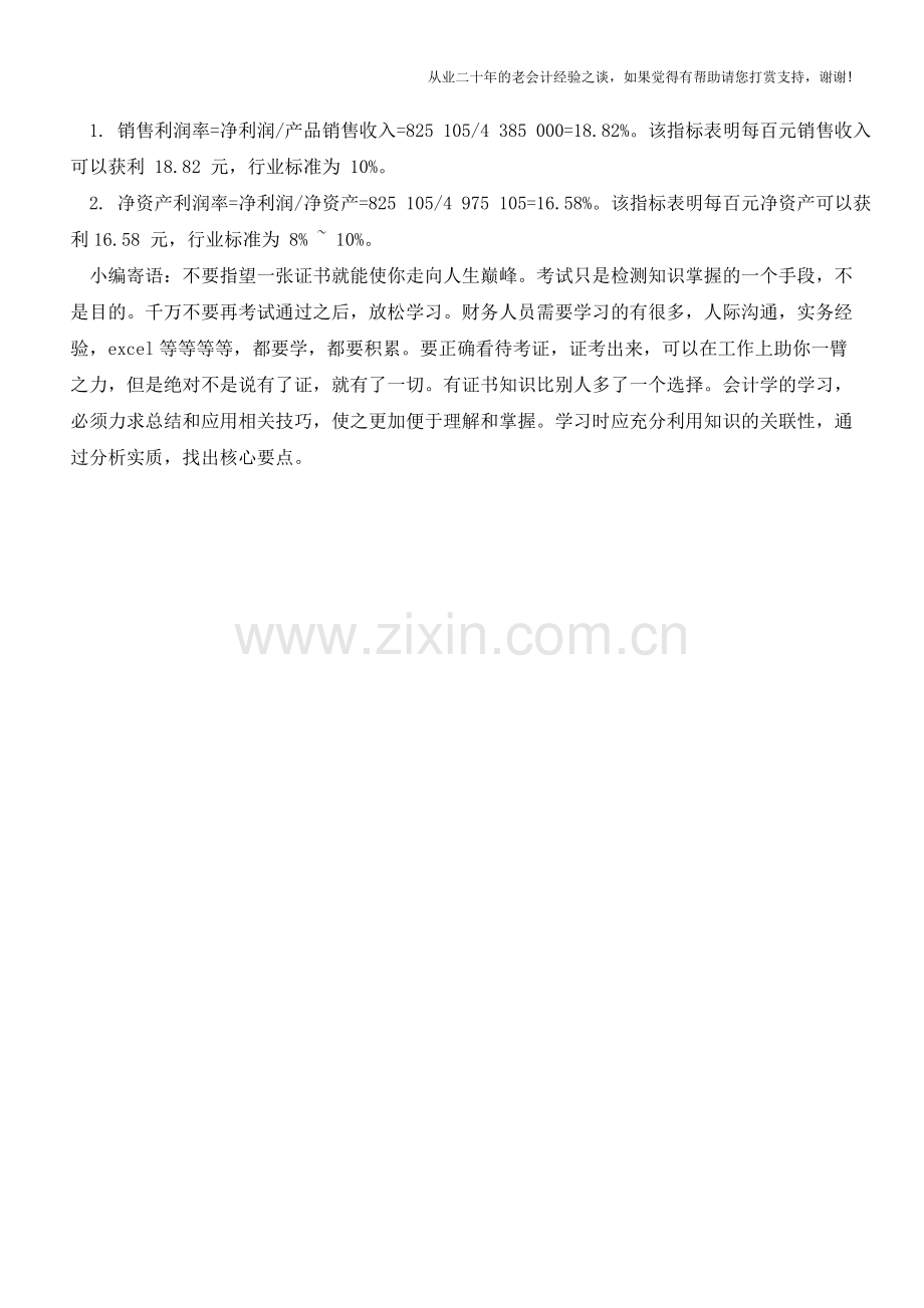 1. 销售利润率=净利润/产品销售收入=825 105/4 385 000=18.82%。该指标表明每百元销售收入可以获利 18.82 元,行业标准为 10%。