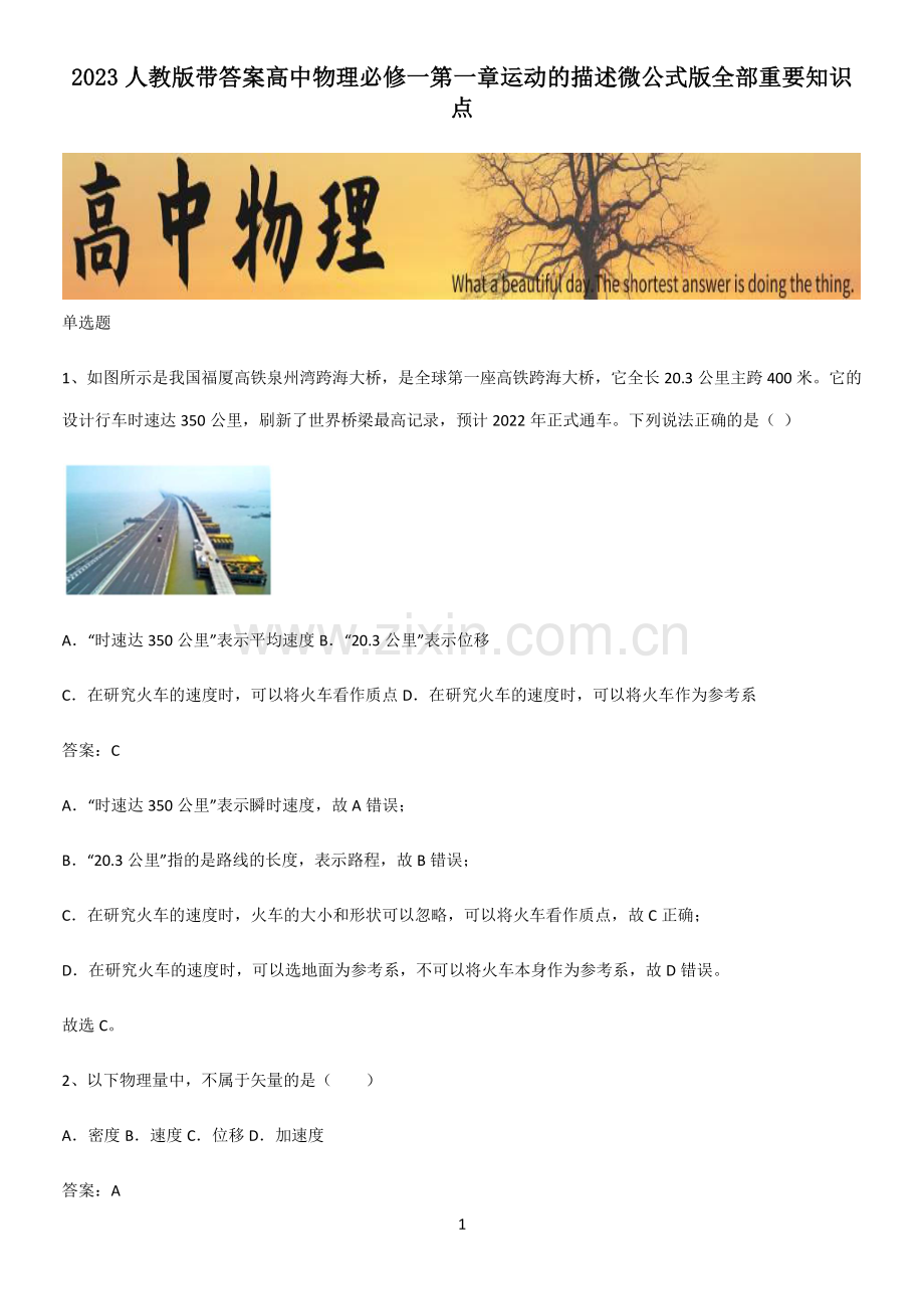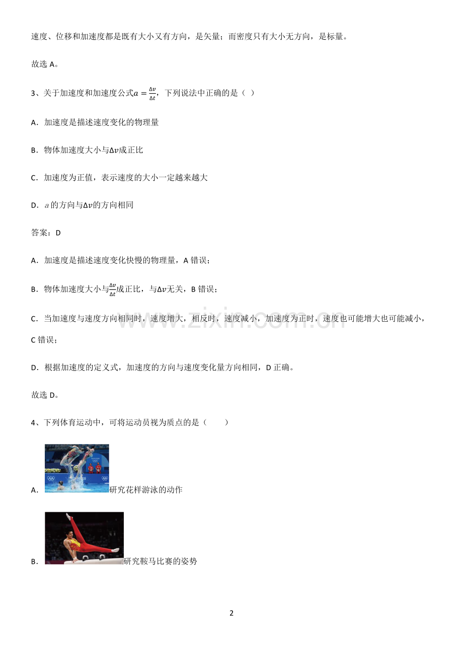 1 20232023 人教版带答案高中物理必修一第一章运动的描述微公式版全部重要知识人教版带答案高中物理必修一第一章运动的描述微公式版全部重要知识点点 单选题 1、如图所示是我国福厦高铁泉州湾跨海大桥,是全球第一座高铁跨海大桥,它全长 20.3 公里主跨 400 米。它的设计行车时速达 350 公里,刷新了世界桥梁最高记录,预计 2022 年正式通车。下列说法正确的是()A“时速达 350 公里”表示平均速度 B“20.3 公里”表示位移 C在研究火车的速度时,可以将火车看作质点 D在研究火车的速度时,可以将火车作为参考系 答案:C A“时速达 350 公里”表示瞬时速度,故 A 错误;B“20.3 公里”指的是路线的长度,表示路程,故 B 错误;C在研究火车的速度时,火车的大小和形状可以忽略,可以将火车看作质点,故 C 正确;D在研究火车的速度时,可以选地面为参考系,不可以将火车本身作为参考系,故 D 错误。故选 C。2、以下物理量中,不属于矢量的是()A密度 B速度 C位移 D加速度 答案:A 2 速度、位移和加速度都是既有大小又有方向,是矢量;而密度只有大小无方向,是标量。故选 A。3、关于加速度和加速度公式=,下列说法中正确的是()A加速度是描述速度变化的物理量 B物体加速度大小与成正比 C加速度为正值,表示速度的大小一定越来越大 Da的方向与的方向相同 答案:D A加速度是描述速度变化快慢的物理量,A 错误;B物体加速度大小与成正比,与无关,B 错误;C当加速度与速度方向相同时,速度增大,相反时,速度减小,加速度为正时,速度也可能增大也可能减小,C 错误;D根据加速度的定义式,加速度的方向与速度变化量方向相同,D 正确。故选 D。4、下列体育运动中,可将运动员视为质点的是()A研究花样游泳的动作 B研究鞍马比赛的姿势 3 C研究马拉松比赛的成绩 D研究羽毛球运动员接球的动作 答案:C A研究花样游泳的动作时,要考虑运动员的动作,不能将运动员视为质点,故 A 错误;B研究鞍马比赛的姿势时,需要观察运动员的姿势,故不能将运动员视为质点,故 B 错误;C研究马拉松比赛时,运动员的大小和体积可以忽略不计,能视为质点,故 C 正确;D研究羽毛球运动员接球的动作时,要观察运动员的动作,故不能视为质点,故 D 错误。故选 C。5、随着新能源轿车的普及,人们对车辆乘坐的舒适性要求越来越高。加速度对时间的变化率物理学中称之为“加加速度”,通常用符号“j”表示,如果j值过大,会形成冲击力,影响乘客乘坐的舒适性。对汽车来说,人体可以承受的 j 值通常在 0.4 1.0 之间。如图为某国产新能源轿车,测得其启动后与时间的变化关系为a=3-0.5t,则()A国际单位制中“加加速度”的单位应是 m/s2 4 Bj为 0 的运动一定是匀速直线运动 C该汽车启动后做匀变速直线运动 D该汽车启动后j的值大小为0.5m/s3 答案:D A由题意,“加加速度”可表示为 =则国际单位制中“加加速度”的单位应是m/s3,故 A 错误;Bj为0代表加速度保持不变,物体的运动可能为匀变速运动,也可能为匀速直线运动,故 B 错误;C由与时间的变化关系 =3 0.5 可知,该汽车加速度随时间均匀变化,故该汽车做的不是匀变速直线运动,故 C 错误;D由 =3 0.5 可知 =0.5m/s3 故该汽车启动后j的值大小为0.5m/s3,故 D 正确。故选 D。6、下面的几个速度中表示平均速度的是()A子弹射出枪口的速度是 800m/s B汽车从甲站行驶到乙站的速度是 40km/h C汽车通过一站牌时的速度是 72km/h 5 D子弹以 790m/s 的速度击中目标 答案:B A枪口是一个位置,所以子弹射出枪口的速度是瞬时速度,故 A 错误;B汽车从甲站沿直线行驶到乙站是一个过程,所以 40km/h 速度是平均速度,故 B 正确;C站牌是一个位置,所以汽车通过一站牌时的速度是瞬时速度,故 C 错误;D击中目标是一瞬时,所以击中目标的速度是瞬时速度,故 D 错误。故选 B。7、关于质点的运动,下列说法中正确的是()A质点运动的加速度为零,则速度为零,速度变化量也为零 B质点的速度变化越快,则加速度越大 C质点在某时刻的加速度不为零,则该时刻的速度也不为零 D位移的方向就是质点的运动方向 答案:B A质点运动的加速度为零,则速度变化量为零,但速度不一定为零,例如匀速直线运动,故 A 错误;B加速度是速度的变化率,则质点的速度变化越快,加速度越大,故 B 正确;C质点在某时刻的加速度不为零,但该时刻的速度可能为零,故 C 错误;D速度的方向是质点运动的方向,但是位移的方向不一定是质点的运动方向,故 D 错误。故选 B。8、2022 年 5 月 4 日上午 8 点 30 分,高二(1)班举行“五四”青年节纪念活动,班主任讲了 10 分钟,团支书讲了 30 分钟,9 点 10 分结束。则下列说法正确的是()A10 分钟是时刻 B上午 8 点 30 分是时刻 6 C30 分钟是时刻 D上午 9 点 10 分是时间间隔 答案:B 10 分钟、30 分钟都指的是时间间隔,上午 8 点 30 分和上午 9 点 10 分是时刻。故选 B。9、下列关于航天领域的说法正确的是()A图甲,观察王亚平在“天宫课堂”做实验时,可将她看成质点 B图乙,“天舟四号”飞船与空间站自主对接时,可将飞船视为质点 C图丙,“神舟十四号”飞船发射后,在研究飞船与火箭分离过程时,飞船可以看成质点 D图丁,“问天”实验舱与空间站对接组合后,研究组合体轨迹时,组合体可视为质点 答案:D A观察王亚平在“天宫课堂”做实验时,需观察王亚平的动作,故不能看成质点,故 A 错误;B“天舟四号”飞船与空间站自主对接时,需观察对接的方位和角度等,两物