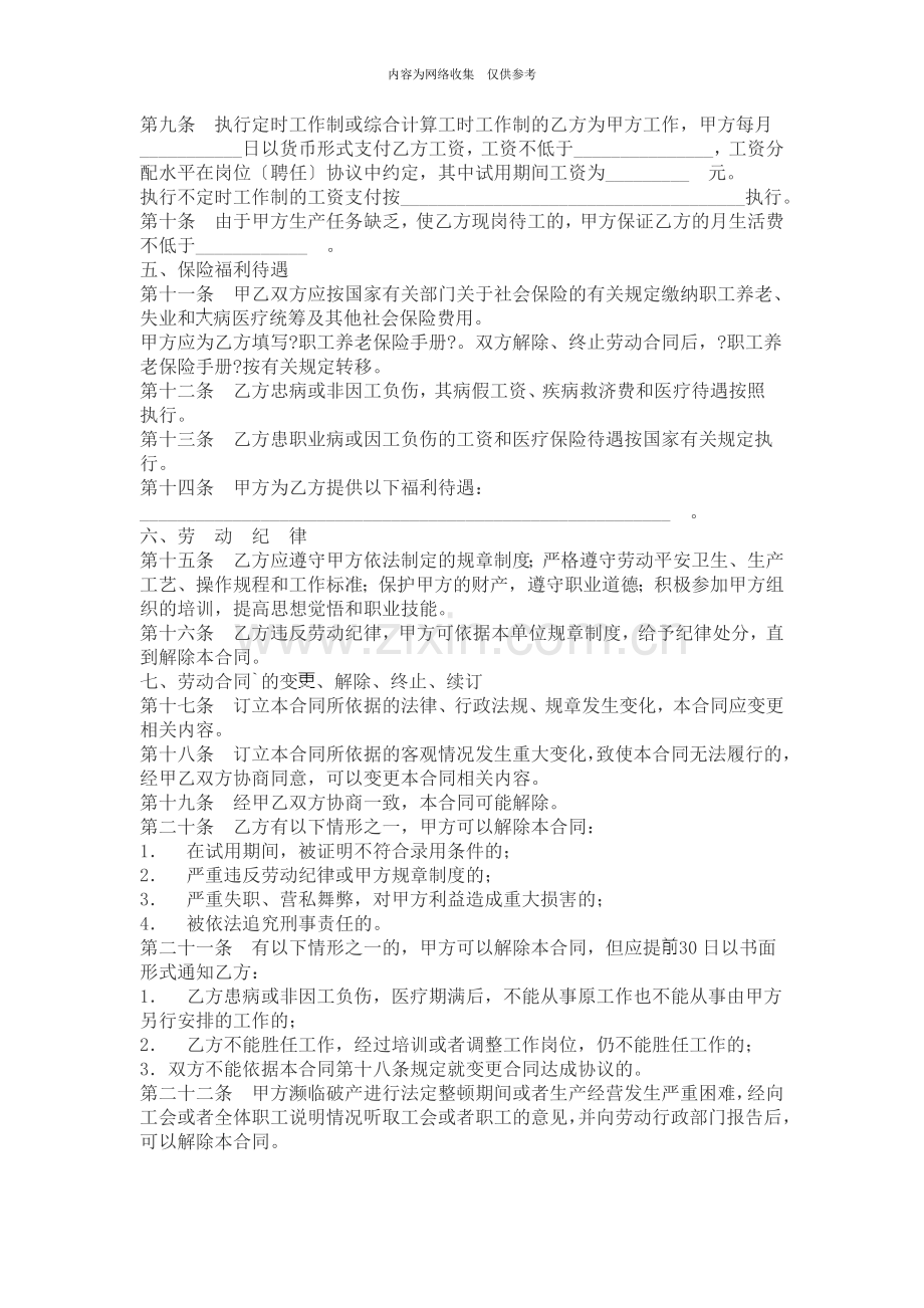 第十六条 乙方违反劳动纪律,甲方可依据本单位规章制度,给予纪律处分,直到解除本合同。