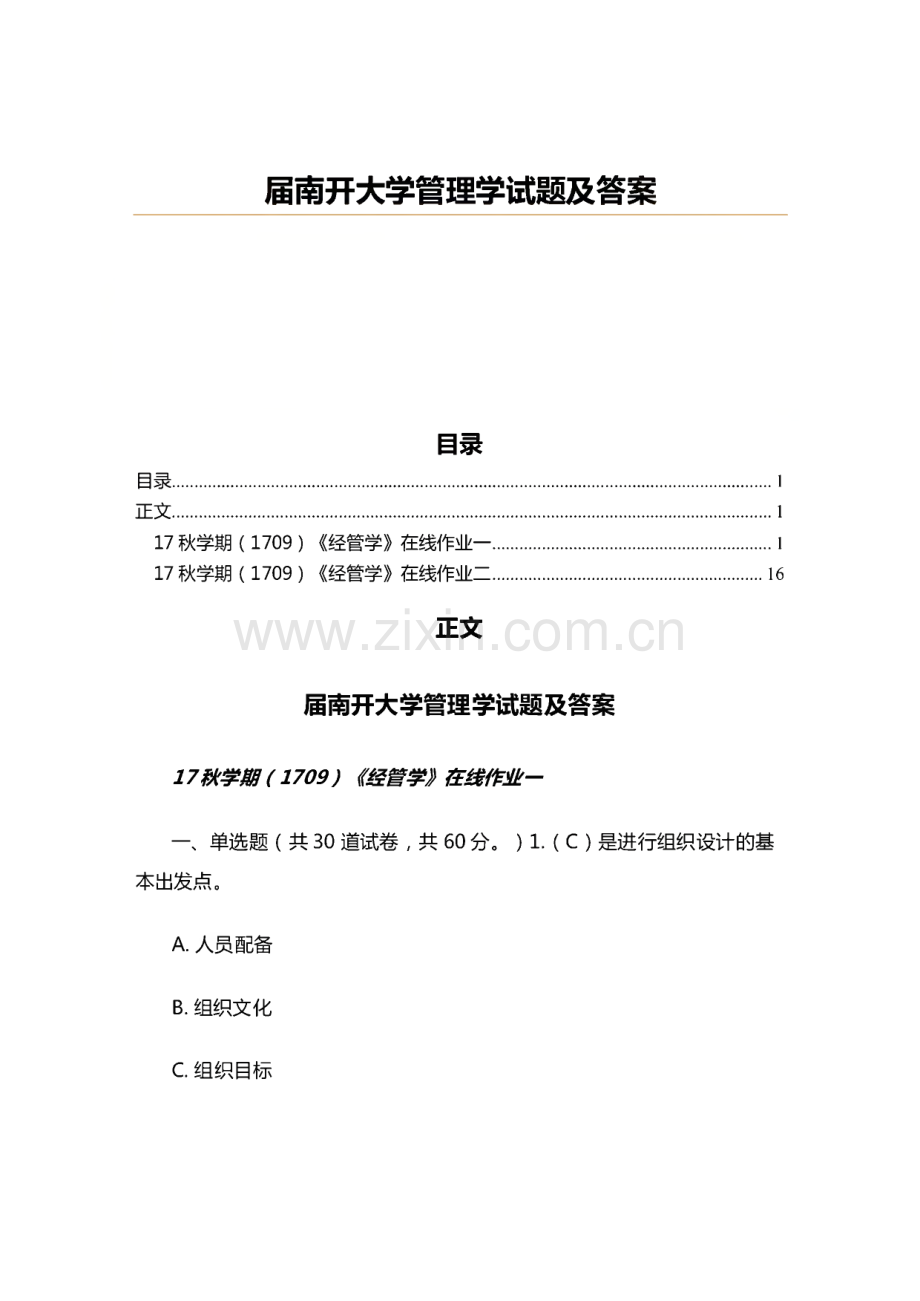届南开大学管理学试题及答案:!目录目录.1正文.117秋学期(1709)经管学在线作业一.117秋学期(1709)经管学在线作业二.16正文届南开大学管理学试题及答案17秋学期(1709)经管学在线作业一一、单选题(共30道试卷,共60分。)1.(C)是进行组织设计的基 本出发点。A.人员配备B.组织文化C.组织目标D.组织结构满分:2分2.领导的特质理论告诉我们.AA.领导是天生的B.领导的行为决定了领导才能C.下属的服从是领导之所以为领导的关键D.领导行为是可以模仿的满分:2分3.决策方法中的“硬技术”是指(A)A.计量决策方法B.专家意见法C.定性决策法D.决策树法满分:2分4.(B)是指企业经管系统随着企业内外部环境 的变化,而不断更新自己的经营理念、经营方针和经营目标,为达此目的,必须相应的改变有关的经管方法和手段,使其与企业的经营目标相适应。A.激励原理B.动态原理C.创新原理D.可持续发展原理满分:2分5.被称为科学经管之父”的经管学家是(A)A.泰勒B.法约尔C.德鲁克D.西蒙满分:2分6.现在很多大公司都实行所谓的“门户开放”政策(比如IBM),即鼓励各级员工通过多种途径直接向公司高层领导反映意 见、提出建议,公司总裁也会设立专门的信箱,以接收这些意见或者抱怨。这里的沟通渠道可以看成是一种(B)A.下行沟通B.上行沟通C.对角沟通D.横向沟通满分:2分7.非程序化决策往往是有关企业重大战略问题的 决策,主要由(B)承担。A.一线工人B.上层经管人员C.中层经管人员D.低层经管人员满分:2分8.下面关于内部招聘的说法不正确的是(B)A.内部员工的竞争结果必然有胜有败,可能影响组织的内部团结。B.内部招聘人员筛选难度大,成本高。C.可能在组织中滋生小集团,削弱组织效能。D.组织内的“近亲繁殖现象,可能不利于个体创新。满分:2分9.(D)是指依靠企业各级行政组织的法定权力,通过命令、指示、规定、制 度、规范以及具有约束性的计划等行政手段来经管企业的方法。A.教育方法B.经济方法C.法制方法D.行政方法满分:2分10.目标经管的提出者是(C)A.泰罗B.法约尔C.德鲁克D.巴纳德满分:2分11.解决复杂问题应采用的沟通方式是(D)A.链式B轮式C.环式D.全通道式满分:2分12.(D)就是对一系列典型的事物进行观察分 析,找出各种因素之间的因果关系,从中找出事物发展变化的一般规律,这 种从典型到一般的研究方法也称为实证研究。A.演绎法B.调查法C.实验法D.归纳法满分:2分13.泰罗经管理论的代表著作是(B)A.经管理论的丛林B.科学经管原理C.有效的经管者D.人的动机理论满分:2分14.曹雪芹虽食不果腹,仍然坚持红楼梦的创作,是出于其:(D)A.尊重需要B.情感需要C.生存需要D.自我实现的需要满分:2分15.决策是工作和日常生活中经常要进行 的活动,但人们对其含义的理解不尽相同,你认为以下哪种理解较完整?(C)A.出主意B.拿主意C.既出主意又拿主意D.评价各种主意满分:2分16.法约尔提出的经管的五项职能是(A)A.计划、组织、指挥、协调和控制B.计划、组织、决策、领导和控制C.计划、组织、决策、协调和控制D.计划、组织、激励、协调和控制满分:2分17.经管的难点与核心是。AA.处理好人际关系B.提高员工的专业和业务水平C,设备等物质资源的配置D.计划满分:2分18.经管方格图中,9-9型对应的是(D)领导方A.任务型B.乡村俱乐部C.贫乏型D.团队型满分:2分19.下面关于集权的局限性的论述错误的是(A)A.会导致上层经管人员的权力部分失控B.缺少弹性和灵活性C.适应外部环境的应变力差D.不利于发展个性,估计不到事物的特殊性满分:2分20.(B)是指 每一备选方案的执行会出现几种不同的情况,各种情况的出现都有一定的概 率,这时的决策就存在着风险。A.确定型决策B.风险型决策C.不确定型决策D.非程序化决策满分:2分21.在职业生涯的(C)阶段,个人已经趋 向于安心现有的工作,将主要精力放在保持现有的位置,而不再表现出先前 的闯劲,但都积累了丰富的工作经验和专业知识。A.探索阶段B.确立阶段C.保持阶段D.衰退阶段满分:2分22.组织中主管人员监督管辖其直接下属的人数 越是适当,就越是能够保证组织的有效运行,这是组织工作应遵循的(C)的内容。A.目标统一原则B.责权一致原则C.适度经管幅度原则D.集权与分权相结合原则满分:2分23.法约尔将企业活动概括为六个 分类,分别是(A)A.技术、商业、财务、安全、会计、经管B.技术、商业、财务、安全、会计、人力资源C.技术、商业、生产、安全、会计、经管D.技术、商业、财务、营销、会计、经管满分:2分24.下面说法不正 确的是(B)A.正前馈是在预测环境条件变化基础上调整控制规范。B.正反馈是在比较控制规范与现实环境要求的差距后矫正执行活动。C.负前馈是在预测工作实绩变化基础上矫正执行活动。D.负反馈是在比较现有工作实绩的差距后矫正执行活动。满分:2分 25.(B)把经管理解为协调人际关系,激发人的积极性,以求达成共同目标 的一种活动。A.古典经管理论B.行为科学理论C.经验主义学派D.经管过程学派满分:2分26.某公司设有:一名总经理,一名主管生 产的副总经理,一名主管营销的副总经理和一名主管财务的总经理,则该公 司划分部门的方法是(B)A.区域部门化B.职能部门化C.顾客部门化D.工艺部门化满分:2分27彳皮得?圣吉的代表性著作是(A)A.第五项修炼B.工业经管和一般经管C.科学经管理论D.车间经管满分:2分28.某公司的固定成本为300万元,单位可 变成本为40元,产