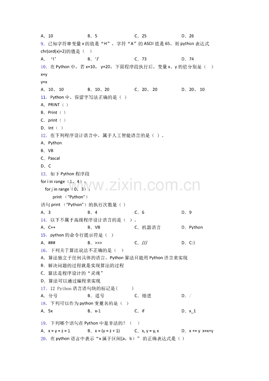 试卷python入门实例复习知识点试卷试题一、选择题1.下列选项都是属于高级语言的是()A.汇编语言、机器语言B.汇编语言、Basic语言C.Basic 语言、Python 语言D.机器语言、Python语言2.下面不是python特性的是():A.免费的 B.简单易学 C.可移植性好 D,是低级语言3.以下Python程序运行后,变量x和st的值分别是()。#第11题程序X=123+678St=123+678A.801 123678 B.801“123678”C.801 801 D,123678“123678”4.下列Python表达式的值为偶数的是()A.12*3%5 B.len(“Welcome”)C.int(3.9)D.abs(-8)5.Python表达式中,可以使用()控制运算的优先顺序。A.圆括号()B.方括号口 C.大括号 D.尖括号6.在Python中以下语句正确的是()。A.51jb=51jb B.for=51jb C.j,b=b,j D.这是一段测试代码7.运行Python程序的过程中出现了如下图错误提示,原因是()。51study=ChineseFile,line 1 51study=chinesereSyntaxError:3:y=2*x else:y=3*x+l print(y)A.10 B.5C.25D.269.已知字符串变量x的值是“H”,字符“A”的ASCII值是65,则python表达式chr(ord(x)+2)的值是()A.T B,C.73D.7410.在 Python 中,若 x=10,y=20,下面程序段执行后,变量x、y的值分别是(x=yy=xA.10、10 B.10、20C.20、20D.20、1011.Python中,保留字写法正确的是()A.PRINT()B.Print()C.print()D.Int()12.在下列程序设计语言中,属于人工智能语言的是()。A.PythonB.VBC.PascalD.C13.如下Python程序段for i in range(1,4):for j in range(0,3):print(Python)A.算法独立于任何具体的语言,Python算法只能用Python语言来实现B.解决问题的过程就是实现算法的过程C.算法是程序设计的“灵魂”D.算法可以通过编程来实现语句print(Python)的执行次数是()A.3 B,4 C.6D.914.以下不属于高级程序设计语言的是()。A.C+B.VB C.机器语言15.python的命令行提示符是()D.PythonA.#B.C.Ill16.下列关于算法说法不正确的是()D.C:17.12 Python语言语句块的标记是()A.分号 B.逗号 C.缩进18.下列可以作为python变量名的是()A.5x B.x-1 C.ifD./D.x_l19.下列哪个语句在Python中是非法的?()A.x=y=z=l B.x=(y=z+1)C.x,y=y,xD.x+=y x=x+y20.在python语言中表示“x属于区间a,b)”的正确表达式是()A.aWxorxvb B.a=x and x bC.aWxandxvbD.a=x or xb21.python3解释器执行not land 1的结果为()。A.True B.FalseC.0D.122.Python语言属于()A.自然语言 B,汇编语言C.机器语言D.高级语言23.()不是程序设计高级语言。A.PythonB.BasicC.C+D.伪代码24.下列python表达式结果最小的是()A,2*33+8%2*3 B.5*2%3+7%2*2 C.1314/100%10 D.int(l+5)/325.关于Python语言的特点,以下选项描述正确的是()A.Python语言不支持面向对象B.Python语言是解释型语言C.Python语言是编译型语言 D.Python语言是非跨平台语言26.计算机能直接接收和执行的程序设计语言为()A.Visual Basic语言 B.Python语言 C.机器语言 D.自然语言27.列表在python中的作用非常强大,它可以包含多个数据元素,下面是列表的数据元素()0A.整数 B,浮点数 C.字符串 D,以上都是28.已知下列Python程序段,k取下列哪组值是x=4?()for i in range(lO):k=int(input()if k0:if k15:if k18:x=0else:x=l else:if k12:x=4else:x=5A.13,16 B,13,14,15 C,16,17,18D.18,1929.python 中表达式 4*3=()。A.12 B.1 C.64D.730.Python的关系运算符中,用来表示不等于的符号是()A.=B.!=C.=D.b And b3的值是()A.False B.True C.-1D.132.如下Python程序段 x=2 print(x+1)print(x+2)运行后,变量x的值是()35.在Python中,下列循环结构用法错误的是()。A.2 B,3 C.5D.33.下列Python程序段运行的结果是()x=0for i in range(l,20,3):x=x+iprint(x)A.80 B,190 C.7034.在编写python程序时缩进的作用是()。D.210A.让程序更美观 B.只在for循环中使用C.只在if语句中使用 D.用来界定代码块A.for i in range(20):B.for i in range(0z10):C.for i in range(10,0,2):D.while s50:36.下列Python程序段运行的结果是()。i=0sum=0while i10:if i%3=0:sum+=ii+=l print(sum=,sum)A.sum=9 B.sum=10 C.sum=18 D.sum=19a+b37.把数式一 写成Python语言的表达式,下列书写正确的是()。2aA.a+b/2a B.a+b/2*a C.(a+b)/2*a D.(a+b)/(2*a)38-应用软件是为满足用户不同领域、不同问题的应用需求而设计的软件。以下不属于应 用软件的是()A.Word B.微信 C.考试系统 D.python39.小新编制了一个python程序如下,但程序无法执行,你帮他找出程序中一共有几处错 误()la=3b=input()c=a+b printf c)A.1B.2C.3D.440.利用Python程序绘制x-y的散点图,2.5-2.0-1.5-1.0-0.5-wlll+|q|三I s|A.pit.plot(X,Y)C.pit.bar(X,Y)0.5 1.0 1.5 2.0 2.5则下列程序第5行应该填写的代码是()。#绘制散点图,matplotlib.pyplot 二 pit X=0.5,1,1.5,2,2.5_Y=0.49,1.02,1.47,2.02,2.51show()B.pit.scatter(X,Y)D.pit.boxplot(X,Y)41.在P ython Shell环境下,依次执行下列语句后,显示结果()。data=172,9,165,29,156,21 max(data)A.9 B,165 C.172 D.2142.下列不可以用来搭建本地服务器的软件是()(1)Python(2)Excel(3)IIS(4)ApacheA.B.C.D.43.Python定义私有变量的方法为。()A.使用private关键字B.使用public关键字C.使用DEF定义变量名D.使用_XX定义变量名44.若用整型变量k表示某天是星期几(例如k=l表示该天是星期一、k=2表示该天是星期 二k=7表示该天是星期天),则下列能够正确表示k的下一天是星期儿的python表达 式为()A,k+1 B,k%7+l C.(k+1)%7 D,(k+l)%7-l45.Python 中,可以输出 hello world 的是()A.printf(hell。world)B.output(helloworld)C.Print(hell。+world)D.print(hell。world)46.有关循环结构的说法不正确的是()。A.循环结构是算法的基本结构之一B.有的的程序设计中没有循环结构C.循环结构在程序设计有可能会有嵌套出现D.在PYTHON程序设计语言中循环结构一般使用IF语句实现。47.下列有关于print命令的描述中,正确的是()A.在打印机里打印相关的文本或者数字等B.可以用来画图C.在屏幕中输出相应的文本或者数字等D.执行语句print(python,3.7)时会出