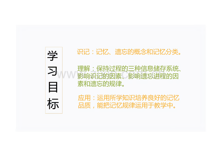 第四章 记忆学 习 目 标识记:记忆、遗忘的概念和记忆分类。理解:保持过程的三种信息储存系统、影响识记的因素、影响遗忘进程的因 素和遗忘的规律。应用:运用所学知识培养良好的记忆 品质,能把记忆规律运用于教学中。4_-H-第一”记忆概述一、记忆的概念记忆是人脑对过去 经验的识记、保持和再 现(再认和回忆)的心 理过程。从信息加工理 论的角度看,记忆就是 对外界信息的输入、编 码、存储和提取的过程。二、记忆的测量方法人脑记忆的容量惊人。据估计,人脑约有 140亿个神经细胞,可以存储全世界图书馆 所有的图书信息;而一般人只使用了大约 10%的大脑功能,绝大部分潜能尚待开发。常用的记忆测量方法有以下几种。1.再认法再认法用来测量再认能力。该方法的具体操作过程是,先向被测者呈现识记 的材料,如英文单词或数字等,时间常为30秒钟,然后把识记过的材料与等量的 未识记的材料随机排列,再呈现给被测者辨认,说出哪些是已经识记过的材料。二、记忆的测量方法2.回忆法回忆法用来测量学生的回忆能力。该方法的具体操作过程是,用一连串的数字 作为测验材料(如表4-1所示),让被测者任选一行,在1分钟内读完,然后 把记住的数字写出来(可以不按顺序)。表4-1测量记忆能力的数字表第一行13213426191733456574528431第二行25357431528453197326836592二、记忆的测量方法3.再学法(节省法)该方法的具体操作过程是,先让被测者学习 一些材料,经过一定的时间后,让其重新学习这 些材料,然后比较前、后两次学习所用的时间或 次数的相差数值,以节省的时间或次数多少为指 标来衡量记忆的效果。节省的效果即保持量的计 算公式,该公式为保持量二(初学所用的时间或 次数-再学所用的时间或次数):初学所用的时 间或次数。三、记忆的分类(-)根据记忆的内容划分1.形象记忆形象记忆是指以 感知过的事物的具体 形象为内容的记忆。2.语义记忆语义记忆又称为 语义-逻辑记忆,是个 体对主要以词语为表达 方式的知识的记忆。3.情境记忆情境记忆是指对 个人亲身经历过的、发生在一定时间和地 点的事情的记忆。三、记忆的分类(-)根据记忆的内容划分4.情绪记忆情绪记忆是以个体对曾经体验过的 情绪或情感为内容。5.动作记忆动作记忆又称为运动记忆,是以个 体过去经历过的身体运动状态或动作形 象为内容的记忆。(二)根据信息加工处理与储存的方式划分L陈述性记忆陈述性记忆是对陈述性知识的记忆,是对有关事实和事件的记忆。它可以通 过语言的传授而一次性获得,它的提取 往往需要意识的参与。2.程序性记忆程序性记忆是对具有先后顺序的活动的记忆,是对如何做事情的记忆,主要包括认知技能、运动技能等内容。这种记忆往往需要通过多次尝试才能 逐渐获得,而且在提取、使用时可以不需要意识的参与。(三)根据记忆时有无意识的参与划分根据记忆时有无意识的参与划分,记忆可分外显记忆和内隐记忆。1.外显记忆外显记忆是指个体有意识或主动地收集某些经验来完成当前作业的记忆。这种记忆是个体有意识回忆的,因此又称为意识控制的记忆。2.内隐记忆内隐记忆是指在无意识的情况下,个体过去的经验自动对当前的作业产 生影响的记忆。(三)根据记忆时有无意识的参与划分研究表明,外显记忆和内隐记忆在认知加工方面具有很大的差异。其主 要体现在以下几个方面:第一是加工深度,内隐记忆受学习者认知加工深度的影响远小于外显记忆。第二是保持时间,内隐记忆和外显记忆的保持时间不同,内隐记忆的保持时 间更持久。第三是记忆负荷量,对外显记忆而言,记忆的项目越多,记忆的效果越不好。第四是呈现方式,感觉通道的改变。第五是干扰因素,干扰因素更容易对外显记忆产生影响,但对内隐记忆的影 响不大。(四)根据记忆保持时间的长短划分Q1.感觉记忆感觉记忆在记忆系统的第一阶段,是一种原始的感觉形式,是记忆系统 在对外界信息进行进一步加工之前的暂时记忆。感觉记忆也称为瞬时记忆,是 当客观刺激停止作用以后,感觉信息在一个极短的时间内被保存下来的记忆。(四)根据记忆保持时间的长短划分2.短时记忆短时记忆又称为操作记忆或工作记忆,是指信息一次呈现 后,保持时间在1分钟之内的记忆。它是感觉记忆和长时记忆 的中间阶段。(四)根据记忆保持时间的长短划分3.长时记忆长时记忆是指信息经过充分和有一定深度的加工后,在头脑 中长时间保存下来的记忆。长时记忆又称为永久性记忆,信息在 记忆中可以保持很长时间,为1分钟以上,甚至终生。长时记忆构 成了个体关于外界和自身的全部知识和经验。四、记忆的形式客观现实的外界刺激物具有物理 特征,人必须把这些物理特征转换成 具有心理特性的形式,才能被储存和 取用。经过转换的具有心理特性的记 忆形式主要是记忆表象和词语,人依 靠这两类形式储存信息。(-)记忆表象曾经感知的事物不在眼前,而在头 脑中再现出来的心理形式就是记忆表象。客观现实是记忆表象形成的源泉,也是 检验记忆表象是否符合实际的标准。1.直观性知觉形象和记忆表象都具有直观性,知觉形象是在客观事物直接刺激下产生的。2.概括性记忆表象与知觉形象在概括性方面也有区别。知觉形象概括的是事物的个别 属性,它是当前事物的具体映像。(二)词语利用词语形式记