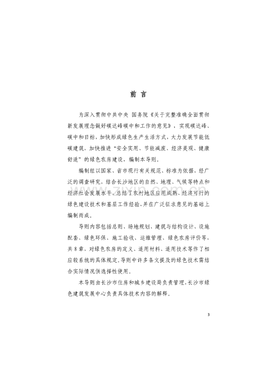 长沙市绿色农房 建设与评价技术导则(试行)前言为深入贯彻中共中央国务院关于完整准确全面贯彻 新发展理念做好碳达峰碳中和工作的意见,实现碳达峰、碳中和目标,加快形成绿色生产生活方式,大力发展节能低 碳建筑,加快推进“安全实用、节能减废、经济美观、健康 舒适”的绿色农房建设,编制本导则。编制组以国家、省市现行有关规范、标准为依据,经广 泛的调查研究,结合长沙地区的自然、地理、气候等特点和 经济社会发展水平,总结了农村地区应用成熟、经济可行的 绿色建设技术和基层工作经验,并在广泛征求意见的基础上 编制而成。导则内容包括总则、场地规划、建筑与结构设计、设施 配套、绿色环保、施工验收、运维管理、绿色农房评价等,共8章,对绿色农房的定义、适用材料、适用技术等作了相 应较系统的具体规定。导则中许多条文提及的绿色技术需结 合实际情况供选择性使用。本导则由长沙市住房和城乡建设局负责管理,长沙市绿 色建筑发展中心负责具体技术内容的解释。3目录1总则.12场地规划.32.1选址.32.2建筑平面.32.3建筑风貌.43建筑与结构设计.53.1建筑设计.53.2结构设计.54设施配套.75绿色环保.85.1 一般规定.85.2室内外环境.96施工验收.107运维管理.117.1养护房屋构件.117.2维护环境风貌.117.3促进资源利用.118绿色农房评价.13附件1长沙市绿色农房评价控制项指标.14附件2长沙市绿色农房评价选择项指标.1751总则1.0.1为落实国务院关于印发2030年前碳达峰行动方案 的通知和中共中央办公厅 国务院办公厅关于推动城乡 建设绿色发展的意见等文件精神,根据湖南省农村住房 建设管理办法、长沙市农村村民住宅建设管理条例等 文件要求,积极引导和规范长沙市绿色农房建设,探索长沙 市绿色农房建设适应“碳达峰、碳中和”行动要求的发展路 线,推广减碳降碳技术,延长农房使用寿命,改善农村居住 功能,提升农村人居环境,打造绿色生态宜居的美丽乡村,根据长沙市实际,制定本导则。1.0.2绿色农房是指功能现代、风貌协调、成本经济、结 构安全、绿色环保的三层及以下的农村住房。1.0.3本导则适用于长沙市行政区域内在农村地区新建、改建、扩建的绿色农房建设和评价。1.0.4绿色农房应基于长沙地区的气候、资源、经济差异,因地制宜采用新设计、新体系、新工艺、新模式,实现“功 能现代、风貌协调、成本经济、结构安全、绿色环保”的目 标。11.0.5绿色农房建设应从布局、设计、配套、施工、运维 全过程综合考虑,使农房在全寿命周期内,最大限度地节约 资源,充分考虑经济性和环保性,为居民提供健康舒适的空 间。1.0.6绿色农房建设应充分考虑经济性,建设成本符合当 地农村经济发展状况及农民生活水平。1.0.7长沙市绿色农房的建设除符合本技术导则外,尚应 符合国家、行业及省、市现行有关标准、规定。22场地规划2.1 选址2.1.1 绿色农房的建设场地应符合农村土地管理相关规 定,不得超出规划确定的用地范围和用地面积,尽量使用原 有宅基地、空闲地和其他未利用地,不应占用耕地。2.1.2 选址应无洪灾、地震、滑坡、泥石流、塌陷高危区 等自然灾害的威胁,无危险化学品、易燃易爆危险源的威胁,无电磁辐射、含氧土壤等危害,符合各类保护区、文物古迹 保护的控制要求。2.1.3 选址应保护场地原有地形地貌,应保护古树林木、水系等。2.1.4选址应同时满足湖南省农村住房建设质量安全指导 手册的要求。2.2 建筑平面2.2.1 绿色农房布局、朝向、间距应有利于夏季通风、屋 面隔热和遮阳,并应兼顾冬季防风,应保证居住空间获得良 好的日照和采光。2.2.2 绿色农房应充分考虑居住实态、家庭构成和功能分 3区,空间划分上基本做到寝居分离、食寝分离、净污分离、人畜分离、农机分离。2.2.3 厨房应直接对外采光通风,防止炊事油烟排放造成 的室内空气污染和中毒,保持室内适宜的温湿度,防止潮湿 和霉菌滋生。厨房应与建筑内的其他部位采取防火分隔措 施,如使用传统炉灶,应设置烟囱,并预备灭火器等消防设 施。2.2.4 卫生间应采用天然采光、自然通风,地面应做防水 处理,下水管道应预留检修口,地面面层应采用防水、防滑 及易清洁材料。2.3建筑风貌2.3.1房屋设计应在建筑形式、细部设计和装饰方面充分 吸取当地农房屋顶形式、山墙特征、立面构成肌理、色彩运 用等,应与乡土风貌和地域特色保持协调。2.3.2房屋的屋顶、墙体等建筑主体高度、立面比例应与 周围环境相协调。2.3.3鼓励使用当地的石材、生土、竹木等乡土材料,选 用较为协调的建筑色彩。43建筑与结构设计3.1 建筑设计3.1.1 居住空间组织宜具有一定的灵活性,可分可合,满 足不同时期家庭结构变化的居住需求,避免频繁拆改。3.1.2 绿色农房设计宜为一至三层建筑,三层绿色农房设 计布局宜为一层宜具备厅堂、餐厅、厨房、卫生间、楼梯间、老人房、库房等功能空间,二层宜设置家庭厅、主卧、次卧、主卧卫生间、公用卫生间;三层宜设有卧室、存储房或活动 室、卫生间。3.1.3 应采用无障碍设计,便于老人、残疾人使用。3.1.4 应依据方便生产的原则设置农机具房、农作物储藏 间等辅助用房,并与主房适当分离。3.2结构设计3.2.1绿色农房建设应从基础、墙柱、梁板材料和结构等 方面注重提升质量安全,做好防灾减灾措施,一般保证农房 实际使用寿命在3