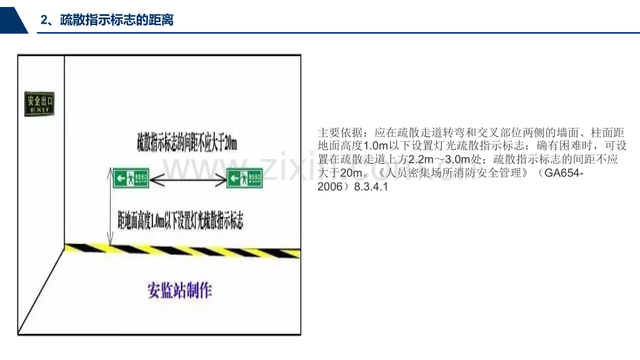 各种安全距离示意图解1、仓库的安全距离主要依据:每个堆垛面积不应大于150平米。仓储场所消防安全管理通则(GA1131-2014)6.7库房主通道宽度不应小于2米。仓储场所消防安全管理通则(GA1131-2014)6.7物品堆垛与堆垛之间的距离不小于1米。仓储场所消防安全管理通则(GA1131-2014)6.8物品与照明灯之间的距离不小于0.5米。仓储场所消防安全管理通则(GA1131-2014)6.8物品与墙之间的距离不小于0.5米。仓储场所消防安全管理通则(GA1131-2014)6.8物品堆垛与柱之间的距离不小于0.3米。仓储场所消防安全管理通则(GA1131-2014)6.8储存物品与风管、供暖管道、散热器的距离不应小于0.5米。与供暖机组、风管炉、烟道之间的距离在各个方向上都不应小于1米。仓储场所消防安全管理通则(GA1131-2014)6.14主要依据:应在疏散走道转弯和交叉部位两侧的墙面、柱面距地面高度1.0m以下设置灯光疏散指示标志;确有困难时,可设置在疏散走道上方2.2m3.0m处;疏散指示标志的间距不应大于20m。人员密集场所消防安全管理(GA654-2006)8.3.4.12、疏散指示标志的距离3、液化石油气钢瓶安全距离主要依据:气瓶与燃具的净距不应小于05m。城镇燃气设计规范(GB50028-2006)8.7.2软管与家用燃具连接时,其长度不应超过2m,并不得有接口。城镇燃气设计规范(GB50028-2006)10.2.84、消防器材安全距离主要依据:灭火器的摆放应稳固,其铭牌应朝外。手提式灭火器宜设置在灭火器箱内或挂钩、托架上,其顶部离地面高度不应大于1.50M;底部离地面高度不宜小于0.08M。灭火器箱不得上锁。建筑灭火器配置设计规范(GB50140一2005)5.1.3防火卷帘门两侧各0.5m范围内不得堆放物品,并应用黄色标识线划定范围。人员密集场所消防安全管理(GA654-2006)8.3.7室外消火栓不应埋压、圈占;距室外消火栓、水泵接合器2.0m范围内不得设置影响其正常使用的障碍物。人员密集场所消防安全管理(GA654-2006)7.6.2.35、工厂车间布置主要依据:机床与划线或检验平板之间的最小距离应不小于1300mm平板与墙壁间的距离应不小于500mm。金属切削加工安全要求(JB77411995)4.5.3车间横向主要通道根据需要设置其宽度不应小于2000mm。金属切削加工安全要求(JB77411995)4.6.3机床之间的次要通道宽度一般不应小于1000mm。金属切削加工安全要求(JB77411995)4.6.4主要通道两边堆码的物品高度不应超过1200mm且高与底面宽度之比不应大于3,堆垛间距不应小于500mm。金属切削加工安全要求(JB77411995)4.6.6机床间的最小距离不应小于0.7米;机床至墙壁的最小距离不应小于0.7米。金属切削加工安全要求(JB7741-1995)4.5.26、一级石油库安全距离主要依据:甲B、乙类液体:地上罐组;甲B,乙类覆土立式油罐;无油气回收设施的甲B、乙A类液体装卸码头(一级库):距离居民区和公共建筑物100米,距离工矿企业60米,距离国家铁路线60米,距离工业企业铁路线35米,距离道路25米。7、石油库外墙安全距离主要依据:小型民用爆炸物品储存库安全规范(GA8382009)7.5储存库距露天爆破作业点边缘的距离应按GB6722的要求核定,且最低不应小于300m。8.4储存库区四周应设密实围墙,围墙到最近储存库墙脚的距离不宜小于5m,围墙高度不应低于2m,墙顶应有防攀越的措施。8.6工业炸药及制品、工业导爆索、黑火药地面储存库之间最小允许距离不应小于20m,上述储存库与雷管储存库之间最小允许距离不应小于12m。8.6值班室距工业炸药及制品、工业导爆索、黑火药库房的最小允许距离应符合表4要求,距雷管库房的距离不应小于20m。10.1储存库门口8m范围内不应有枯草等易燃物,储存库区内以及围墙外15m范围内不应有针叶树和竹林等易燃油性植物。8、小型民爆库安全距离(1)主要依据:小型民用爆炸物品储存库安全规范(GA8382009)9.1.4储存库内任一点到门口的距离不应大于15m,门的宽度不宜小于1.5m,高度不宜小于2.0m。10.1储存库门口8m范围内不应有枯草等易燃物,储存库区内以及围墙外15m范围内不应有针叶树和竹林等易燃油性植物。16.2.3堆垛之间应留有检查、清点民用爆炸物品的通道,通道宽度不应小于0.6m,堆垛边缘与墙的距离不应小于0.2m,宜在地面画定置线。16.2.4各种民用爆炸物品整箱堆放高度,工业雷管、黑火药不应超过1.6m,炸药、索类不应超过1.8m,宜在墙面画定高线。16.4.5民用爆炸物品的装卸作业宜在白天进行,押运员应在现场监装,无关人员和车辆禁止靠近,运输车辆离库门不应小于2.5m。9、小型民爆库安全距离(2)主要依据:小型民用爆炸物品储存库安全规范(GA8382009)9.1.4储存库内任一点到门口的距离不应大于15m,门的宽度不宜小于1.5m,高度不宜小于2.0m。10.1储存库门口8m范围内不应有枯草等易燃物,储存库区内以及围墙外15m范围内不应有针叶树和竹林等易燃油性植物。16.2.3堆垛之间应留有检查、清点民用爆炸物品的通道,通道宽度不应小于0.6m,堆垛边缘与墙的距离不应小于0.2m,宜在地面画定置线。16.2.4各种民用爆炸物品整箱堆放高度,工业雷管、黑火药不应超过1.6m,炸药、索类不应超过1.8m,宜在墙面画定高线。16.4.5民用爆炸物品的装卸作业宜在白天进行,押运员应在现场监装,无关人员和车辆禁止靠近,运输车辆离库门不应小于2.5m。10、临时架空线安全距离主要依据:临时线路必须采用绝缘良好的导线,其截面应能满足用电负荷和机械强度的需要。应用电杆或沿墙用合格瓷瓶固定架设,导线距地面的高度室内应不低于2.5米,室外不低于4.5米,与