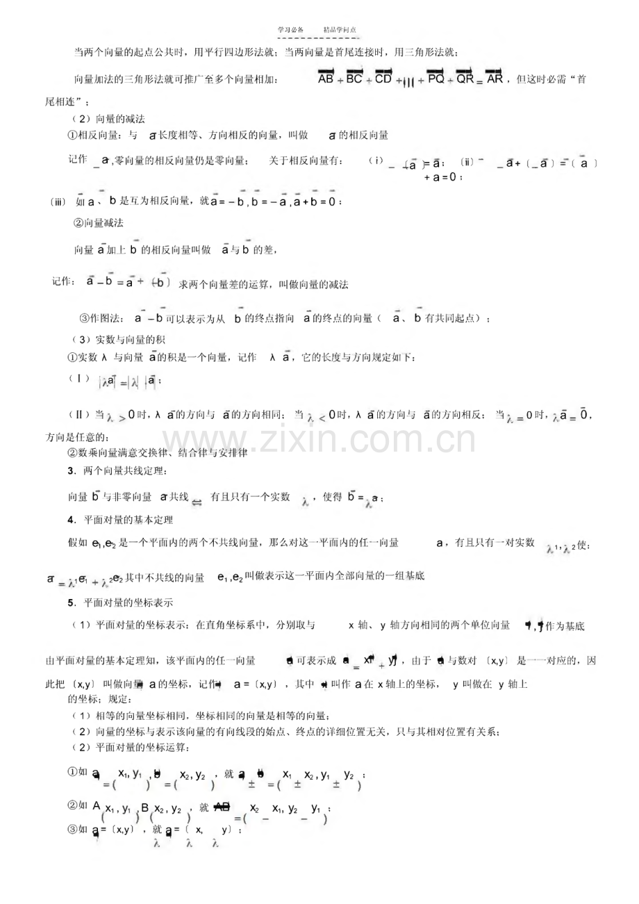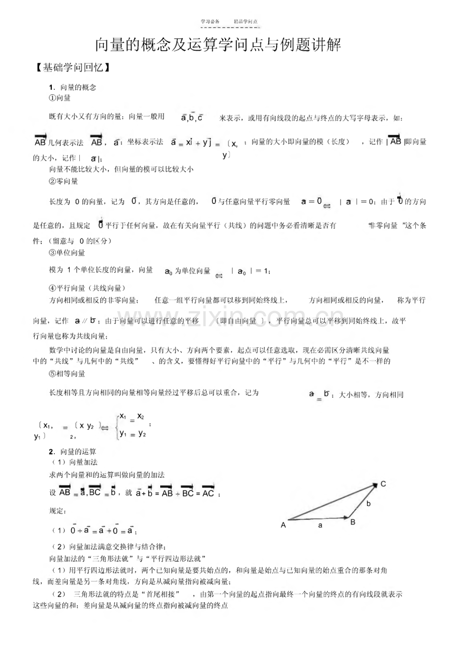学习必备精品学问点向量的概念及运算学问点与例题讲解【基础学问回忆】1.向量的概念向量既有大小又有方向的量;向量一般用 a,b,c 来表示,或用有向线段的起点与终点的大写字母表示,如:AB几何表示法,a;坐标表示法 a=xi+yj=x,;向量的大小即向量的模(长度),记作|下官呷向量 的大小,记作I ar|;y)向量不能比较大小,但向量的模可以比较大小 零向量长度为。的向量,记为0,其方向是任意的,0与任意向量平行零向量 a=0_|a 1=0;由于电的方向是任意的,且规定6平行于任何向量,故在有关向量平行(共线)的问题中务必看清晰是否有 非零向量”这个条件;(留意与。的区分)单位向量模为1个单位长度的向量,向量%为单位向量_|a0 1=1;r平行向量(共线向量)方向相同或相反的非零向量;任意一组平行向量都可以移到同始终线上,方向相同或相反的向量,称为平行向量,记作ab;由于向量可以进行任意的平移 即自由向量),平行向量总可以平移到同始终线上,故平行向量也称为共线向量;数学中讨论的向量是自由向量,只有大小、方向两个要素,起点可以任意选取,现在必需区分清晰共线向量 中的“共线”与几何中的“共线”、的含义,要懂得好平行向量中的“平行”与几何中的“平行”是不-样的 相等向量长度相等且方向相同的向量相等向量经过平移后总可以重合,记为 a_5;大小相等,方向相同rXi=x2(Xi,=x y2 J-;yj 2,=V22.向量的运算(1)向量加法求两个向量和的运算叫做向量的加法设斌=S,BC=8,就 a+b=症+制二乱规定:/b-A a(1)0+a=a-0=a;(2)向量加法满意交换律与结合律;向量加法的“三角形法就”与“平行四边形法就”(1)用平行四边形法就时,两个已知向量是要共始点的,和向量是始点与已知向量的始点重合的那条对角 线,而差向量是另一条对角线,方向是从减向量指向被减向量;(2)三角形法就的特点是“首尾相接”,由第一个向量的起点指向最终一个向量的终点的有向线段就表示 这些向量的和;差向量是从减向量的终点指向被减向量的终点学习必备 精品学问点当两个向量的起点公共时,用平行四边形法就;当两向量是首尾连接时,用三角形法就;向量加法的三角形法就可推广至多个向量相加:a+b5+cS+|+p3+q=aS,但这时必需“首尾相连”;(2)向量的减法相反向量:与ar长度相等、方向相反的向量,叫做 a的相反向量记作_a,零向量的相反向量仍是零向量;关于相反向量有:(D _ 4.a)=a;5)-_ a+(_a)(a)+a=0;(iii)iii a b 是互为相反向量,就a=-b,b=-a,a+b=0:向量减法向量或加上b的相反向量叫做 5与b的差,记作:a _b=a+求两个向量差的运算,叫做向量的减法作图法:a-b可以表示为从b的终点指向5的终点的向量(a b有共同起点);(3)实数与向量的积实数人与向量5的积是一个向量,记作 入a,它的长度与方向规定如下:闸=树回(II)当人0时,入Q的方向与目的方向相同;当九0时,入方的方向与白的方向相反;当九=0时,/白=0,方向是任意的;数乘向量满意交换律、结合律与安排律3.两个向量共线定理:向量5与非零向量占共线1 有且只有一个实数),使得b=.a;4.平面对量的基本定理假如5,%是一个平面内的两个不共线向量,那么对这一平面内的任一响量 a,有且只有一对实数.1,32使:d _ y矽+入2叨其中不共线的向量 e1,e2叫做表示这一平面内全部向量的一组基底5.平面对量的坐标表示(1)平面对量的坐标表示:在直角坐标系中,分别取与 x轴、y轴方向相同的两个单位向量,作为基底由平面对量的基本定理知,该平面内的任-向量&可表示成&=d+W,由于&与数对(x,y是 对应的,因此把(x,y)叫做向量a的坐标,记伸 a=1x,y),其中吭叫作a在x轴上的坐标,y叫做在y轴上的坐标;规定:(1)相等的向量坐标相同,坐标相同的向量是相等的向量;(2)向量的坐标与表示该向量的有向线段的始点、终点的详细位置无关,只与其相对位置有关系;(2)平面对量的坐标运算:如埼 X,,b X2,y2,就姓 X x2,y1 y2;=()=()=(土 土)如 A 玉,B X2,丫2,就厢 x2 Xn y2%;()()=(一 一)如 g=1x,y),就目=(x,y);九.九 九学习必备精品学问点如目=(%,3),b=(x2,丫2),就 3/b=Xiy2 _x2yi=0;【摸索提示】数学教材是学习数学基础学问、形成基本技能的“蓝本”,才能是在学问传授和学习过程中得到培育和进展的;新课程试卷中平面对量的有些问题与课本的例习题相同或相像,虽然只是个别小题,但它对学习具有指导意义,教学中重视教材的使用应有不行估量的作用;因此,学习阶段要在把握教材的基础上把各个局部学问根据一定的观点和方法组织成整体,形成学问体系;学习本章主要树立数形转化和结合的观点,以数代形,以形观数,用代数的运算处理几何问题,特殊是处理 向量的相关位置关系,正确运用共线向量和平面对量的基本定理,运算向量的模、两点的距离等;由于向量是一 新的工具,它往往会与三角函数、数列、不等式、解几等结合起来进行综合考查,是学问的交汇点(1)向量的加法与减法是互逆运算;(2)相等向量与平行向量有区分,向量平行是向量相等的必要条件;(3)向量平行与直线平行有区分,直线平行不包括共线(即重合),而向量平行就包括共线(重合)的情形;(4)向量的坐标与表示该向量的有向线条的始点、终点的详细位置无关,只与其相对位置有关系【课前小测】1.设平面对量y 2,1、,就 W 2t)_()=()=(一)=A.(7,3)B.(_7,_3)C.10 D.-102已知向量y_/X,1,8 _/4,X 且为/吊就I的值为()A.0 B.2 C.4 或一4 D.2 或一 23已知点A(1,0)、B(1,3),向量为_/2k 1,2、,如KB W,就实数k的值为()=(一)A.-2 B.-1 C.1 D.24已知向量q/3,4 向量8与B方