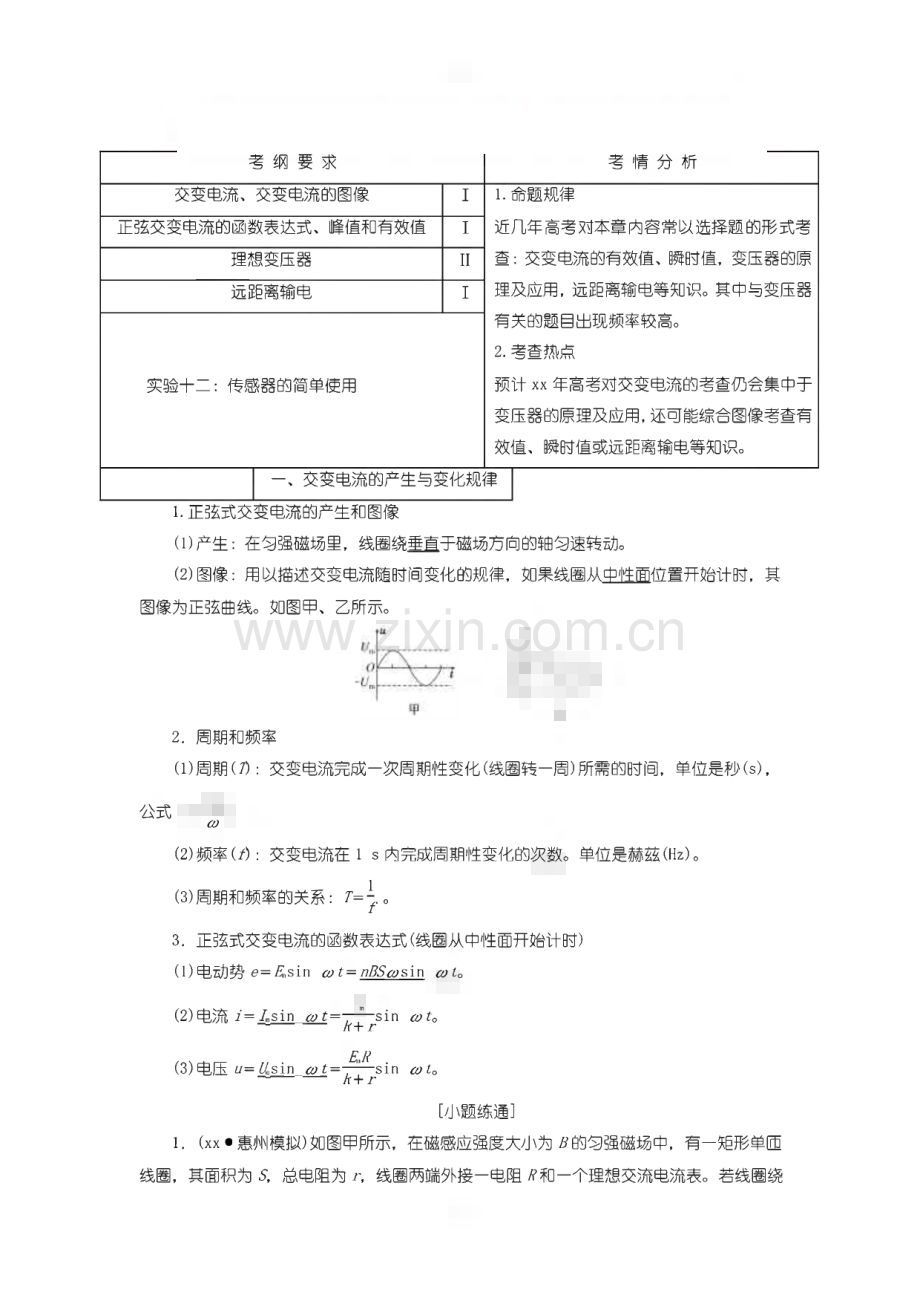 一、交变电流的产生与变化规律考纲要求考情分析交变电流、交变电流的图像I1.命题规律近几年高考对本章内容常以选择题的形式考 查:交变电流的有效值、瞬时值,变压器的原 理及应用,远距离输电等知识。其中与变压器 有关的题目出现频率较高。2.考查热点预计XX年高考对交变电流的考查仍会集中于 变压器的原理及应用,还可能综合图像考查有 效值、瞬时值或远距离输电等知识。正弦交变电流的函数表达式、峰值和有效值I理想变压器II远距离输电I实验十二:传感器的简单使用1.正弦式交变电流的产生和图像产生:在匀强磁场里,线圈绕垂直于磁场方向的轴匀速转动。图像:用以描述交变电流随时间变化的规律,如果线圈从主性面位置开始计时,其图像为正弦曲线。如图甲、乙所示。2.周期和频率周期(7):交变电流完成一次周期性变化(线圈转一周)所需的时间,单位是秒(s),公式O)频率(7):交变电流在1 S内完成周期性变化的次数。单位是赫兹(Hz)。周期和频率的关系:7=1.。3.正弦式交变电流的M数表达式(线圈从中性面开始计时)(1)电动势 e=Esin a)t=nBSa)six a)to(2)电流,=/sin co t=sin co to-7r+r&、R(3)电压=&sin cd t=-sin cot。-7r+r小题练通L(xx 惠州模拟)如图甲所示,在磁感应强度大小为少的匀强磁场中,有一矩形单匝线圈,其面积为S,总电阻为r,线圈两端外接一电阻和一个理想交流电流表。若线圈绕对称轴精品文档仞以角速度3做匀速转动,图乙是线圈转动过程中产生的感应电动势e随时间方变 化的图像,下列说法正确的是()A.在。一七时间内,穿过线圈平面的磁通量的变化量为用B.在右0时间内,通过电阻的电荷量为当C.在方3时刻穿过线圈平面的磁通量的变化率为2傲3D.在右时刻电流表的示数为72 R+=解析:选D由题图可知,在G和右时刻穿过线圈平面的磁通量大小为S,方向相反,则在。一乙时间内穿过线圈平面的磁通量的变化量为2无;A错误;在套一。时间内,磁通一 BS E量的变化量为BS,则平均电动势E=因此通过电阻R的电荷量为q=A t=A t 7r+rBS BS-A t=-A t R+r 7?+f故B错误;在右时刻电动势=强也 则由法拉第电磁感应定律,A夕=弁可知,则穿过线圈的磁通量变化率为.0,故C错误;在右时刻电流表的示数为交 变电流的有效值,则有一=-一,故D正确。电R+工电R+彳 _2.处在匀强磁场中的矩形线圈&历4以恒定的角速度绕/边转动,磁场方向平行于纸面并与力边垂直。在力=0时刻,线圈平面与纸面重合,J I如图所示,线圈的cd边离开纸面向外运动。若规定沿af-Cf 方向 个的感应电流为正,则能反映线圈中感应电流/随时间t变化的图像是()解析:选C线圈在磁场中从题图位置开始匀速转动时可以产生按余弦规律变化的交流电。对于题图起始时刻,线圈的cd边离开纸面向外运动,速度方向和磁场方向垂直,产生的电动势的瞬时值最大;用右手定则判断出电流方向为逆时针方向,与规定的正方向相同,所以C对。解决交变电流图像问题的三点注意(1)只有当线圈从中性面位置开始计时,电流的瞬时值表达式才是正弦形式,其变化规 律与线圈的形状及转动轴处于线圈平面内的位置无关。注意峰值公式=nBSa)中的S为有效面积。(3)在解决有关交变电流的图像问题时,应先把交变电流的图像与线圈的转动位置对应 起来,再根据特殊位置求特征解。二、有效值的理解和计算1.有效值的理解跟交变电流的热效应等效的恒定电流的值叫作交变电流的有效值。对于正弦交流电,其F IJ T有效值和峰值的关系为=今,=亍,/=十勺2 勺22.有效值的计算(1)计算有效值时要注意根据电流的热效应,抓住“三同”:“相同时间”内“相同电 阻”上产生“相同热量”列式求解。(2)利用两类公式0=之竺和0=1方可分别求得电流有效值和电压有效值。(3)若图像部分是正弦(或余弦)交流电,其中的从零(或最大值)开始的;周期整数倍的部 分可直接应用正弦式交变电流有效值与最大值间的关系而1、%=仍求解。3.几种典型的交变电流的有效值电流名称电流图像有效值正弦式交 变电流F正弦半波 电流Z八r t t2i=-2正弦单向 脉冲电流1 xx 万、wT t i1t L矩形脉动 电流1=非对称性 交变电流0i iI 1 i.1=错误!i:r:1小题练通1.多数同学家里都有调光台灯、调速电风扇,过去是用变压器来实现上述调节的,缺 点是成本高、体积大、效率低,且不能任意调节灯的亮度或风扇的转速。现在的调光台灯、调速电风扇是用可控硅电子元件来实现调节的,如图所示为一个经过双向可控硅电子元件调 节后加在电灯上的电压,即在正弦式电流的每一个I周期中,前面的;被截去,从而改变了电 灯上的电压,那么现在电灯上的电压为()A.UmC.g解析:选c由有效值的定义知X,得=今。C项正确。K K 乙 Z2.如图所示的区域内有垂直于纸面的匀强磁场,磁感应强度为区电阻为R,半径为、圆心角为45 的扇形闭合导线框绕垂直于纸面的。轴以角速度。匀速转动(。轴位于磁场边界)。则线框内产生的感应电流的有效值为()“应2 3,27?ylBL2 coB,-2R3应2“BE 3D.4A解析:选D线框的转动周期为7,而线框转动一周只有1的时间内有感应电流,此时感 应电流的大小为:/=工钎=筌,根据电流的热效应有:(*)=/有初,解得了BlJ cd,丁八有=,故D正确。求解有效值的一般方法和技巧(1)首先要分析交变电流的变化规律,正弦式电流的最大值和有效值的关系是/=与,U V2=三,非正弦式交变电流一般不符合此关系。(2)对于非正弦式交变电流,可在一个周期内分段求出产生的热量,再求热量的总和Q