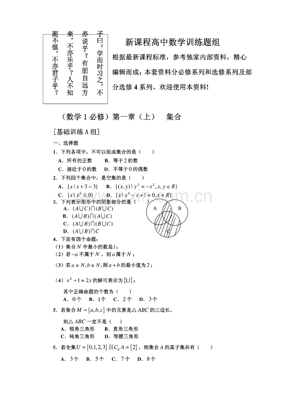 目录:数学1(必修)数学1(必修)第一章:(上)集合 训练A、B、C数学1(必修)第一章:(中)函数及其表训练A、B、C数学1(必修)第一章:(下)函数的基本性质训练A、B、C数学1(必修)第二章:基本初等函数(I)基础训练A组数学1(必修)第二章:基本初等函数(I)综合训练B组数学1(必修)第二章:基本初等函数(I)提高训练C组数学1(必修)第三章:函数的应用数学1(必修)第三章:函数的应用数学1(必修)第三章:函数的应用基础训练A组综合训练B组提高训练C组白:学而时习之,不 说乎?有朋自远方,不亦乐乎?人不知 不愠,不亦君子乎?新课程高中数学训练题组根据最新课程标准,参考独家内部资料,精心编辑而成;本套资料分必修系列和选修系列及部分选修4系列。欢迎使用本资料!(数学1必修)第一章(上)集合基础训练A组一、选择题1.下列各项中,不可以组成集合的是()A.所有的正数B.等于2的数C.接近于0的数D.不等于0的偶数2.下列四个集合中,是空集的是()A.%l%+3=3 B.(x,y)I F 丁 娟C.x I x2%I%=a+y/6b,a c Q,b e 2.若集合A=xlx6,xeN,8=xl是非质数,C=A B,则。的 非空子集的个数为。3.若集合A=%l3x7,3=X12%10,则AUB=4.设集合A=x|-3x 2,3=%2攵一1142攵+1,且2438,则实数攵的取值范围是 o5.已知A=卜卜=一一+2%-1,8=y|y=2%+1,则4门3=。三、解答题1.已知集合A=1%gN I-9wn1,试用列举法表示集合A。2.已知 A=X-2%5,B=xm+l x 2m-1,求小的取值范围。3.已知集合4=。2,0+1,3,8=a 3,2。一1,+,若入口B二卜3,求实数。的值。4.设全集U=R,M=帆I方程也%2 _%_1=0有实数根,N=l方程%2_%+Z1=0有实数根,求(C(7M)nN.白:温故而知新,可 为师矣。新课程高中数学训练题组(数学1必修)第一章(上)集合综合训练B组一、选择题1.下列命题正确的有()(1)很小的实数可以构成集合;(2)集合y I y=/一“与集合(%,丁)|丁 二/一”是同一个集合;(3)1,3,2-工,0.5这些数组成的集合有5个元素;2 4 2(4)集合(x,y)l移R是指第二和第四象限内的点集。A.0个 B.1个 C.2个 D.3个2.若集合A=1,1,B=xmx=,且=则根的值为()A.1 B.-1 C.1 或1 D.1 或1 或03.若集合 M=0,N=(%,y),2+,2 6尺卜 则有()A.MJN=M B.MUN=N C.MCN=M D.MCN=0%+y=14.方程组9,的解集是(),=9A.(5,4)B.(5,-4)C.(-5,4)D.(5,-4)。5.下列式子中,正确的是()A.R+e R B.Z o j:I x 0,x e Z)C.空集是任何集合的真子集 D.6.下列表述中错误的是()A.若A=氏则=4B.若AU3=B,则C.(4。3)旦4旦(4118)D.Cu(An8)=CA)UC8)日:学而不思则罔 而不学则殆。二、填空题1.用适当的符号填空(1)V3x I x 2,(1,2)(x,y)l y=%+1(2)V2+7 5 卜1%(2+同,(3)|x I =x,x g 7?j I x3-x=oj2.设U=R,A=x a x 4或 8=xl/5x+6=0,C=I x2+2x 8=oj 满足AClBw。,,40。=。,求实数a的值。4.设 U=R,集合 4=x I/+2=0,B=I x2+(m+l)x+m=01;若(CuA)n5=。,求根的值。新课程高中数学训练题组(数学1必修)第一章(上)集合提高训练C组一、选择题1.若集合X=%l%-1,下列关系式中成立的为()A.Oc X B.0eXC.(/)&X D.0c X2.50名同学参加跳远和铅球测验,跳远和铅球测验成绩分别为及格40人和31人,2项测验成绩均不及格的有4人,2项测验成绩都及格的人数是()A.35 B.25C.28 D.153.已知集合A=%I%2+JX+1=o,若40氏=。,则实数m的取值范围是()A.m 4C.0 /n 4 D.0 /n 44.下列说法中,正确的是()A.任何一个集合必有两个子集;B.若则A6中至少有一个为劭C.任何集合必有一个真子集;D.若S为全集,且AC|6=S,则A=B=S,5.若U为全集,下面三个命题中真命题的个数是()(1)若=则(C)U(Cu3)=U(2)若AU3=U,则(3)若Alj3=。,贝必=B=(/)A.0个 B.1个 C.2个 D.3个6.设集合 M=%|%=七w Z,N-x x-+,keZf 则()2 4 4 2A.M=N B.M 黑 NC.N M D.MCN=(/)7.设集合A=xl/%=0,8=尤|%2+尤=0,则集合()A.0 B.0 C.D.-1,0,1二、填空题1.已知=y I y=%?-4%+3,x e 氏,N=y I y=-犬+2x+8,x e/?则 m n n=o2.用列举法表示集合:M=ni-e Z,m&Z=_。m+13,若/=X I%2-1,%e Z,贝!J G N=。4.设集合A=l,2,8=l,2,3,C=2,3,4WJ(AnB)UC=。5.设全集U=(%,y)|x,y e R,集合M=,N=(尤,y)|y w 九一4,x 2那么(gM)n(CuN)等于 o三、解答题1.若4=/,3=卜11=4,”=a,求gw.2.已知集合 4=x-2x a,B=y y=2x+3,x e A,C=I z=x,x&,2且求a的取值范围。3.全集5=1,3,丁+3/+2,A=l,|2x-l|,如果=。,则这样的 实数x是否存在?若存在,求出入;若不存在,请说明理由。4.设集合A=1,2,3,10,求集合A的所有非空子集元素和的和。新课程高中数学训练题组(数学1必修)第一章(中)函数及其表示基础训练A组一、选择题1.判断下列各组中的两个函数是同一函数的为()月=-,乃=一5;x+3(2)y1=Jx+l J%-1,y2=(x+l)(x-1);/(%)=%,g(x)=;/(x)-Vx4-x3,F(x)=xs/x-1;(5)力(%)=2%-5y,f2(x)=2x-5 oA.、(2)B.、(3)C.(4)D.(3)、(5)2.函数y=/(%)的图象与直线1=1的公共点数目是()A.1 B.0 C.0 或1 D.1或 23.已知集合A=1,2,3,%,8=4,7,/,/+3。使8中元素y=3%+1和A中的元素x对应,则左的值分别为()A.2,3 B.3,4 C.3,5 D.2,5%+2(x W-1)4.已知/(%)=卜2(_%2)a aA.1 B.1 或二 C.1,二或G D.V3 2 25.为了得到函数y=/(-2%)的图象,可以把函数y=/(l-2%)的图象适当平移,这个平移是()A.沿无轴向右平移1个单位 B.沿x轴向右平移个单位 2C.沿x轴向左平移1个单位 D.沿x轴向左平移,个单位 2|x 2,(1210)6.设/(%)=,,二 4 则”5)的值为()A.10 B.11 C.12 D.13二、填空题1.设函数L-1(%2 0),2 苟(。)。则实数。的取值范围是.-(x 0)1.若函数/(%)=1%(X=(),贝iJ/(/(O)=.0(x/(x+2)5的解集是一-l,x +oo)5.若函数/(%)=%2,则对任意实数%,%,下列不等式总成立的是()2-2占+%21/(%1)+/(%2)2 2f卢+%2)。(%1)+/(%2)八2 1 2D f卢+12)/(为)+/区),-2 26.函数/(%)=2x-x2(0 x 3)x2+6x(-2 x)C.-8,1 D.19,1二、填空题1.函数/。)=(4-2)/+2(。2)%-4的定义域为R,值域为(8,0,则满足条件的实数。组成的集合是。2.设函数/(九)的定义域为0,1,则函数-2)的定义域为。3.当%=时,函数/(%)=(九一)2+(%-%)2)2 取得最小值。1 34.二次函数的图象经过三点A(,),8(-1,3),。(2,3),则这个二次函数的2 4解析式为。