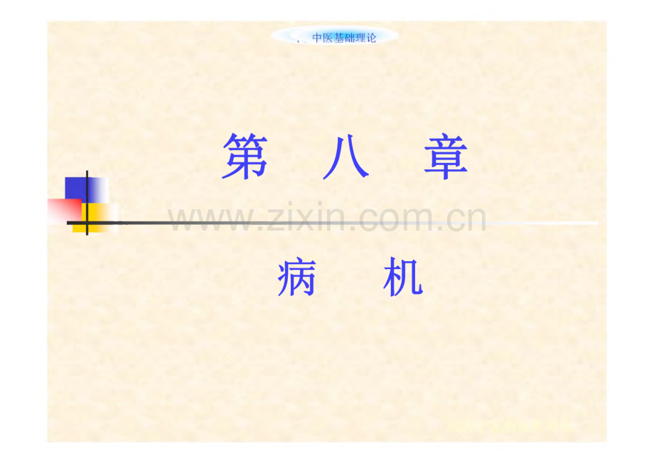 中医基础理论中医基础理论第八章病机中医基础理论【目的要求】O掌握病机的基本概念及层次结构。掌握邪正盛衰与虚实变化和疾病发展转归的关系 掌握阴阳偏胜、偏衰、互损、格拒、亡失的病机。掌握精虚、精瘀、气虚、气机失调、血虚、血瘀、血热、血寒和精气血关系失调的病机。了解津液不足、津液代谢障碍的病机。掌握内生五邪”的病机。掌握疾病传变的基本概念和病位传变、寒热转化、虚实转化的具体规律。中医基础理论板述O 1、病机1)含义:即疾病发生、发展与变化的机理。2)意义:是用中医理论分析疾病现象,从 而得到的对疾病内在本质规律性的认 识,是防治疾病的依据。中医基础理论3-02、病机学说1)含义:是研究疾病发生发展和变化的机理 并揭示其规律的中医基础理论分支学科。2)形成:病机理论源于内经素问至真要大论的“病机十九条”奠定了脏腑病机、六气病机理论基础。中医基础理论3)发展伤寒杂病论发展了六经病机,发挥了脏腑、经络、气 血、痰饮病机。诸病源候论为最早的中医病因病机专著。小儿药证直诀奠定了儿科病机理论基础,阐明了儿科 病机特点。刘完素认为“六气皆从火化”。李东垣确立“阴火”的病机概念。朱震亨倡“相火论”,提出“阳有余、阴不足”及阐发“六 郁”病机。温病学派阐发了卫、气、营、血病机传变规律与三焦传变 机理医林改错丰富了瘀血病机理论。而二六Frfn二H 日在自知1丘山 T 咏山66一日中医基础理论)三 O 3、主内容基本病机邪正盛衰、阴阳失调、精气血津液 失常系统病机一一经络、脏腑病机等疾病病机一一六经病机、卫气营血病机、三焦病机病证病机一一感冒、哮证、痰饮等的病机症状病机一一疼痛、发热、健忘等的病机近几十年新病机理论:病机层次说、痰瘀同源 说、体质病机说等。中医基础理论第一节基本病机 邪正盛衰 阴阳失调-精气血失常 津液代谢失常 内生“五邪”中医基础理论、邪正盛衰邪正盛衰与虚实变化邪正盛衰与疾病转归中医基础理论(一)邪正盛衰与虚实变化|-O1、虚实病机1)实的病机一一邪气盛则实-含义:实,主要指邪气盛,是以邪气亢 盛为矛盾主要方面的一种病理状态。-特点:正邪斗争激烈,病理反映比较剧 烈的、有余的证候。中医基础理论O-形成:外感六淫和疣气致病的初、中期,或痰、食、血、水滞留体内的内伤病。-表现:体质壮实、壮热狂躁、声高气粗、腹痛拒按、二便不通、脉实有力、舌苔厚 腻等。中医基础理论O2)虚的病机精气夺则虚-含义:虚,主要指正气不足,以正气虚损为 矛盾主要方面的一种病理反映。-特点:抗病力低下,正邪斗争不剧烈表现出 的一系列虚弱、蓑退和不足的证候。中医基础理论O形成:先天禀标不足气、血、津、液、阴阳耗伤病后亏虚 气化功能减退,精气血津液生化不足多种慢性病损耗气化功能亢奋,但消耗精微过多邪气损害 1-表现:神疲体倦、气短、面色无华、自汗盗汗二 便失禁、五心烦热、畏寒肢冷、脉虚无力等中医基础理论2、虚实变化 O1)虚实错杂-含义:指疾病过程中,邪盛与正虚同时并存的病 理状态 形成:实性病变失治,邪久留、损正气,形成邪实正 虚的虚实错杂病变。正气不足,无力驱邪外出;或本正虚,兼内生 痰、食、瘀血、水湿凝滞的正虚邪实的虚实错杂 病变。中医基础理论|-O 表现:虚中夹实一指病理变化以正虚为主,又兼夹实邪为患的病理状态。(如脾气不 足,运化无权之湿滞中焦证)实中夹虚指病理变化,以邪实为 主,又兼有正气虚损的病理状态。(如邪 热炽盛灼津,致气阴两伤证)中医基础理论2)虚实转化 由实转虚一一实邪久留而损伤正气的病理 转化过程 由虚转实一一正气不足而致实邪积聚的病 理转化过程中医基础理论O3)虚实真假-真虚假实一一至虚有盛候含义:病机的本质为“虚”,表现为“实”的临床假象。形成:正气虚弱,脏腑气血不足,推动、激发功能减退所致。表现:纳食减少,疲乏无力,舌淡嫩。又兼腹满(时减)、腹痛(喜按)等假象中医基础理论q-o-真实假虚一大实有赢状含义:病机的本质为“实”,表现为“虚”的 临床假象。形成:邪气亢盛、结聚于内,阻滞经络,气血 不能畅达于外。表现:如热结胃肠,便秘腹痛拒按,潮热澹语。又兼面色苍白,四肢逆冷,精神萎顿 等状似虚寒的假象。中医基础理论(二)邪正盛衰与疾病转归I-O1、正胜邪退 含义:正气奋起抗邪,正气日趋强盛,邪 日衰疾病向好转和痊愈方向发展的一种病 理变化。-形成:患病机体正气较盛,抗邪能力较强;或邪气较弱;或治疗正确及时。-转归:为疾病向好转或痊愈发展的最常见 的转归。中医基础理论O-含义:邪气亢盛,正气虚弱而抗邪无力,疾病向 恶化、危重、甚至向死亡转归的一种病理变化。形成:受邪机体正气愈虚,病势急重,无力抗邪;病邪 愈盛,毒力愈强,生理功能衰惫,病情趋向恶化,阴阳离决如“亡阴”、“亡阳”O 转归:邪盛正虚,正不敌邪,病势恶化,甚至死to中医基础理论O3、邪正相持-含义:疾病过程中,正气不甚虚弱,邪气亦不 亢盛,二者相持不下,病势迁延。形成:多见于病之中期,或慢性病迁延期。转归:正气不能完全驱邪外出,病邪稽留于一 定部位(邪留、邪结),或为慢性病证。中医基础理论O4、正虚邪恋 含义:正气已虚,余邪未尽,因正气难复,致病处缠绵难愈的病理过程。为邪正相持的 特殊病机。形成:多见宇疾病后期,急性转为