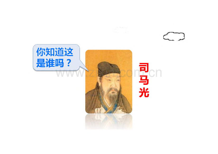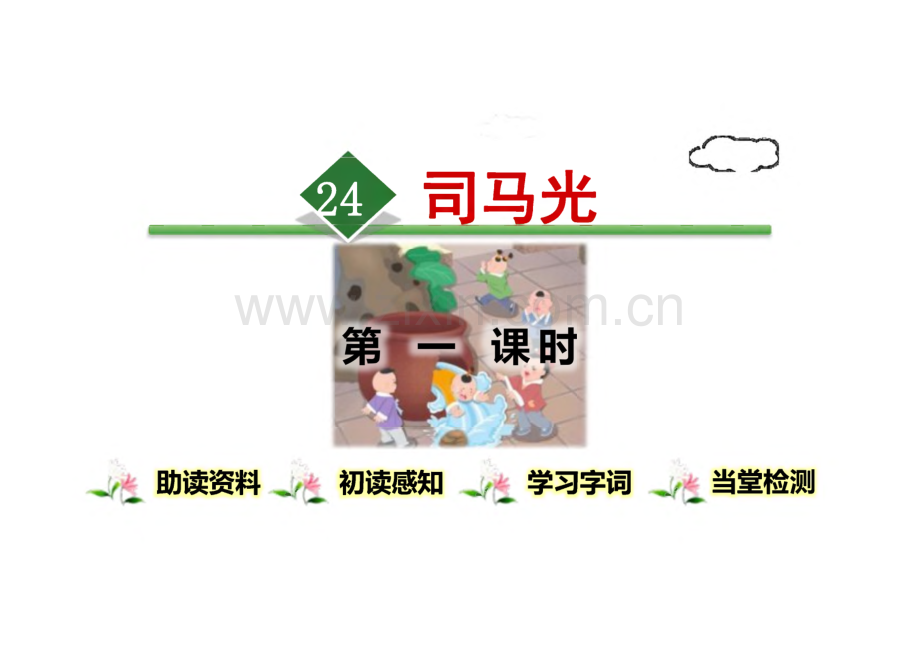 0司马光助读资料 初读感知一学习字词一当堂检测你知道这是谁吗?司马光今天就让我们来学习一篇文言文司马光。学习目标1.会认本课5个生字,会写7个生字,理解生字组成的 词语。(重点)2.准确朗读课文,注意词句间的停顿。背诵课文。(难点)助读资料走近作者【司马光(10191086),北宋时期著 名政治家、史学家、散文家。北宋陕州 夏县流水乡(今山西运城安邑镇东北)人,汉族。出生于河南省光山县,字君 实,号迂叟,世称流水先生。司马光自 幼嗜学,尤喜春秋左氏传。中国五千年的灿烂文化,在使用过程中,有传承,有变 革,有创新,有些词语的意思发生了变化,比如“去”,古义是离开。例句:“众皆弃去”(司马光)“我以日 始出时去人近”(两小儿辩日);现在的意思是:到 去。又如“交通”,古义是:交错相通。例句:阡陌交 通,鸡犬相闻。(桃花源记)现在的意思是主要用于称 各种运输和邮电事业。初读感知听老师范读,边听边画出文中的生字,注意生字的读音。24司马光请同学们自由朗读古文,注意读准字音,读通句子,难读的地方多读几遍。皆大欢喜 JieI I悉皆I TI人人皆知史暨J读一读下面的句子,看看你有什么发现?加点的字一是多音字L水迸,儿得活。得一Fi(得亏)de(得救)注意加点字 的读音!读一读:得(加i)亏司马光反应快砸破水缸,掉进缸里的孩子才得(加)救了。检查自读情况指名读课文,句子是否通顺。同学互评:字音是否正确,再读课文,想一想课文写了什么?本文讲了司马光小时候砸破水缸救出小伙 伴的故事。我会写ST 司马光司 结构:半包围 音序:s 部首:口 组词:司马迁各司其职造句:司马光是北宋一位著名的政治家。稍靠上。书写指导:横折钩的横要短,竖要长,里边的“已”位置庭院结构:半包围ting庭庭音序:T 部首:广组词:家庭大庭广众 造句:爷爷家有一个很大的庭院。书写指导:“廷”左边是“红”不是“L”,右边“壬”上边 是短平撇,中间一横稍长。我会写.deng攀登登结构:上下音序:D 部首:”组词:登报五谷丰登造句:我们很快就攀登上了这座山峰。书写指导:左上边的横撇横 短撇长,右上边有两个短撇,捺要长。die跌倒跌结构:左右音序:D 部首:足组词:跌落跌跌撞撞造句:我不小心跌倒在泥里。跌书写指导:左边窄小,右边 高大,“止”下横变为提,“失”中间一撇要长。我会写众人结构:品字结构 zhong 众音序:z 部首:人组词:众多众志成城造句:众人都感到这件事太奇怪了。书写指导:上边的“人”要 宽大,下边两个“人”并排,左边“人”的捺变为一点。qi 丢弃弃结构:上下音序:Q 部首:开组词:抛弃自暴自弃造句:同学们都不要随意丢弃垃圾。书写指导:上边要扁小,最 下边一横要长,左边是一竖 撇,右边是一竖。chi持刀持结构:左右音序:C 部首:t组词:主持坚持不懈造句:歹徒持刀威胁无辜群众。书写指导:右上边“土”下横 最长,中竖与“寸”的竖是两 笔,“寸”的竖要靠右一些。B课堂小结初读课文后,你感受到了什么?读完这篇课文,让我们感受到司马光的聪 颖机智,遇事沉着冷静。当堂检测一锤定音(在带点的字正确的读音后画“J”)。可(sy shD机A(zhqpg zhtm)多茅(4 pi)去珠(d甲理)入 孽(d即g胡n)瓮M(tinp th)院比一比,再组词。-司(司机)同(同学)徇(语句)挺(挺立)庭(家庭)噢(蜻蜓)持(坚持)诗(古诗),待(等待)再(登山)瞪(瞪眼)漫(澄清)畲司马光第二课时一品读释疑一结构主旨.,课堂拓展当堂检测,学习目标i.准确朗读课文,注意词句间的停顿。背诵课文。2.能借助注释,用自己的话讲一讲这个故事。(重点)3.了解文章特点,激发阅读兴趣,懂得关爱他人。(难点)这是课后第1题哦!读课文,想一想怎样读好这样的课文?(串珠问题1)群儿/戏于庭,一儿/登瓮,足跌/没/水中。众/皆/弃去,光/持石/击瓮/破之,水迸,儿得活。阅读方法解密】,根据意思停顿,读好简短文言文理解古汉语中的一些句子时,有的要进行调整,有 时还要增添,翻译时才会符合现代汉语表达习惯,通顺 的讲述。运用:如课文第一句话,调整为:群儿于庭戏,(庭中有瓮)一儿登瓮,足跌没水中。司马光与其他孩子表现有哪些不同?(核心问题)品读释疑司马光戏:做游戏于,在庭3庭院登:爬瓮:缸足:一失足群儿戏于庭,一儿登瓮,足跌没水中。众皆弃去,光持:一拿 击J击打 跌:掉进 没三沉没 众3大家持石击瓮破之,水迸,儿得活。皆:全,都弃:丢弃去:离开诗意:一天,一群小孩在庭院里嬉戏。院子里有一口大水缸,一个 小孩爬到瓮缸上,失足掉进缸里沉没到水里。家都丢弃他失足者离开了。司马光立刻拿起石块击打瓮缸,瓮缸被打破了,水从破口处喷涌出来,失 足掉入水里的人才能够活下来。课文讲了怎样的小故事?作者写了司马光的表现,还写了其他孩子的表现,为什么这样写?(串珠问题2)课文讲了司马光小时候砸破水缸救出小伙伴的故 事。作者这样写的目的是:形成鲜明的对比,突出司 马光的不慌张,沉着冷静。借助注释,想一想怎样用自己的话把这个故事讲生动,然后讲给别人听。(串珠问题3)这是课后第2题哦!有一次,司马光跟小伙伴们在后院里玩耍。院子里有一口大水缸,有个小孩爬到缸沿上玩,一不小心,掉到缸里。缸大水深,眼看那孩 子快要没顶了。别的孩子们一见出了事,吓得边哭边喊,跑到外面向 大人求救。司马光却急中生智,从地上捡起一块大石头,使劲向水缸 砸去,“砰!”水缸破了,缸里的水流了出来,被淹在水里的小孩也 得救了。小小的司马光遇事