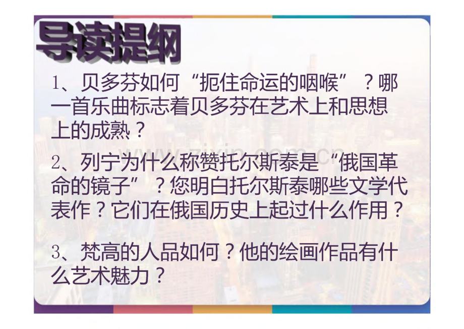 世界的文化杰作Is贝多芬如何扼住命运的咽喉?哪 一首乐曲标志着贝多芬在艺术上和思想 上的成熟?2、列宁为什么称赞托尔斯泰是俄国革 命的镜子?您明白托尔斯泰哪些文学代 表作?它们在俄国历史上起过什么作用?3、梵高的人品如何?他的绘画作品有什 么艺术魅力?全世界最伟大的作曲家路德维希冯贝多芬。1770年 生于德国波恩市。他从小就表现出了音乐天赋。贝多芬将近 而立之年时就有了失聪的先兆,贝多芬快到50岁时差不多完 全耳聋。实际上贝多芬在完全失聪的岁月里,谱写出的乐章 超出了他早期作品的水准。一般认为他在晚年的岁月里创作 的作品是他一生中最伟大的杰作。他1827年在维也纳去逝,终年57岁。贝多芬创作了大量作品,其中包括九部交响曲,32部钢琴奏鸣曲,五部钢琴协奏曲,十部钢琴小提琴奏鸣曲,一系 列弦乐四重奏曲,声乐曲,剧乐曲,以及许多其他乐曲。然而 和他众多的乐曲的数量相比,更重要的是其质量。他的作品 把完美的想象和奔放的感情有机地融为一体。贝多芬用自己 的演奏扣动了人们的心弦,他们再也不认为器乐是一种次要 的艺术。“我要扼住命运的咽喉,它决不能使我 完全屈服贝多芬1、当时贝多芬遇到了如何的 厄运?2、他是如何扼住命运的咽 喉?哪一首乐曲标志着贝多芬在艺术 上和思想上的成熟?旦封军最普他 仑阖性称 破题时装。雄沉声-春日 者写出用乐观着人3B。声一蛤贝 箜又裁S M 好着。法多熊一向 给贝一英贝鲁义之 空是的此舞主女 欲钟这大从限朦最 3皇部 军誉覆 I:ZE,多穿盘 18合氢粮演贝贯见乐 于破躅初是品数响 感争窗口崔是交漫,初是品哥晌a磊士 作您 曲得题维部口戢爱 此当这8号这首交响曲反映了哪一个重大的社 会题材?这首交响曲以法 国大革命为题材,表 现出贝多芬对法国 资产阶级革命的敬 仰和对共和革命英 雄的崇拜感情。乐坛雄狮贝多芬“我要扼住命运的咽喉,他不能使我完全屈服”贝多芬故居(位于奥地利维也纳)贝多芬用过的助听器、又子巨匠4.、.,近代文学艺术方面为什么会 涌现出许多杰出人物及其代表作 品?列夫托尔斯泰“俄国革命的镜子-宁列宁为什么称赞托尔 斯泰是俄国革命的 镜子?列宁为何称托尔斯泰为俄国革 命的镜子”?因为托尔斯泰的作品描写了俄国社会各阶层的生活图景,深刻揭露了 19世纪后期到20世纪初期俄国社会的基本矛盾,因此,列宁称托尔斯泰为俄国革命的镜子。电影战争与和平剧照世界文学名著粘梓Sergei BonderchukIN力第博尔,克 Srget Bondarctiuk 梯朱拉9lVtt Lyudniil6 Savelyeva K修柒博秀 Vyacheslav likhonov8bo列夫托尔斯泰U8281910),19世纪俄国最伟大的作家。出 生于贵族家庭,1840年入喀山大学,受到卢梭、孟德斯鸠等启蒙思想家影响。1847年退学回故乡在自己领地上作改革农奴制的尝试。18511854年在高加索军队中服役并开始写作。1854-1855年参加克里米亚战争。几年军旅生活不仅使他看到上流社会的腐化,而且为以后在其巨著战争与和平中能够真实地描绘战争场面打下基础。其成名作:自传体小说童年、少年。从中篇小说一个地主的早晨(1856)之中能够看到他站在自由主义贵族立场主张自上而下改革而在自己庄试验失败的过程。1857年托尔斯泰出国,看到资本主义社会重重矛盾,但找不到消灭社会罪恶的途径,只好呼吁人们依照“永恒的宗教真理”生活。这些观点反映在其短篇小说琉森(1857)之中,后又创作了探讨生与死、痛苦与幸福等问题的三死、家庭幸福。二MO的人“相信我吧,在艺术 问题上,下面这句话是真实的:老老实实是最好的方法,宁肯不厌其烦地严肃钻研,而不要 投机取巧、哗众取宠。”林克这句话说明梵高的成功 路是如何走出来的?梵高自画像相信我吧,在艺术问题上,下面这句话 是实在的:老老实实是最好的方法,宁肯不厌其烦是钻研,而不要投机取巧,哗众取宠。-凡局此名言表达了艺术家如何的品行?不爱慕虚荣,扎实务实地探求艺术梵高(853_1890)文译凡高,19世纪荷兰著名画家,后期印象主义画派的 代表人物。出生于荷兰的津德尔特。他的画主要以下层 人民的生活为内容,如他以贫苦农民的生活为题材,创作 了食土豆者。他决定自由地运用色彩,用夸张的手 法,更有力地表达自己的主观感受。这一时期,他创作了 大量后来的传世名作,如向日葵.椅子和烟斗.咖啡馆夜市等。向日葵是梵高的代表作之一。梵高的作品包含了深刻的悲剧意识.强烈的个性和 在形式上的独特追求,远远走在时代的前面。梵高的作 品在他在世时,不为社会承认,他在世时只卖出过一幅作 品,这就是1890年在布鲁塞尔一个展览会上出售的红 色的葡萄园。20世纪以后,梵高作品的价值越来越为 人们认识。梵高的人品如何?十分关怀穷人,在逆境中依然 执著地热爱生活、踏实地追 求绘画艺术老人肖像妇人肖像麦田里的农妇罂粟花紫罗兰瓶与花夜晚的咖啡馆星夜红色的葡萄向 日 葵特别关注81987隼日本安田火灾海上保险公司以3990万美元的价格买下 了向日葵,创下了当时世界油 画价格之最。据权威资料凡高绘画作品的拍卖纪录屡创新高,下面是他死后作品买卖情况:凡高的作品的拍卖价格曾占据艺术品拍卖价格的前5名。1990年5月15日,以8250万美元的价格卖给了日本收藏家。保持世界上卖价最高的艺术品直到2004年。1987年11月11日,以5390万美元的天价卖出,震惊了世界也引起了一些争论。1987年3月30日,以3