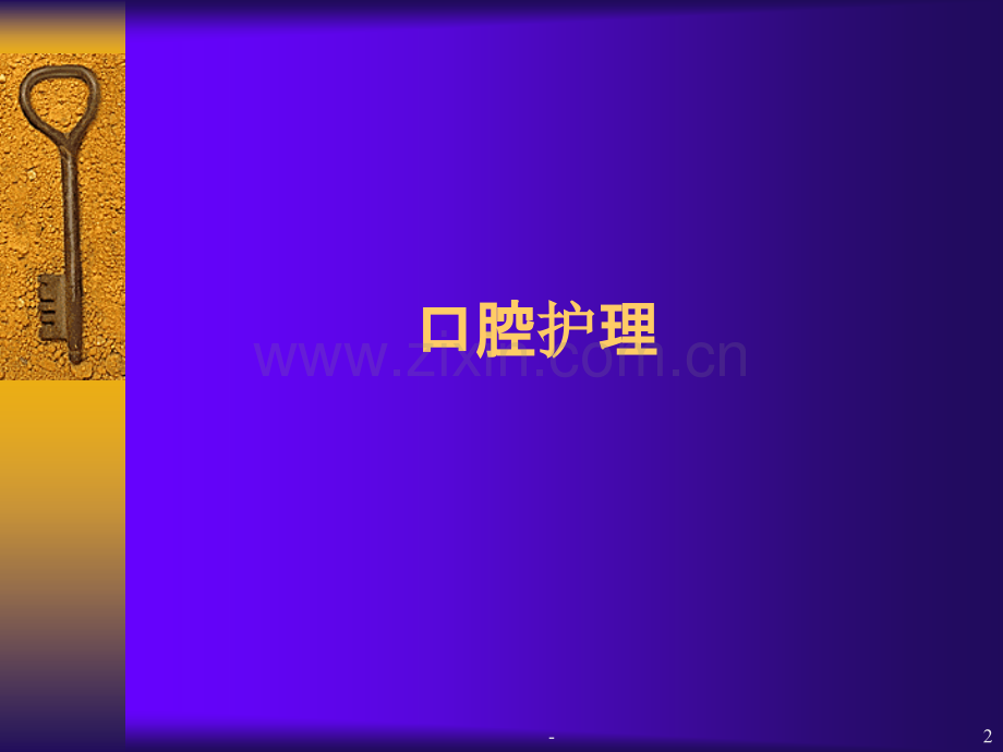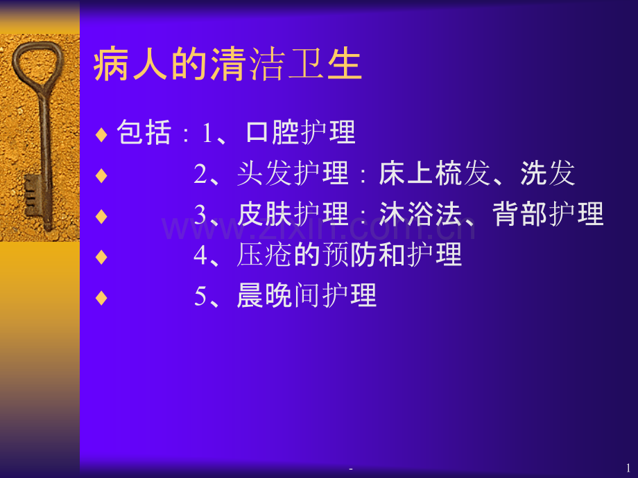 病人的清洁卫生包括:1、口腔护理 2、头发护理:床上梳发、洗发 3、皮肤护理:沐浴法、背部护理 4、压疮的预防和护理 5、晨晚间护理1-口腔口腔护护理理 2-口腔口腔卫卫生指生指导导 义齿义齿义齿义齿的清的清的清的清洁洁洁洁与与与与护护护护理理理理 特殊口腔特殊口腔特殊口腔特殊口腔护护护护理理理理 1 1 1 1毫升毫升毫升毫升 1-5 1-5 1-5 1-5万万万万 刷牙刷牙刷牙刷牙-60%-60%-60%-60%漱口漱口漱口漱口-15%-15%-15%-15%口腔 护理 3-口腔卫生的评估 口腔的口腔的 评评估估患者自理患者自理 能力的能力的评评估估健康指健康指导导 需要的需要的评评估估口唇、口腔粘膜及的牙龈色泽、湿润度、有无干裂、出血及疱疹牙的数量是否齐全,有无义齿、龋齿、牙结石、牙垢等;舌的颜色、湿润度腭部、悬雍垂、扁桃体等的颜色,是否肿胀,有无不正常的分泌物等刷牙的方法、次数,口腔清洁的 程度口腔清洁的能力,需要完全协 助 还是部分协助个人对口腔卫生的重要性及预防口腔疾病的知识的了解程度4-口腔护理常用漱口液 溶液名称溶液名称浓浓度度作作 用用生理盐水清洁口腔,预防感染复方硼酸溶液(朵贝尔氏液)轻度抑菌、除臭过氧化氢溶液1%3%防腐、防臭,适用于口腔感染有溃烂坏死组织者碳酸氢钠溶液1%4%属碱性溶液,适用于真菌感染洗必泰溶液002%清洁口腔,广谱抗菌呋喃西林溶液002%清洁口腔,广谱抗菌醋酸溶液01%适用于绿脓杆菌感染硼酸溶液2%3%酸性防腐溶液,有抑制细菌作用甲硝唑溶液008%适用于厌氧菌感染中药漱口液(金银花、一枝黄花、野菊花)清热、解毒、消肿、止血、抗菌5-常用漱口液1、一般情况:用冷开水、生理盐水、多贝尔溶液。2、中性:1:5000呋喃西林3、偏碱性:23%硼酸溶液4、偏酸性:14%碳酸氢钠5、溃疡、炎症、口臭:13%过氧化氢溶液6、绿脓杆菌感染:0.1%醋酸溶液7、厌氧菌感染:0.08%甲硝唑溶液6-口腔健康教育 与患者与患者讨论讨论口腔口腔卫卫生的重要性生的重要性 清清洁洁用具使用的指用具使用的指导导 正确选择牙刷及牙膏 刷牙方法的指导 刷牙时将牙刷的尖端轻轻放于牙齿周围的龈沟上,与牙齿呈45角,以快速的环形来回刷动对于前排牙齿的内面,可用牙刷毛面的尖端以环形方式刷洗牙面,再反复刷洗牙齿的咬合面每天至少刷牙2次,一般都在早晨起床后或晚上临睡前进行,有的人在进食后也要刷牙。7-8-义齿的清洁与护理 义齿存放于冷水杯中勿放入热水及消毒液中,以防变形每日换水一次9-特殊口腔特殊口腔护护理理 适适应应症:高症:高热热 昏迷昏迷 危重危重 禁食禁食 鼻鼻饲饲 口腔疾患口腔疾患 术术后后 生活不能自理者生活不能自理者每日每日2-3次次10-观察去除清洁保持口腔口腔护护理的目的理的目的口腔清洁、湿润,预防口腔感染 等并发症口腔外观使患者提高自信,心理上感到舒适口臭、牙垢,增进食欲,保证患者舒适口腔内的变化,提供病情变化的信息11-操作前准备用物准备患者准备环境准备护士准备治疗盘内备:治疗碗:生理盐水棉球、镊子、止血钳弯盘:压舌板、纱布、吸水管棉签、石蜡油、手电筒。必要时备开口器水杯及漱口液毛巾12-13-实施1、准备病人:侧卧或头偏向一侧2、润滑口角:凡士林或液体石蜡3、吸水漱口:4、擦洗:(1)咬合上下齿:左外侧面,由内向门齿沿纵向擦洗,右侧相同。(2)张开上下齿:左上内侧面 左上咬合面 左下内侧面 左下咬合面 弧型擦洗左侧颊部。右侧相同(3)擦洗舌以及硬腭5、观察上药:龙胆紫、冰硼散、西瓜霜14-15-16-17-注注意意事事项项操作时注意患者的舒适与安全擦洗过程中,每次只取一个棉球并夹紧,避免棉球遗漏在口腔内棉球不宜过湿避免患者吸入过多的溶液擦洗动作要轻柔避免损伤粘膜及 牙龈,尤其是 凝血功能差的患者昏迷和意识不清的患者禁忌漱口,避免引起误吸对有义齿的患者,应协助其取下并 用冷水清洁,漱口后帮助其佩带。或浸泡于冷水中,每日更换冷水,禁忌使用热水或酒精避免变形长期使用抗生素的患者,应注意观察 口腔粘膜有无霉菌感染18-19-头发护理 20-头发头发的的护护理理 床上梳床上梳发发 床上洗床上洗发发灭头灭头虱、虱、虮虮法法21-头发的评估 头发及周围皮肤的评估 包括毛发的分布、浓密程度、长度、脆性及韧性、干湿度、卫生情况、光泽度、颜色、有无虱子等,周围皮肤是否干燥、有无鳞片、伤口或皮疹、皮肤擦伤和表皮脱落等患者自理能力及健康指导需要的评估 包括洗发或梳发的需要、习惯,是否卧床,有无关节活动受限,有无肌肉张力减弱或共济失调,洗法或梳发时需要完全协助还是部分协助,个人对头发清洁及相关知识的了解程度等。22-床上梳发 目 的 去除头皮屑,使头发整齐、清洁,减少感染机会。按摩头皮,刺激头部血液循环,促 进头发的生长和代谢。维护患者的自尊和自信,建立良好 的护患关系。操作前准操作前准备备用物 梳子、治疗巾;必要时备30乙 醇。患者 病情允许,可坐起或摇起床头,半坐卧位环境 室内宽敞、明亮、温度适宜护士 着装整齐,洗手 23-24-床上洗床上洗发发 去除去除头头皮屑及皮屑及污污物使其整物使其整洁洁美美观观,减少感染减少感染按摩按摩头头皮,刺激皮,刺激头头部血液循部血液循环环,促促进进新新陈陈代代谢谢消除痒感,使其舒适,促消除痒感,使其舒适,促进进 身心健康身心健康预预防和防和灭灭除虱除