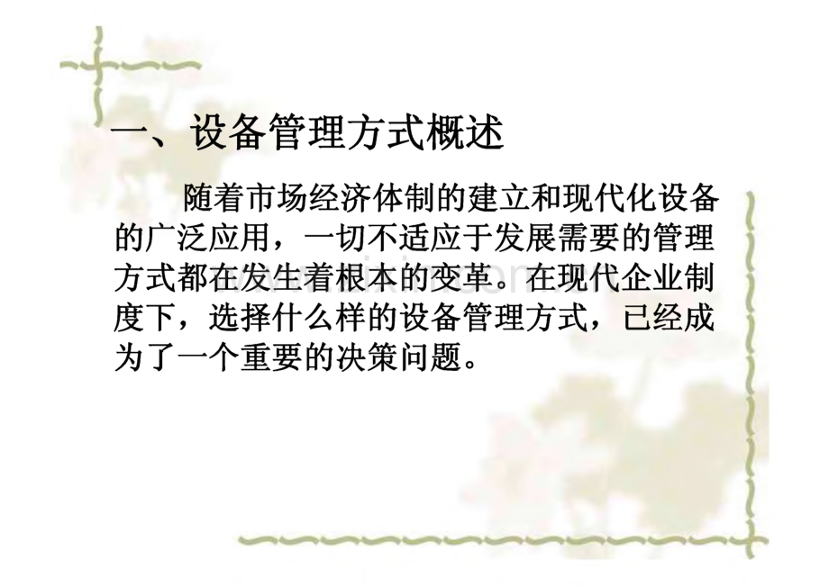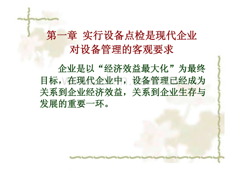 第一章实行设备点检是现代企业 对设备管理的客观要求企业是以“经济效益最大化”为最终 目标,在现代企业中,设备管理已经成为 关系到企业经济效益,关系到企业生存与 发展的重要一环。一、设备管理方式概述随着市场经济体制的建立和现代化设备 的广泛应用,一切不适应于发展需要的管理 方式都在发生着根本的变革。在现代企业制 度下,选择什么样的设备管理方式,已经成 为了一个重要的决策问题。1.现代化设备必须采用现代化的管理方式传统的静态的设备管理方式已经不能适应现代化设备管理的要求了,只有现代化设 备与现代化管理方式结合起来,相辅相成,协调发展,互相促进,才能充分发挥现代化设备的作用,不断提高生产效率,增加企业效益。2.设备管理现代化的含义在传统管理的基础上,吸收了现代 先进的管理理论、方法和现代科学技术 的新成就,系统地、综合地应用于设备 管理,充分发挥现代设备的技术、经济 和社会效益,使之适应生产现代化产品 的需要,并取得最佳的设备投资效益。3.设备管理现代化的基本内容管理理论与管理思想现代化这是设备管理现代化的灵魂,是实现 设备管理现代化的先导猾导毂备管理现代也的i要思想现克 树立科技是生产力的观念,依靠技术进步;树立系统观念,积极推进设备综合管理;树立防重于治的观念,坚持预防为主的方针;树立生产经营观念和竞争观念,更好地为经营目标服务;树立效益观念,不断提高设备的技术、经济与社会效益;树立全员管理观念,组成多层次、全方位的设备管理网络;树立信息观念,不断提高设备管理与决策水平;树立以人为中心的管理观念;坚持决策科学化、民主化,搞好设备工作决策。管理组织与管理体制现代化这是设备管理现代化的核心,是实现 设备管理现代化的保证管理方法现代化这是实现设备管理现代化的途径管理手段与管理工具现代化这是实现设备管理现代化的技术基础5.管理人才现代化这是实现设备管理现代化的关键在市场经济条件下,企业之间的激烈 竞争:表层看是产品的竞争;深层次表现 为技术的竞争和管理的竞争;关键是人才 的竞争。即,实质上是经营管理者的才能 竞争和员工素质的竞争。4.实行设备点检是现代企业对设备管理的客观要求现代化设备的广泛应用,虽然大幅度地提高 了生产效率和经济效益,但同时也对设备管理提 出了新的要求。如何管好这些先进的设备,关键 是确定一个与现代化设备管理相适应的现代化设 备维修管理方式。实践证明,实行设备点检定修制是实现现代 化设备管理的一条成功之路。二、以点检为核心的TPM体系TPM 是 Total Productive Maintenance 的篇写,被笄为“会员金产掖修“我“企而金产掖护”。TPM是日本的现代设备维修管理体系,其基本理念是“三全”,其核心体制是点 检定修制。1.TPM的内涵TPM是以设备综合效率最大化为目标,以设备时间、空间全系统为载体,以全体人员参与为基础的设备保 养维修体制。2.TPM的“三全”理念TPM的基本理念可概括为“三全“,即:全员;全系统;全效率。“三全”之间的关东全系统是载体全效率是目标全效率全系统全员是基础、全员全员的理念TPM是全体成员参与的设备维修体制。纵向的全员:从最高领导到一线职工全员参与设备生产维修横向的全员:包括设备维修部门、生产、工艺、安全、质量、设计、供应、后勤等所有部门共同参与设备生产维 修全系统的内涵TPM对设备寿命周期实行全过程和全空间的管理。时序上的全系统:对设备实行全过程的管理空间上的全系统:对现场实行全空间的管理功能上的全系统:TPM在管理逻辑上遵循PDCA循环过程全系统的核心是团队精神,强调 的是协作。在推进点检定修制中,很 重要的一项就是提高全体员工的素质(包括个体素质和整体素质)。全效率的实现TPM追求生产系统综合效率最大化,而提高设备综合效率则是其根本途径。设备综合效率反映了设备在计划开动时间,即负荷时间内有价值的利用,反映了设备维护和 功能发挥的状况。提高设备综合效率的主要对策是限制 和降低“六大旗火”。三、设备点检的概念1.点检的构思把“按照登防雇等的观点,采 用五定的方法对婴儿进行健康管理 的管理方法”运用到设备管理中来就是 点检的基本构思。2.点检的定义在全员维修思想的指导下,按照“五定”的方法对设备实施全面的管理。设备点检是一种科学的设备管理方法,是利用 人的感官或仪表、工具,按照“五定”的方法对设 备进行检查,找出设备的异状,发现隐患,掌握设 备故障的初期信息,以便及时采取对策,将故障消 灭在萌芽阶段的一种管理方法。设备点检工作的“五定”内定支:设定检查的部位、项目和内容定旅:确定点检检查方法定标:制订维修标准案询:设定检查的周期煲人:确定点检项目的实施人员3.点检的目的通过对设备的检查和诊断,尽早发现 不良的部位,判断并排除不良的因素,进而确定故障修理的范围、内容,并且编制出精确、合理的备品备件供应计划和设备 维修计划,从而做到“防故障于未然”,保持设备性能的高度稳定。4.点检管理的实质按预先设定的部位、项目和内容,对 设备进行检查和测定,掌握设备劣化的程 度和发展趋势,进而提出防范措施并及时 加以处理,确保设备性能稳定,延长零部 件寿命,达到以最经济的维修费用来完成 设备维