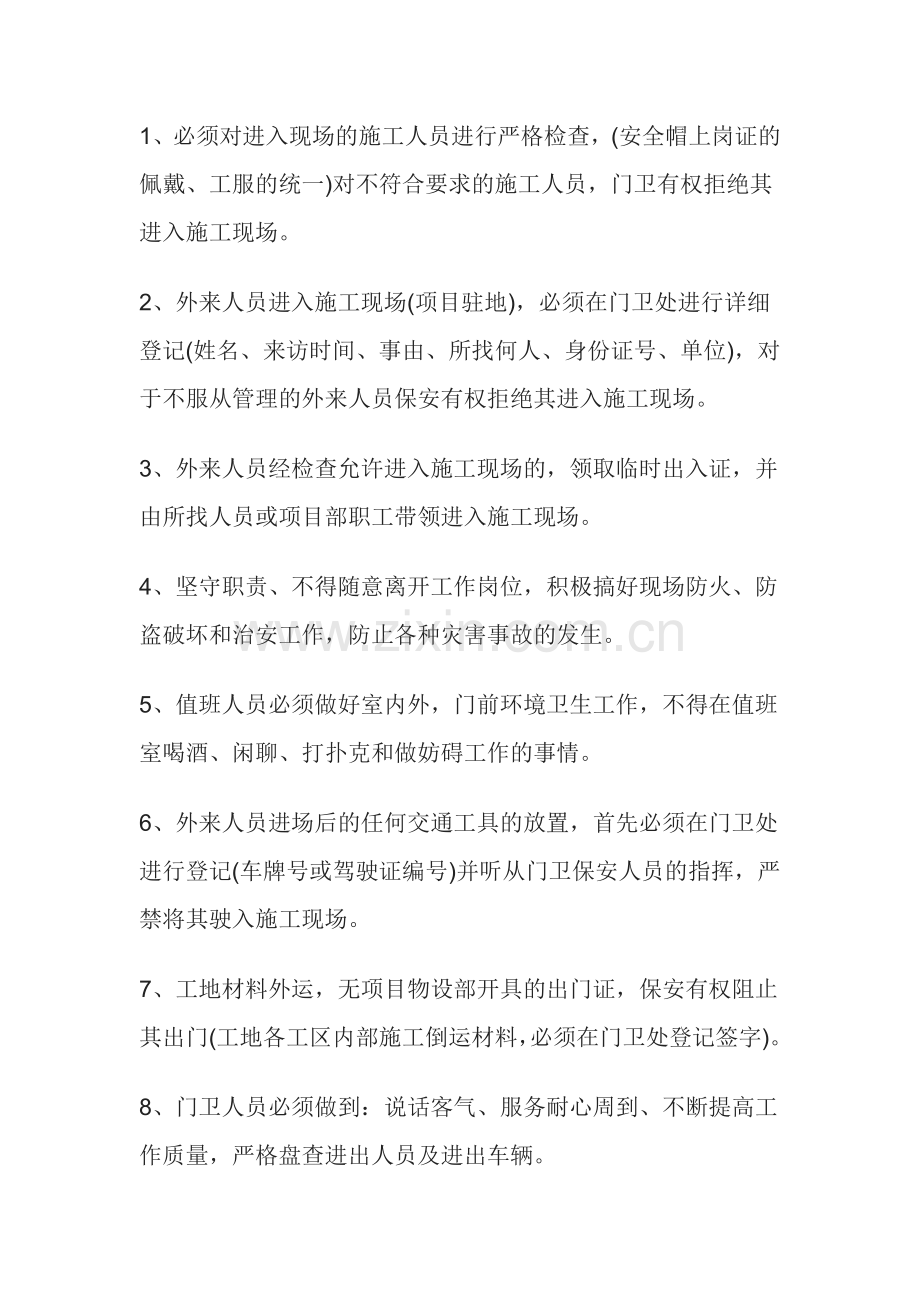 1、必须对进入现场的施工人员进行严格检查,(安全帽上岗证的佩戴、工服的统一)对不符合要求的施工人员,门卫有权拒绝其进入施工现场。