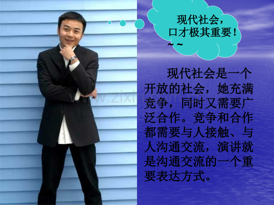 关于关于演讲稿演讲稿的写作的写作现代社会是一个现代社会是一个开放的社会,她充满开放的社会,她充满竞争,同时又需要广竞争,同时又需要广泛合作。竞争和合作泛合作。竞争和合作都需要与人接触、与都需要与人接触、与人沟通交流,演讲就人沟通交流,演讲就是沟通交流的一个重是沟通交流的一个重要表达方式。要表达方式。现代社会,现代社会,口才极其重要!口才极其重要!美国中学生流行的口号:美国中学生流行的口号:未来的美国,让不会演讲的人走开!未来的美国,让不会演讲的人走开!20012001年年年年7 7月月月月1313日,是全中国沸腾的日子。因为那日,是全中国沸腾的日子。因为那日,是全中国沸腾的日子。因为那日,是全中国沸腾的日子。因为那天,赴莫斯科的中国申奥大使杨澜等人,在中国申奥天,赴莫斯科的中国申奥大使杨澜等人,在中国申奥天,赴莫斯科的中国申奥大使杨澜等人,在中国申奥天,赴莫斯科的中国申奥大使杨澜等人,在中国申奥的最关键时刻,以精彩的演说,感动了评委、震动了的最关键时刻,以精彩的演说,感动了评委、震动了的最关键时刻,以精彩的演说,感动了评委、震动了的最关键时刻,以精彩的演说,感动了评委、震动了世界,最终,中国获得了北京奥运会的主办权。世界,最终,中国获得了北京奥运会的主办权。世界,最终,中国获得了北京奥运会的主办权。世界,最终,中国获得了北京奥运会的主办权。北京申奥成功北京申奥成功 还有中国加入还有中国加入WTO、中国对外谈判、中国对外谈判、国家领导人出访发言等等,都需要有精国家领导人出访发言等等,都需要有精彩的演讲。彩的演讲。出色的演讲能沁人心脾、慑人魂魄,从出色的演讲能沁人心脾、慑人魂魄,从而使你的思想主张深入人心,使你的呼唤化而使你的思想主张深入人心,使你的呼唤化为他人的行动的力量。因此,演讲的魅力和为他人的行动的力量。因此,演讲的魅力和力量是无穷的。力量是无穷的。竞选班委竞选班委竞选院、系学生会竞选院、系学生会 竞选高校里五花八门的社团、协会竞选高校里五花八门的社团、协会 竞聘勤工俭学岗位竞聘勤工俭学岗位求职竞聘岗位求职竞聘岗位竞聘领导岗位竞聘领导岗位 能就适当的话题作即席讲话和有准备能就适当的话题作即席讲话和有准备的主题演讲,有自己的观点,有一定说服的主题演讲,有自己的观点,有一定说服力。力。语文课程标准中要求我们:语文课程标准中要求我们:演讲演讲演讲演讲,生活中,我们常常需要在某生活中,我们常常需要在某一特定的、正式的场合,面对听众把自一特定的、正式的场合,面对听众把自己对某一问题或事件的看法较为系统全己对某一问题或事件的看法较为系统全面地说出来,这就是演讲。面地说出来,这就是演讲。演讲的要素演讲的要素1.独特的题目独特的题目2.新颖的开场新颖的开场3.饱满的内容饱满的内容4.有力的结尾有力的结尾5.适当的激情适当的激情6.演示的技巧演示的技巧 演讲稿,是为演讲准备的文演讲稿,是为演讲准备的文稿或演讲内容的记录,是一种直稿或演讲内容的记录,是一种直接面对听众,凭借口头表达,进接面对听众,凭借口头表达,进行宣传、教育、鼓动或是思想交行宣传、教育、鼓动或是思想交流的一种论说性文章。流的一种论说性文章。演讲稿的格式演讲稿的格式标题标题正文正文结尾结尾开头开头主体主体结尾结尾漂漂亮亮、简简洁洁具具有有吸吸引引力力具具有有强强烈烈感感染染力力逻逻辑辑感感、说说服服力力明明晰晰有有力力耐耐人人寻寻味味引引人人联联想想与与思思索索。又名引又名引言,开言,开场白。场白。主写主写“呼语呼语”和和“开开篇篇”又名收束。又名收束。内容的小结内容的小结或提出希望或提出希望演讲稿写作的基本要求演讲稿写作的基本要求1 1、观点要正确鲜明。、观点要正确鲜明。2 2、材料要丰富、具体、典型、生动,适合、材料要丰富、具体、典型、生动,适合特定的演讲氛围。特定的演讲氛围。3 3、结构完整,思路清晰。、结构完整,思路清晰。A A、开头要抓住人心。、开头要抓住人心。B B、主体部分要层次分明,具有逻辑性。、主体部分要层次分明,具有逻辑性。C C、结尾部分创旨深远,留下余味。、结尾部分创旨深远,留下余味。4 4、语言要、语言要“上口入耳上口入耳”“”“生动感人生动感人”。总之,演讲稿的写作不同于一般文学作品的写总之,演讲稿的写作不同于一般文学作品的写作,也不同于一般格式的标准化的公文,十分重视作,也不同于一般格式的标准化的公文,十分重视语言的表现力。语言的表现力。1 1、政治演讲稿。、政治演讲稿。包括竞选演说、就职演说、述职演说、政治动包括竞选演说、就职演说、述职演说、政治动员、开(闭)幕词、祝酒辞等。员、开(闭)幕词、祝酒辞等。、学术演讲稿。、学术演讲稿。包括科研报告、学术讲座等。包括科研报告、学术讲座等。、社会生活问题演讲稿。、社会生活问题演讲稿。包括演讲赛、巡回报告等。包括演讲赛、巡回报告等。、教学演讲稿。、教学演讲稿。教师用的有开场白、收束语、介绍作家作品以教师用的有开场白、收束语、介绍作家作品以及进行思想教育的讲稿;学生用的有读书报及进行思想教育的讲稿;学生用的有