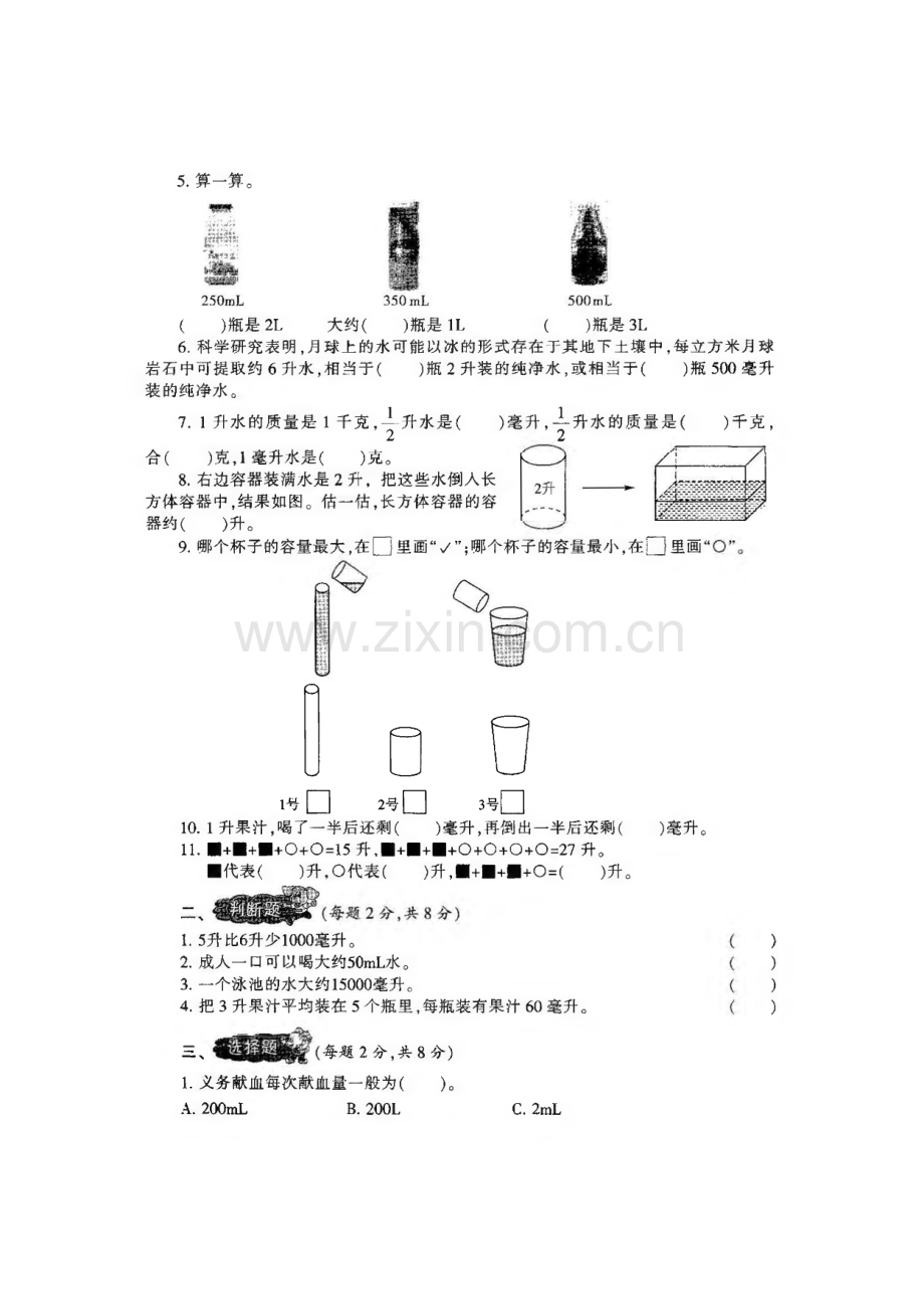 小学生数学报数学学习能力检测卷(最新修订版)苏教版四年级(上)第一单元使用(本卷总分120分,共4页,建议完成时间90分钟)班级 姓名 学号 得分(每空1分,共38分)1.在括号里填上合适的容量单位。一个杯子能盛水 一瓶果粒橙的净含量650()是 1500()2.在括号里填上合适的数。1升=()毫升 5000毫升=()升2L=()mL 4 升二()毫升 UL=()mL 63000 毫升=()升3.在 O 里填或“二”。6800毫升O 6升 1001毫升O 999升2升O2900毫升 17升O17 00毫升一个热水器能盛水的容量是80()7000毫升=()升()毫升=6升7升30毫升=()毫升30毫升O3050毫升5000毫升。5升4.下面的容器容量大约是多少?在合适的答案下面画热水瓶20毫升 200毫升 2升1毫升 10毫升 50毫升感冒药冰箱1800毫升 18升 180升5.算一算。()瓶是2L 大约()瓶是1L()瓶是3L6.科学研究表明,月球上的水可能以冰的形式存在于其地下土壤中,每立方米月球 岩石中可提取约6升水,相当于()瓶2升装的纯净水,或相当于()瓶50。毫升 装的纯净水。7.1升水的质量是1千克,工升水是()毫升,升水的质量是()千克,2 2合()克,1毫升水是()克。8.右边容器装满水是2升,把这些水倒入长 方体容器中,结果如图。估一估,长方体容器的容 器约()升。9.哪个杯子的容量最大,在里画“J;哪个杯子的容量最小,在口里画10.1升果汁,喝了一半后还剩()毫升,再倒出一半后还剩(11.+0+0=15 升,+0+0+0+0=27 升。代表()升,。代表()升,+。=()升。)毫升。1.5升比6升少1000毫升。2.成人一 口可以喝大约50mL水。3.一个泳池的水大约15000毫升。4.把3升果汁平均装在5个瓶里,每瓶装有果汁60毫升。三、(每题2分,共8分)1.义务献血每次献血量一般为()。A.200mL B.200L C.2mL)2.下面容器中,()的容量比1升小。A.电饭锅 B.电冰箱 C.一次性纸杯3.一瓶180毫升的口服溶液的用量是“口服每次510毫升”。按照这样的用量,这瓶 口服溶液最少可以喝()次,最多可以喝()次。A.18 B.20 C.364.小明喝一杯牛奶,第一次喝了一半后,加满水;第二次又喝了一半后,又加满水,最后全部喝完。他喝的牛奶与水比较,()。A.牛奶多 B.水多 C.一样多四、(共 1。分)1.下面容器的容量正好是1升,在下图中分别标出表示升、上升和3升的刻度线。2 3 4A日花露水瓶5毫升.水桶900毫升o眼药瓶150毫升1,Mj洗发水瓶蒙小15升五、(每题6分,共36分)1.一位重症病人手术时需要输血2000毫升,一位义务献血者每次的献血量为200 毫升。照这样计算,几位这样的志愿者献的血够这位病人使用?2.小军和他的4个好朋友每人喝2杯果汁,每杯果汁200毫升,他们一共喝了多少升果汁?3.妈妈买了 15瓶600毫升装的饮料,每瓶12元。(1)妈妈一共花了多少元?(2)妈 妈一共买了多少升饮料?4.某超市搞饮料促销,小瓶净含量500毫升,每瓶售价3元;大瓶净含量3升,每瓶 12元。小红买哪种更合算?5.已知一瓶药的用法用量如右图,这瓶药够一名 成人服用3天吗?包装200mL/瓶用法用量口服,每日3次。成人用量每次25mL。6.下图中大圆球所占的容量是多少毫升?六、每题10分,共20分)1.从一个水壶向量杯里倒水,每次都倒满。若倒4次,则多200毫升;若倒5次,则少3。0 毫升c这个水壶的容量是多少毫升?2.一水池有一根进水管和一根出水管,进水管每分钟流量是6 L,出水管每分钟流量 是5LO只打开进水管25分钟放满水池,如果只打开出水管几分钟可将满池水放完?参考答案第一单元答案一、I.毫升.考升升;2.1000.5.7.2000.4000,6000/1000.63,7030:3.=;4.2 升.10 主升.180 升;5.8.36 6.312;7.500.05 500/;&6;9.().500.250;II.1,6,9。二、1./;3.X;4.X。三、I.A;2.C;3.A,C;4.Co四.噜五、I.10;2 2;3.(I)180.(2)9;4.大瓶:5.不够;6.8六、1.2200mL;2.30小学生数学报数学学习能力检测卷(最新修订版)苏教版四年级(上)第二单元使用(本卷总分120分,共4页,建议完成时间60分钟)班级 姓名 学号 得分一、填空题(每空1分,共20分)1.59X81积是()位数;79018商是()位数。254 26的商的最高位是(),试商时可以把26看作()来试商,这时商可能会偏()o2.49)403,当口内填()时,商的末尾有0;5口3 54,要使商是两位 数,口里最小填()o3.笔算除法试商时,商5小了,改商(),商5大了,改商()o4.0+24=11,最大是(),O最小是()o5.周长是16分米的正方形,如果它的边长乘2,那么它的周长是()分 米,面积是()平方分米。6.在O里填上或“二”。300 9 240320 24 110+30X60(210+30)X69604-44-4 0 9604-16 150-95+50 150-(95+5)7.140人乘坐40座的大客车去参观,至少需要()辆这样的大客车。8.小红有73枚1元硬币,把这些硬币换成10元一张的纸币,最多能换()张。9.小明在计算除法时,把除数30误写成3,结果得到商是60,正确的商是()o二、选择题(每题2分,共8分)1.除法试商时,如果余数正好和除数相等,商需要()oA.加1 B.减1 C.不变2.560+4+6的结果与()算式的得数不相等。A.560+3+8 B.560 9 24 C.560 9 103.食堂买了 40箱西红柿,如果每箱西红柿的价钱降到原来的一半,那么原来买40箱西红柿的钱现在可以买(A.40 B.60 C.80)箱。D.无法确定4.A+B=53,如果把A和B同时扩大10倍,那么A+B的商是口,余数是口,正确答案是()0A.5,3 B.5,30二、计算题(共36分)1.口算。(10 分)420+7=48X5=600+60 二99 33=5604-80=500+25 二C.50,3 D.500,3070+900=8104-(20+70)=904-16=70+5+5=2.竖式计算。(14分,加题要求验算)7564-21=996+63=530 86=8004-70=3.用递等式计算下面各题。(12分)480-80H-20 38+42X5 96-16X15 480+(24+36)四、解决问题(共36分)1.工厂包装480瓶墨水,一共装了 8箱,每箱装10盒,每盒装多少瓶?(用 两种方法解答)(8分)2.四年级的238名同学和9位老师去参观科技馆,每辆客车最多坐45人,租5辆这样的客车够坐吗?(4分)3.如上图,小明从家到学
