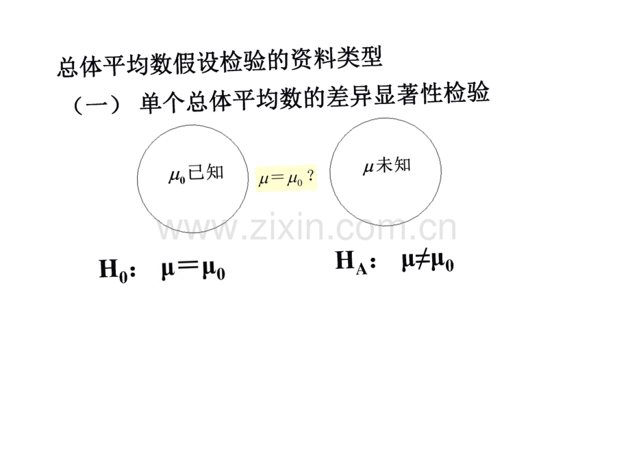 五、对单个和两个总体平均数的假设检验总体平均数假设检验的资料类型(-)单个总体平均数的假设检验(二)两个总体平均数的假设检验(三)多个总体平均数的假设检验总体平均数假设检验的资料类型(一)单个总体平均数的差异显著性检验Ha:阿Ho:(-)单个总体平均数的差异显著性检验例题:某药厂生产一种药丸,若丸重XN(9,0.25),现新购进一台制丸机,为检验该机工 作是否正常,从产品中随机抽取100丸,称得=9.1克,若。=0.5,问该机工作是否正常。对单个总体均数的检验,就是对某个未 知的总体平均数与某个特定的值 进 行比较,检验它们是否相等。(二)两个总体平均数的假设检验N向2例两种饲料的增重实验结果如下:甲一665,6.35,7.05,7.90,8.04,4.45乙一534,7.00,9.89,7.05,6.74,9.28,且方 差相等,试检验两者的影响有无显著 的差异?(三)多个总体平均数的假设检验饲料增重(Kg)123457 37 54 42 6013 39 41 33 1913 15 13 29 2018 24 38 22 13分析不同饲料对增重的影响有无显著的差异?5对单个和两个总体平均数的假设检验5.1对单个总体平均数的假设检验为进行这个检验,需从该总体抽取一个随 机样本。在检验时,有两种不同的情况,即该总体的方差已知和未知,针对这两种 情况有不同的检验方法。Z检验(正态总体方差已知时应用)t检验(正态总体方差未知时应用)某药厂生产一种药丸,若丸重xN(9,0.25),现新购进一台制丸机,为检验该机工 作是否正常,从产品中随机抽取100丸,称得=9.1克,若。=0.5,问该机工作是否正常。H():N=No=9 Ha:井|ox /J。9.1 9o S=2%/Viooa=0.05 U 005=1.96 Pv0.05该机工作不正常a=0.01,Uoi=2.58,P 0.01,该机工作正常5.1 对单个总体平均数的假设检验5.1.1 Z检验(总体方差已知时应用)步骤:1)提出假设:q)Ho:=O 与 Ha,)与 a4:ua b)Z u2a o4)对假设进行统计推断:a)Z ua时接受a,否则接受Ho,单侧检验与双侧检验B)Z 2a时接幼4,否贝U接面0,。)220时接受“4,否贝接切0 o5.1 对单个总体平均数的假设检验5.1.2 t检验(正态总体方差未知时应用)步骤:1)提出假设:。)“0:=0 与 H A:,B)Ho:=Mo与 Ha:(从o,c)H():=O 与 Ha A0 o5.1 对单个总体平均数的假设检验5.1.2 t检验(正态总体方差未知时应用)步骤:1)提出假设:2)构造并计算检验统计量:t=x-R=x。/(九)分布Sx S2 n 自由度df=n-l Degree of freedomt分布(t-distribution)曲线特征关于t=0对称n趋近8时,t(n-l)-N(0,1)t值受df=n-l影响Fig.83 Comparative shapes of the distributions r(6 N(0,1).值(临界值,分位数)(critical value)尸“ta(df)=a自由度一定时df=9单侧ta=双侧12cl双侧ta 单侧ta5.1.2 t检验(正态总体方差未知时应用)步骤:3)确定小概率、临界值及否定域:否定域为d)t t a t 12a。4)对假设进行统,推断:一a)tta(df)时接受a,否则接受“o,b)t 12a)时接受孙,否则接受/o单侧检验肾双侧检验 京套/接受-_12a t at a例按照规定,罐头番茄汁中的平均维生 素C含量不得少于21mg/100g,现在从工 厂的产品中抽取17个罐头,测得维生素 C含量(mg/100g)记录如下:16、25、21、20、23、21、19、15、13、23、17、20、29、18、22、16、22,设维生素C含 量(mg/100g)服从正态分布,问这批罐 头是否符合规定要求。解:依题意,可对此批罐头的平均维生素c含量提出待检验假设:Hq:/=21 与 H:1,746,不能否定零假设,即该批罐头的平均维生素C含量与规定的 不得少于21mg/100g无显著差异,这批罐 头可以出厂。例已知成年马血液中白细胞总数Po=8 103个/mm3,今随机抽测了 10匹马的白细胞总数分别 为:7.1,10.8,7.5,7.8,9.2,9.4,8.5,8.9,7.6,8.4(个 试检验该样本均数与总体均数有无差异。Ho:n=N o Ha:Ro%=2*=8.52n-以0=8.52-8.0=149 力二-1二10-1二9Sr 0.35x-Lin 852 8.0 f=1.49S 0.35 X4=1=101=9“o.O5(9)=2.262 t%=%第1组 甲乙甲甲乙第2组 乙甲乙乙甲5.2两个正态总体平均数的假设检验(成组资料)1-2用又1-又2估计。5.2.1 统计量Xi-X2的抽样分布(X-又2)=1-2=Var(X1-X2)=A1-A2cr,二 时,bj=cr2(1A 1-A 2+夕2+2),2两总体服从正态分布时,-x2也服从正态分布。X 一 聚2 N(1-2,*又1_*),=Var(X1-X2)=A 1A 2),22 2或cr2X-X.J.4+2(X 丫2)(1 一2)N(O,1)。bxx?JL1)可能方差已知;2)可能方差相等、数值 未知;3)也可能方差不等、数值未知。5.2两个正态总体平均数的假设检验(成组资 料):Z检验(两正态总体方差已知时应用)步骤:1)提出假设:=2 与 8A,)为:1=2 与“A:1 2。2)构造并计算检验统计量:(1 又2)一(1 一2)X1-X)Z=1 2 N(O,1)。b XX2D X-X?3)确定小概率、临界值及否定域:单侧检验与双侧检验受翳/接缚Xi-aX否定限/0.5a u a否定域为u2a u aa)Z ua b)Z 2a。4)对假设进行统计推断:0)|2|4。时接受“4,否则接受“0,2a时接受心,否贝”接受即,c)Z20时接受“A,否则接受久)。例某单位测定了 31头犊牛和48头成年母牛 100ml血液中血糖的含量(mg),得犊牛 的平均血糖含量为8123,成年母牛的平均 血糖含量为7023。设已知犊牛的血糖的总 体方差为15642,成年母牛的血糖的总 体方差为12.072。问犊牛和成年母牛间 血糖含量有无差异?解:由于两个总体方差和已知,故可以用Z测验的方法进行检验。L依题意可假设:=2与 Ha:1。2.计算检号统计量:o.oi=2.58,所以否定H 0,犊 牛和成年母牛间血液中血糖含量有极显著的差异。5.2两个正态总体平均数的比较5.2.3 t检验总体方差相等且未知样本为小样本(大样本时,检验统计量近似服从标准正 态分布)步骤:1)提出假设:b)H0:i=2 与 84:4142。2)构造并计算检验统计量:合并方差2=dj xS2+df2 xS2dfi+df2 dfx+df2 1 o n o 1 o=xSf+xS。+2 2+2 222sX+21 sX-2s1-22sX2-2+1X+21sX21-2-+1X-2计算时(1)S=:(i i )=ss1,(n2-1)2=X(%2 j-X 2)2=SS ISS1+SS2、=。n 1+2 22,(1一)o zss+lss zx-lx(【一)Cx-【x 乙 ss+【ssu u【+【)l-uizss+