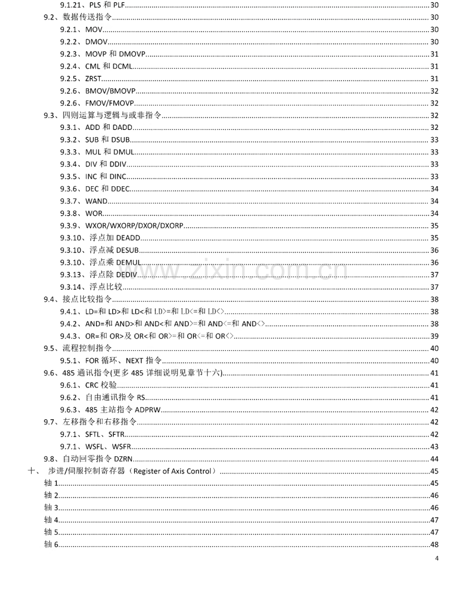 亿轴自动化售前电话/微信13113186871PLC_ETH_NEC_NLM系列PLC控制器用户手册V4.4 Manual of PLC_NEC_NLM V4.4联系电话(Wechat):13113186871联系邮箱(E-mail):亿轴自动化售前电话/微信13113186871目录一、硬件资源.8二、硬件连接.92.1、通用输入接线方式.92.2、通用输出10接线方式.102.3、轴通道接线方式.112.4、编码器接线方式(支持追剪及飞剪型号可用).112.5、编程口及程序下载方式.122.6、10扩展方式.132.7、轴扩展方式.142.8、触摸屏连接方式.162.8.1、海为(HaiWell)触摸屏串口配置.172.8.2、昆仑通泰(MCGS)触摸屏串口配置.182.8.3、昆仑通泰(MCGS)触摸屏网口配置.202.8.4、威纶通(Weinview)触摸屏串口配置.22三、辅助继电器M、状态继电器S.233.1、辅助继电器M:.233.2、状态继电器S:.23四、数据寄存器D、变址寄存器V、Z.234.1、数据寄存器D:.234.2、变址寄存器V、Z:.23五、定时器T.23六、计数器C.25七、输入X.25八、输出Y.25九、支持指令一览.269.1、基本指令.269.1.1、LD.269.1.2、LDI.269.1.3、LDP、LDF.269.1.5、AND.269.1.6、ANI.279.1.7、ANDP.279.1.8、ANDF.279.1.10,OR.279.1.11 ORI.289.1.12 ORP.289.1.13、ORF.289.1.15、ANB.289.1.16 ORB.299.1.17、INV.299.1.18、MPS 和 MRD、MPP.299.1.19、OUT.299.1.20、SET 和 RST.303亿轴自动化 售前电话/微信131131868719.1.21、PLS 和 PLF.309.2、数据传送指令.309.2.1、MOV.309.2.2、DMOV.309.2.3、MOVP 和 DMOVP.319.2.4、CML 和 DCML.319.2.5、ZRST.319.2.6、BMOV/BMOVP.329.2.6、FMOV/FMOVP.329.3、四则运算与逻辑与或非指令.329.3.1、ADD 和 DADD.329.3.2、SUB 和 DSUB.339.3.3、MUL 和 DMUL.339.3.4、DIV 和 DDIV.339.3.5、INC 和 DINC.339.3.6、DEC 和 DDEC.349.3.7、WAND.349.3.8、WOR.349.3.9、WXOR/WXORP/DXOR/DXORP.359.3.10、浮点加 DEADD.359.3.10、浮点减 DESUB.369.3.10、浮点乘 DEMUL.369.3.13、浮点除 DEDIV.379.3.14、浮点比较.379.4、接点比较指令.389.4.1、1)=和 LD和 LD和 1)=和 LD和 AND=1 AND及 OR和 0=和 OR X0触发电机移动到0位置,X1触发电机移动到10000.55十二、电子齿轮/凸轮用特殊寄存器说明(可选项).5612.1、寄存器说明.5612.2、电子凸轮运动的例程.6312.3.凸轮表在线修改及下载例程.64十三、网口 Modbus 通讯协议说明.6613.1、读线圈(读M变量),0X01.6613.2、写线圈(写 M 变量),0X05.6713.3、读寄存器(读D变量),0 x03.6813.4、写寄存器(写D寄存器),0 x06.70十四、模拟量采集.71十五、模拟量输出.71十六、485通讯(支持485通讯方式可用).7216.1、485从站模式.7216.2、485自由通讯.7316.3、485主站模式.76十七、PWM输出.79十八、探针捕获(GAS系列支持).79十九、直线/圆弧插补(D系列支持).8019.1 插补相关寄存器:.8019.2 直线插补例程:.8219.3 圆弧插补例程(XY+半径):.8419.4圆弧/整圆插补例程(XY+圆心):.86二十、G代码(E系列支持).88二H 一、Dxf轨迹导入(E系列支持).88二十二、机械安装尺寸.91二十三、常见问题解答.921、程序下载不了?.922、触摸屏连不上?.933、零位10怎么读取的?.934、梯形图编程和触摸屏连接时选那个PLC协议.935、D7802目标位置的单位是什么?.935亿轴自动化售前电话/微信131131868716、回零怎么回零?.947、相对定位和绝对定位过程中怎么停止?.948、如何判断电机定位完成?.949、是否支持变址?.9410、如何修改PLC的IP地址?.9411、如何修改PLC的端口号?.9412、不支持指令快速定位排查方法.956亿轴自动化售前电话/微信13113186871OTOV模拟量输入/输出/5V正交编码器各一路轴14轴15Home9 U;Home10 kCrj Homel l 端 Home12 j r Home13 fe Home14 3 Home15 I L Home16Homel Home2Home33 Home4Home5Home6日 Home7 日 Home812 3 蜘 的 脚 M o t i o nC M P 1+C M P r P W M 1+P W M r D G N D aquti J G N DA-N 1X0X1X2X3X4X5X6X7 比ee.u J15售前电话/微信13113186871亿轴自动化2.8、触摸屏连接方式触摸屏接口波特率固定为9600X3X4X5X6X7GND RX TX 012345 J X8X9X1X1X1X1X1X124V24V TXD RXD GND说明:24V和GND给触摸屏供电,TXD和RXD为232串口,跟触摸屏对应交叉连接16售前电话/微信13113186871亿轴自动化2.8.1、海为(HaiWell)触摸屏串口配置设备信息com参数采集通信设备信息设备名称三菱 FX3U_3GA_1设备描述设备类型三菱 FX3U/3GA设备信息ra gfij采窠通信设备站号COM参数COJ 靠口COM31通讯类型通讯协议RS-232 7波特率9600 7奇偶校蛉Even v流控制None vMC2E 数据位8 v停止位HZ 三17亿轴自动化 售前电话/微信131131868712.8.2、昆仑通泰(MCGS)触摸屏串口配置例程链接:https:/pan.baidu.eom/s/llzXf8Vj93teA-_dWhEctdQ 提取码:6666心Mc gsPr。组态环境-设窗窗口:设备窗口文件但 编辑 查看M 插入 TM(t)窗口改)帮助回通用品匚设备,1性球 PLC控制器这基本属性|CN1(DB9下载口)口波特率是19200 真屏专用口波特率是9600设备属性名设备属性值设备名称/通用串口父设备。设备注释/通用串口父设备初始工作状态/1-启动最小采集周期(心/1000串口端口号0-皿1根据实 七择通讯波特率.8-19200数据位位数0-7位 固定停止位位数0 T位数据校验方式2-偶校验固定检查(K)确认(Y)取消(C)帮助(H)18亿轴自动化售前电话/微信13113186871设备属性名设备属性值采集优化1代化设备名称设备0设备注释三菱一FX系列编程口初始工作状态1-启动最小采集周期Gs)100设备地址0通讯等待时间200快速采集次数CP竣型4-FX3UCPU字符串编码0-ASCII字符串解码顺序1-12通讯间隔时间0|19亿轴自动化售前电话/微信131131868712.8.3、昆仑通泰(MCGS)触摸屏网口配置例程链接:https:/pan.baidu.eom/s/llzXf8Vj93teA-_dWhEctdQ 提取码:6666gMc gs Pro组态环境-设备窗口:设售窗二文件但编辑包(V)插入包工具窗口侬普助回 副Bj甚庵胞|。罔则创倒20亿轴自动化售前电话/微信13113186871设备属性名设备属性值采集优化1 女化