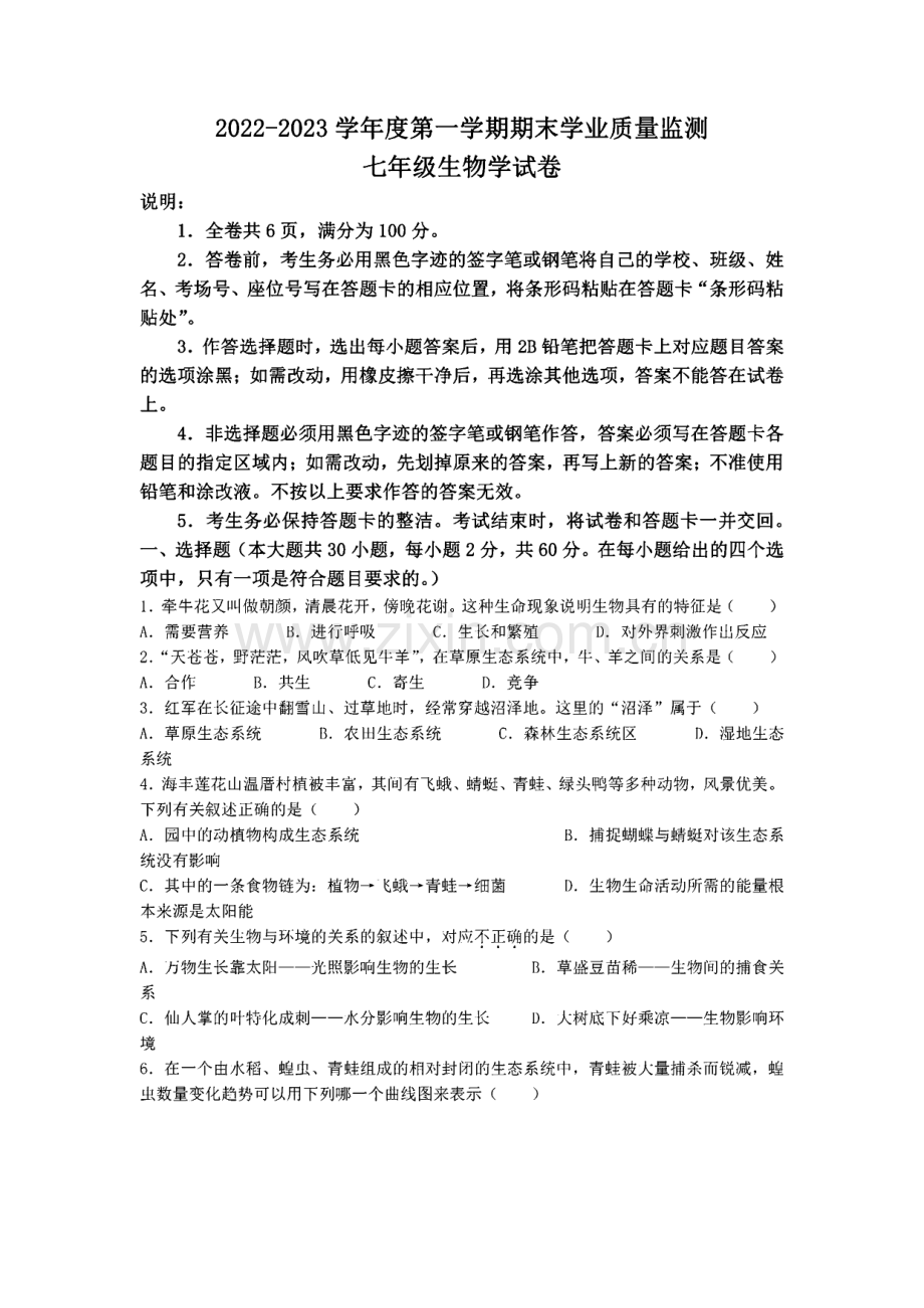 2022-2023学年度第一学期期末学业质量监测 七年级生物学试卷说明:1.全卷共6页,满分为100分。2.答卷前,考生务必用黑色字迹的签字笔或钢笔将自己的学校、班级、姓 名、考场号、座位号写在答题卡的相应位置,将条形码粘贴在答题卡“条形码粘 贴处”。3.作答选择题时,选出每小题答案后,用2B铅笔把答题卡上对应题目答案 的选项涂黑;如需改动,用橡皮擦干净后,再选涂其他选项,答案不能答在试卷 04.非选择题必须用黑色字迹的签字笔或钢笔作答,答案必须写在答题卡各 题目的指定区域内;如需改动,先划掉原来的答案,再写上新的答案;不准使用 铅笔和涂改液。不按以上要求作答的答案无效。5.考生务必保持答题卡的整洁。考试结束时,将试卷和答题卡一并交回。一、选择题(本大题共30小题,每小题2分,共60分。在每小题给出的四个选 项中,只有一项是符合题目要求的。)1.牵牛花又叫做朝颜,清晨花开,傍晚花谢。这种生命现象说明生物具有的特征是()A.需要营养 B.进行呼吸 C.生长和繁殖 D.对外界刺激作出反应2.“天苍苍,野茫茫,风吹草低见牛羊”,在草原生态系统中,牛、羊之间的关系是()A.合作 B.共生 C.寄生 D.竞争3.红军在长征途中翻雪山、过草地时,经常穿越沼泽地。这里的“沼泽”属于()A.草原生态系统 B.农田生态系统 C.森林生态系统区 D.湿地生态系统4.海丰莲花山温厝村植被丰富,其间有飞蛾、蜻蜓、青蛙、绿头鸭等多种动物,风景优美。下列有关叙述正确的是()A.园中的动植物构成生态系统 B.捕捉蝴蝶与蜻蜓对该生态系统没有影响C.其中的一条食物链为:植物一飞蛾一青蛙一细菌 D.生物生命活动所需的能量根本来源是太阳能5.下列有关生物与环境的关系的叙述中,对应不正醺的是()A.万物生长靠太阳一一光照影响生物的生长 B.草盛豆苗稀一一生物间的捕食关系C.仙人掌的叶特化成刺一一水分影响生物的生长 D.大树底下好乘凉一一生物影响环境6.在一个由水稻、蝗虫、青蛙组成的相对封闭的生态系统中,青蛙被大量捕杀而锐减,蝗 虫数量变化趋势可以用下列哪一个曲线图来表示()蝗虫数量 蝗虫数量 A蝗虫数量 4蝗虫数量A.0 时间 B,时间 C.0 时间 D,0 时间7.使用显微镜时出现的问题与解决的办法搭配不用醺的是()A.镜筒下降时一一眼睛注视物镜 B.视野较暗一一选用凹面镜C.物像偏上方一一向下移动玻片 D.物像太小一一换高倍目镜8.杜鹃花和杜鹃鸟细胞相比,杜鹃花特有的结构是()细胞壁细胞膜细胞质叶绿体细胞核液泡A.B.C.D.9.构成人体结构和功能的基本单位是()A.器官 B.原子 C.细胞 D.分子10.芦荟为百合科多年生常绿草本植物,具有防晒、祛痘等美容功能。其叶大而肥厚,下列说法不正触的是()A.构成叶片的几种组织是细胞分化形成的B.细胞分化后,细胞的形态、结构和功能也发生变化C.叶片的肥厚与细胞生长、分裂和分化有关D.叶片肥厚只需细胞生长使体积增大就可实现11.植物的根尖细胞和动物细胞分别含有的能量转换器是()A.线粒体、线粒体 B.叶绿体、线粒体C.线粒体和叶绿体、线粒体 D.线粒体、叶绿体和线粒体12.苔葬植物和蕨类植物只适于生活在阴暗潮湿的环境中,原因是()A.这两类植物没有真正的根 B.这两类植物体内没有输导组织C.这两类植物生殖都离不开水 D.这两类植物长得较矮小13.下图阴影部分表示四种植物的共同特征是()A.都有种子 B.种子中有胚乳 C.种子有果皮包被 D.体内无输导组织 14.下列诗句中的植物与其它三种不属于同一类群的是()A.溪莺喧午寝,山蕨止春饥 B.墙角数枝梅,凌寒独自开C.苔痕上阶绿,草色入帘青 D.西湖春色归,春水绿于染15.下列关于藻类植物与人类的关系,无去的选项是()A.提供饵料 B.监测空气 C.制造氧气 D.作为食物16.肾蕨盆栽可点缀书桌、茶几和阳台,其叶片可作切花、插瓶的陪衬材料,下列有关说法 不巧融的是()A.肾蕨依靠抱子繁殖 B.盆栽肾蕨时可放在背阴处,适当多浇水C.肾蕨叶片中有输导组织 D.肾蕨有茎和叶的分化,根为假根17.下列选项中属于我国特有的珍稀植物是()A.国槐 B.侧柏 C.水杉 D.油松18.水稻是中国居民的主要粮食作物,栽培时适时施肥有利于水稻的生长。这说明植物生长 需要()A.一定的水分 B.适宜的温度 C.维生素 D.无机盐19.下图为两种被子植物种子结构的模式图。下列相关叙述正确的是()果种 和皮A.甲、乙的营养物质都储存在中 B.甲为双子叶植物的种子C.乙萌发时,最先突破种皮的是 D.共同构成新植物的幼体甲乙20.根尖是幼根生长最快的部位,下列有关下图根尖区说法正确的是()A.表皮细胞向外突出形成根毛增加吸收面积 B.内部某些细胞形成导管具有运输作用 C.细胞很小并通过分裂产生新细胞 D.是根吸收水和无机盐的主要部位21.据资料记载,世界上最高的树是澳洲杏仁校树,高达150多米。澳洲杏仁校树虽然长得 很高,但根吸收的水分仍能被源源不断的运输到树顶端,其主要的动力来自于()A.光合作用 B.蒸腾作用 C.呼吸作用 D.吸收作用22.如图所示,某植物的叶片仅乙区域为绿色。兴趣小组的学生以此为实验材料,探究光 合作用的场所,结果如图所示。下列叙述不正碉的是()A.实验前应对该植物进行暗处理 B.操作前需对叶片进行脱色处理C.碘液染色后,只有乙处变蓝 D.实验说明叶肉细胞是光合作用的场所23.早春时节,海棠叶片还没有完全长出,却可以开出娇艳的花朵。请推测这些花瓣中有机 物的主要来源()A.花