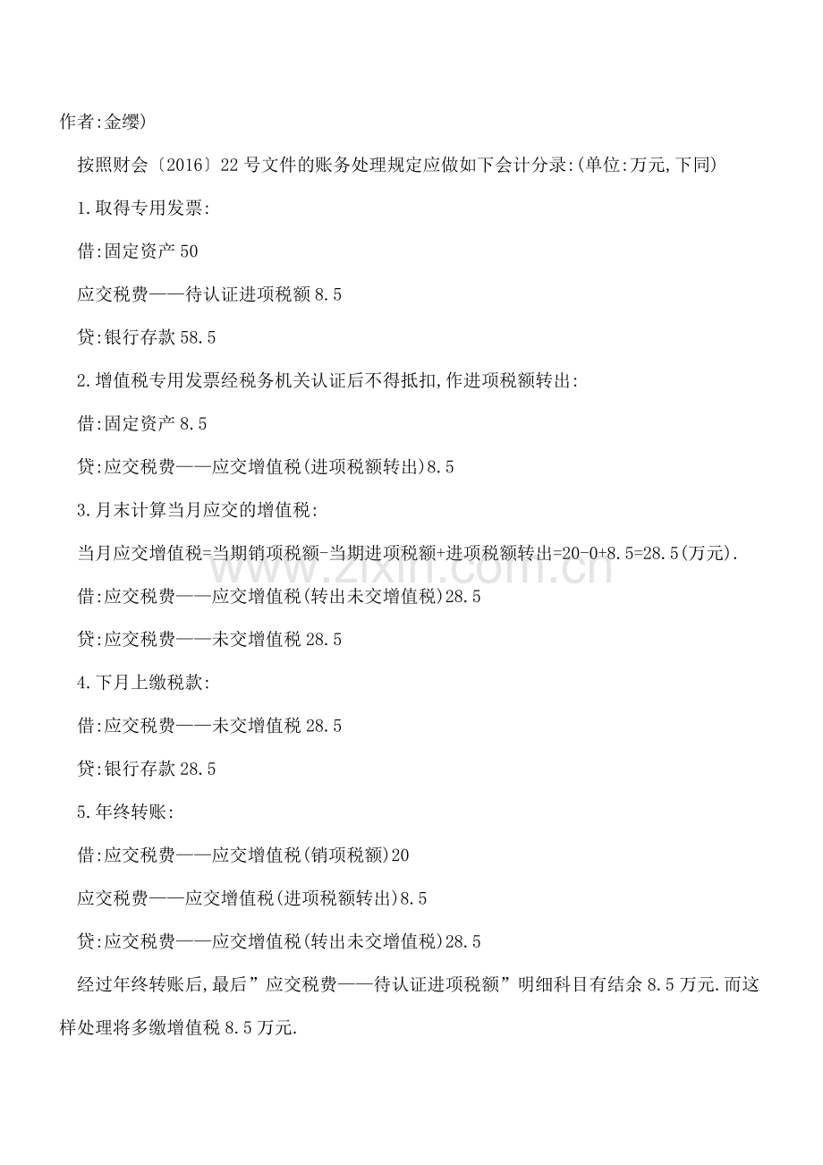 经过年终转账后,最后”应交税费——待认证进项税额”明细科目有结余8.5万元.而这样处理将多缴增值税8.5万元.