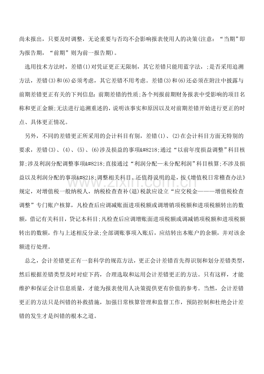 选用技术方法时,差错(1)对凭证更正无限制,其它差错只能用蓝字法,;是否采用追溯方法,差错(3)和(6)必须考虑,其它差错不用考虑。差错(3)和(6)还必须在附注中披露与前期差错更正有关的下列信息:前期差错的性质;各个列报前期财务报表中受影响的项目名称和更正金额;无法进行追溯重述的,说明该事实和原因以及对前期差错开始进行更正的时点、具体更正情况。