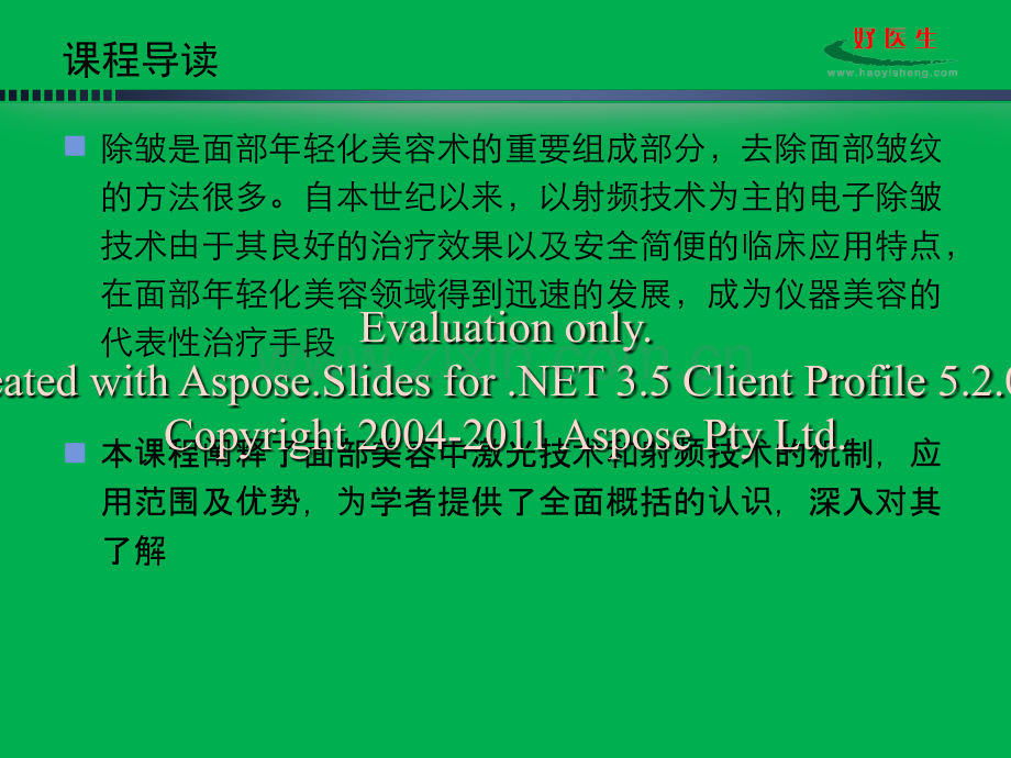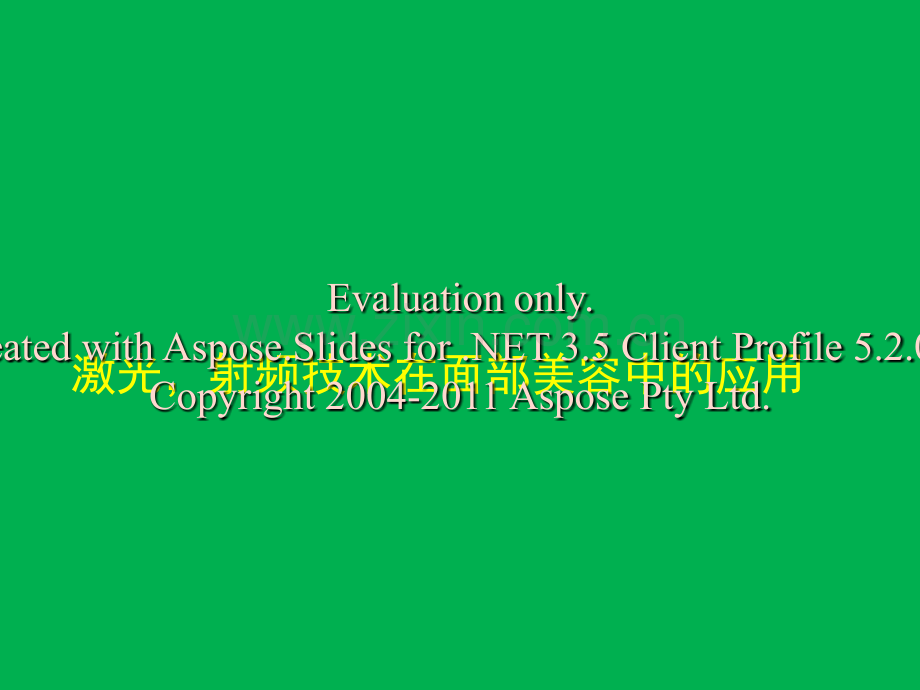 激光,射频技术在面部美容中的应用Evaluationonly.CreatedwithAspose.Slidesfor.NET3.5ClientProfile5.2.0.0.Copyright2004-2011AsposePtyLtd.课程导读n除皱是面部年轻化美容术的重要组成部分,去除面部皱纹的方法很多。自本世纪以来,以射频技术为主的电子除皱技术由于其良好的治疗效果以及安全简便的临床应用特点,在面部年轻化美容领域得到迅速的发展,成为仪器美容的代表性治疗手段 n本课程阐释了面部美容中激光技术和射频技术的机制,应用范围及优势,为学者提供了全面概括的认识,深入对其了解Evaluationonly.CreatedwithAspose.Slidesfor.NET3.5ClientProfile5.2.0.0.Copyright2004-2011AsposePtyLtd.激光及射频技术Evaluationonly.CreatedwithAspose.Slidesfor.NET3.5ClientProfile5.2.0.0.Copyright2004-2011AsposePtyLtd.激光技术(Laser)Evaluationonly.CreatedwithAspose.Slidesfor.NET3.5ClientProfile5.2.0.0.Copyright2004-2011AsposePtyLtd.激光促进皮肤更新的两个机制1.真皮胶原再生、重塑A.热能作用于真皮浅层诱发自然损伤修复机制注意:过深可造成真皮不可逆瘢痕1AHEAT1BB.损伤修复机制刺激新胶原增生及真皮重建1CC.胶原增生是一个渐进过程,通常需数周时间,高峰在3-6月Evaluationonly.CreatedwithAspose.Slidesfor.NET3.5ClientProfile5.2.0.0.Copyright2004-2011AsposePtyLtd.2.气化消除不平整的表皮层Epidermis is vaporizedHeat in Epidermis气化造成靶组织即刻收缩30%以上表皮磨削Evaluationonly.CreatedwithAspose.Slidesfor.NET3.5ClientProfile5.2.0.0.Copyright2004-2011AsposePtyLtd.单一波长的相干光光斑形态及其大小不因距组织距离而改变均匀一致的组织效应激光光束特性Evaluationonly.CreatedwithAspose.Slidesfor.NET3.5ClientProfile5.2.0.0.Copyright2004-2011AsposePtyLtd.气态:CO2激光液态:脉冲染料激光585nm、595nm固态:Nd:YAG激光1064nm、1320nmEr:YAG激光1540nm半导体激光940nm、1450nm按发光介质分类连续、准连续、脉冲按输出模式分类Evaluationonly.CreatedwithAspose.Slidesfor.NET3.5ClientProfile5.2.0.0.Copyright2004-2011AsposePtyLtd.选择性光热作用理论 根据不同组织的生物学特性,只要选择合适的激光参数(波长、脉冲持续时间、能量),就可以保证最有效治疗病变部位的同时,对周围正常组织的损伤最小 Evaluationonly.CreatedwithAspose.Slidesfor.NET3.5ClientProfile5.2.0.0.Copyright2004-2011AsposePtyLtd.CO2 Laser(微创)Evaluationonly.CreatedwithAspose.Slidesfor.NET3.5ClientProfile5.2.0.0.Copyright2004-2011AsposePtyLtd.CO2 Resurfacing出血少损伤小手术时间短无需止血无需缝合去除细小皱纹优点:Evaluationonly.CreatedwithAspose.Slidesfor.NET3.5ClientProfile5.2.0.0.Copyright2004-2011AsposePtyLtd.无创激光 波长较长,组织穿透性较弱 脉宽长,使组织缓慢持续升温 大多配备冷却装置,保护表皮不受损伤Nd:YAG激光1064nm1320nm半导体激光940nm1540nm染料激光585nm595nm特点Evaluationonly.CreatedwithAspose.Slidesfor.NET3.5ClientProfile5.2.0.0.Copyright2004-2011AsposePtyLtd.UltraPulse CO2 LASER患者皮肤质地有明显改善,表现为肤质较前光泽细腻、皮肤紧缩、皱纹减少、毛孔缩小但很快发现术后患者局部并发色素沉着的几率很高 无焦化手术系统Evaluationonly.CreatedwithAspose.Slidesfor.NET3.5ClientProfile5.2.0.0.Copyright2004-2011AsposePtyLtd.光损害皮肤超脉冲激光治疗术后皮肤胶原新生明显Evaluationonly.CreatedwithAspose.Slidesfor.NET3.5ClientProfile5.2.0.0.Copyright2004-2011AsposePtyLtd.CoolTouch波长1320nm的固体Nd:YAG带有DCD(动态冷却装置)激光的热效应促使胶原蛋白再生,新的胶原蛋白有序排列,数量增多,从而增加皮肤弹性通过TQ10冷却组件可有效保护表皮不受损伤,从而达到无损伤除皱嫩肤的效果系统独有的热传感装置可有效感应皮肤温度以进行安全治疗Evaluationonly.CreatedwithAspose.Slidesfor.NET3.5ClientProfile5.2.0.0.Copyright2004-2011AsposePtyLtd.MCL 30 Dermablate波长2940nm的Er:YAG激光 患者术后炎症反应和色素沉着更轻,恢复更快,因此较适合于黄种人的皮肤铒激光穿透组织深度较浅,对周围组织的热损伤小,其止血效果较差对于较深的皱纹铒激光的疗效可能不及CO2激光术后并发症有所减少,但仍没有解决术中痛苦、术后色沉及误工问题 Evaluationonly.CreatedwithAspose.Slidesfor.NET3.5ClientProfile5.2.0.0.Copyright2004-2011AsposePtyLtd.Nlite波长585nm的脉冲染料激光治疗过程中没有切割、烧灼或刺痛的感觉,也不需要表面麻醉术后基本无副作用、无色素沉着或色素减退适合于所有类型皮肤的治疗Evaluationonly.CreatedwithAspose.Slidesfor.NET3.5ClientProfile5.2.0.0.Copyright2004-2011AsposePtyLtd.SmoothBeam 波长1450nm的半导体激光DCD专利技术冷却和保护表皮选择性加热真皮浅层的胶原蛋白多选择、快速治疗,4mm6mm光斑操作过程轻松简便Evaluationonly.CreatedwithAspose.Slidesfor.NET3.5ClientProfile5.2.0.0.Copyright2004-2011AsposePtyLtd.一个激光的光斑由多个微米级的子光斑组成,确保每次激光照射时只有部分皮肤受到激光的作用,未受激光作用的皮肤可以协助皮肤的迅速的恢复,这种输出的方式称为像束激光 微细激光像束皮肤年轻化技术微细激光像束皮肤年轻化技术(FractionalLaserSkinResurfacingTechnology)Evaluationonly.CreatedwithAspose.Slidesfor.NET3.5ClientProfile5.2.0.0.Copyright2004-2011AsposePtyLtd.Pixel2940nmforFractionalAblativeSkinRejuvenationEvaluationonly.CreatedwithAspose.Slidesfor.NET3.5ClientProfile5.2.0.0.Copyright2004-2011AsposePtyLtd.24mJ/50um13mJ/50umPixelEvaluationonly.CreatedwithAspose.Slidesfor.NET3.5ClientProfile5.2.0.0.Copyright2004-2011AsposePtyLtd.n导读:n像束激光就是目前最为先进、最为流行的美容项目,受到了广大爱美人士的强烈支持。像束激光是由以色列飞顿医疗机构所研