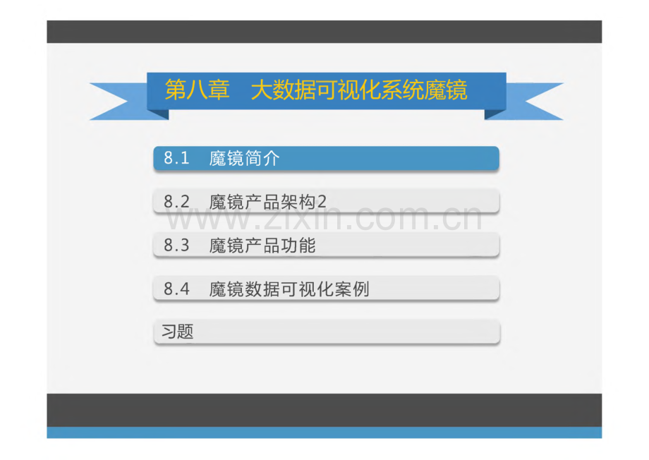 大数据可视化第八章大数据可视化系统魔镜8.1 魔镜简介8.2 魔镜产品架构8.3 魔吃品功能8.4 魔镜数据可视化案例习题8.1魔镜简介第八章大数据可视化系统魔镜1.魔镜介绍魔镜是一套完整的解决方案,用来将客户现有的数据进行有效 的整合和分析,快速准确的提供可视化结果并提出决策依据,帮助客 户做出明智的经营管理和决策分析。通过大数据魔镜,企业积累的各种 来自内部和外部的数据,比如网站数据、销售数据、ERP数据、财务数 据、大数据、社会化数据、各种数据库等,都可进行整合、探索、挖掘、分享和控制。8.1魔镜简介第八章大数据可视化系统魔镜2.魔镜特点交付周期短计算速度快简单易用数据安全可靠第八章大数据可视化系统魔镜8.JL 魔镜简介8.2魔镜产品架构83魔镜产品功8.4魔镜数据可视化案例习题8.2魔镜产品架构第八章大数据可视化系统魔镜敏捷开放API 共享和协作智能数据探索视觉探索分析仪表盘故事演示模式自助BI平台列存储/内存模型自助数据准备敏捷建模(虚拟CUBE自动更新数据提取数据沉淀(高频翔g流式/实时源数据连接管理载库加据模/数建立系未建关1直接查询 将业务用户生成的模型推广到记录系统图中左侧部分为数据的整合部分,包含内外部数据源的接入,结构化与半结构话数据的解析,也可以支持传统数据仓库构建的OLAP立方体模型。图中中间部分架构把数据与业务分离,在魔镜平台构建用户数据分析的立方体模型,达到大数据量实时分析。魔镜平台支持对热门分析数据进行缓存,更好的达到亿级 数据秒级响应。针对缓存的数据,魔镜提供自动数据更新服务,避免数据的滞后和不一致。图中右侧部分为数据的分析与展示模块,提供了数据的智能探索交互式功能,给予用户深入的可视化分析以及炫酷的可视化展示,并已共享协作的方式让团队共同参与 数据分析,达到数据价值的最大化发现。第八章大数据可视化系统魔镜8.1 魔境简8.2 魔镜产品架构8.3 魔镜产品功能8幺魔镜数据可视化案例习题8.3魔镜产品功能第八章大数据可视化系统魔镜1.多数据源连接数据源可以连接至魔镜 并转换为自助式可视化分析电子表格Excel TxT CSV传统数据库Mysql Sqlserver DB2新型数据库 Mongo DB Spark大型数据Hadoop hive应用数据电商平台微信sina大数据魔镜8.3魔镜产品功能第八章大数据可视化系统魔镜2.业务建模魔镜J0效喇:理业务对.五为n iT g日.步曲日 WS75Z 广 出/自沧区3 校 产品vM及木对厢幅m S96折KJB利闰f.iTtf.单价魔镜系统可以把各式各样的数据,通过一个统一的业务视图整理和呈现给用户,用户不需要知道数据之间复杂的关系,只需要识别出数据的含义即可。配合魔镜的 路径查找与优化引擎,可以自动生成快速高效的查询语句,完成数据的计算8.3魔镜产品功能第八章大数据可视化系统魔镜3.可视化分析拖拽模式 代码模式 路径模式iii 列:标记:颜色(9大小二 后行:匡描述 筛选:标准柱*堆枝柱状田国保存组合国显示票数 1OO主要 全部更表格Id面积图|祭柱图*气泡图标准条形图堆栈条形图标签云地图a咨饼图W线图|.?散点图树状图数字图表 仪多 更用户可以随机选择一个数据分析维度作为出发点,系统会根据底层的数据关系,为用户不断提供其他的分析视角,最适合用户不知道需要分析什么的场景,通 过系统的引导,可以发现意想不到的结果。魔镜富有丰富的动态可视化效果库,可以全方位的满足用户不同角度,不同层级的数据审视。8.3魔镜产品功能第八章大数据可视化系统魔镜4.数据挖掘魔镜J0敷据分析役的依知公共效鲤示例敷 痔核博式代码式人0要技拿的内&Q m更:某公司俏,数据源 效据公理 数据分析 数掘沱制 仪表代 设雨保存行:大小dfdfgaao n日删 O aQM*n 口号*区域“目的杳份 一目的城南*快速公司 y快H号0 IttQM*CA9H产品子发刚产金订单 1.订!123产品饼 m运成本4WMVMttE 呵双击快废投人行 丸以及办记魔镜系统可以把各式各样的数据,通过一个统一的业务视图整理和呈现给用户,用户不需要知道数据之间复杂的关系,只需要识别出数据的含义即可。配合魔镜的 路径查找与优化引擎,可以自动生成快速高效的查询语句,完成数据的计算8.3魔镜产品功能第八章大数据可视化系统魔镜4.数据挖掘摩德J0段分析DEM。应 数据源 数据开发 数据处理 数据分忻 数据挖堀 愧我的数据公共数据示例数据输入急续搜索的内容 Q电信用户画像退货单销售单会员列袤列会员 销售钿聚美数5、躇藏既级选耍K-means数据史漉权限案例惟度ABC会员度量123销售金额3表一表二栋选维度ABC城市+添加数据DEMOfiR-故梅开富K IK fit 11 BT分析-仪&a iflfl 一一一一一可视化IS果lIi.Ii.IiJ1拿脸月度WFtU温失叫等*1施数据挖掘模块提供了各式算法分析的功能列表,以及自定义分析的功能功能列 表,让没有数据挖掘专业知识的用户也能进行深入的数据挖掘工作。8.3魔镜产品功能第八章大数据可视化系统魔镜5.仪表盘500,000400,000300,000200,000丽区100,000600,000700,000 成交均价(元/nr)匚)成交面硼M2015年度苏州洋lx商办成交额对比高新区成交全装(万元)工业园区mg20,00015,00010,0005,00025,00030,00035,0002015 口k园区商办销售面枳排行 加i设置仪表盘e布月设查O&背后设置Q文字is件0囹表联动 O分享 更新站苏区魔镜仪表盘支持拖曳式自由布局,丰富的图文组建,多种配色方案,上卷下钻、筛选器、图表联动,让你的分析报告开口说话!第八章大数据可视化系