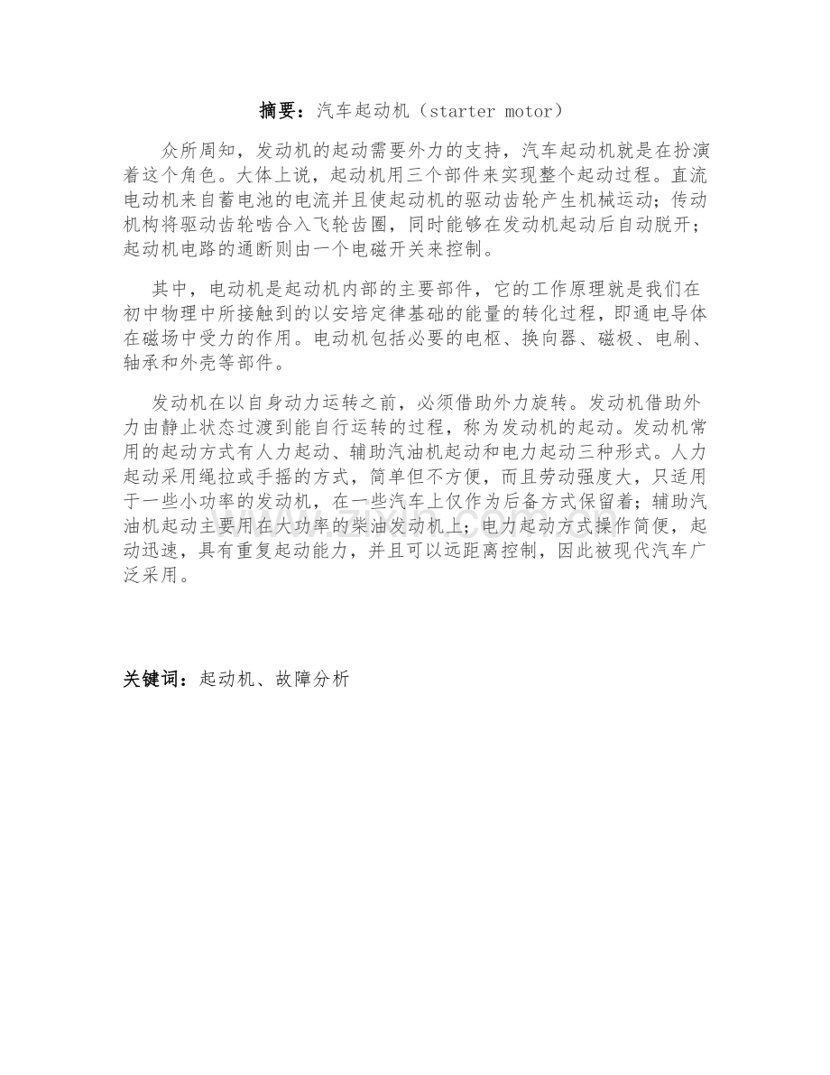 发动机常用的起动方式有人力起动、辅助汽油机起动和电力起动三种形式。人力起动采用绳拉或手摇的方式,简单但不方便,而且劳动强度大,只适用于一些小功率的发动机,在一些汽车上仅作为后备方式保留着;辅助汽油机起动主要用在大功率的柴油发动机上;电力起动方式操作简便,起动迅速,具有重复起动能力,并且可以远距离控制,因此被现代汽车广泛采用。